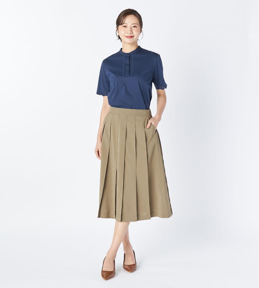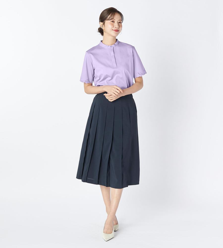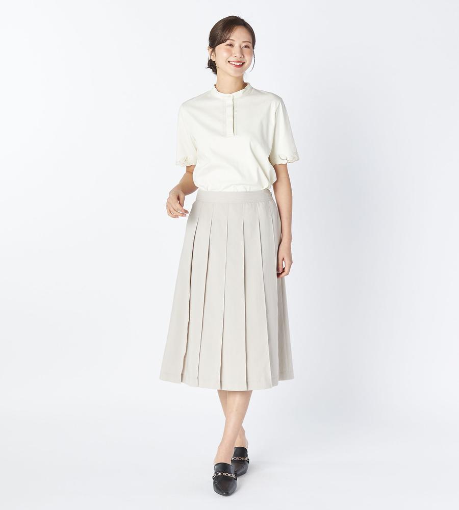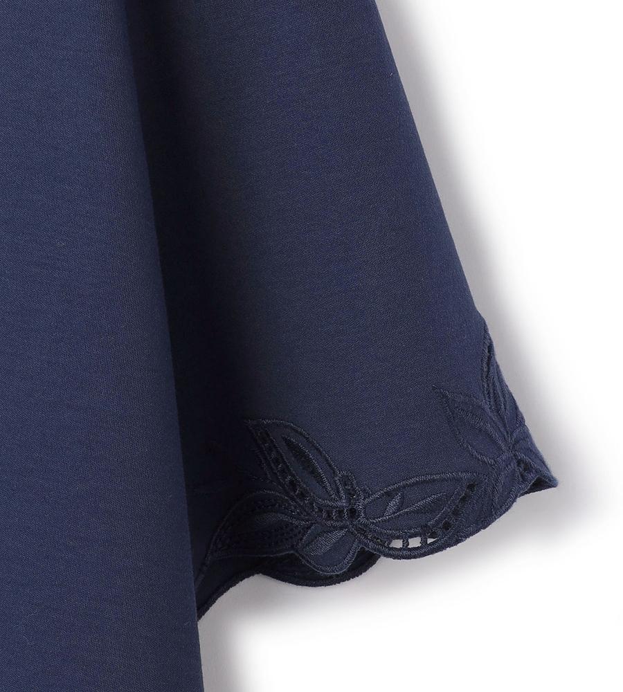 なめらかで優しい肌ざわりが心地よい、コットンスムース素材で仕上げたプルオーバーカットソーです。袖と前立ての両サイドに刺繍をあしらいフェミニンに飾りつけしました。顔まわりをすっきりと見せてくれるバンドカラーもポイント、Tシャツ感覚でラフに着られてきちんときれいめにもあわせられるアイテムです。