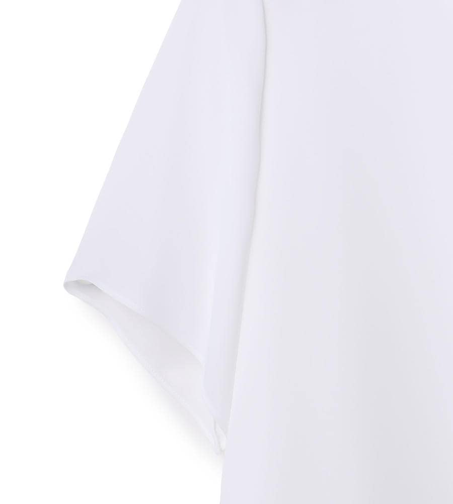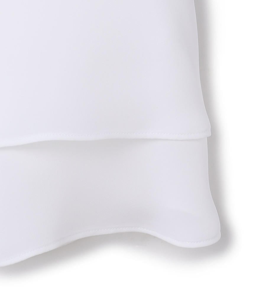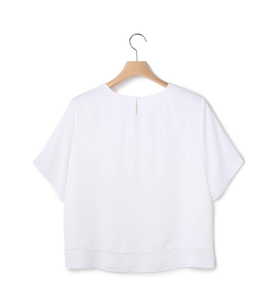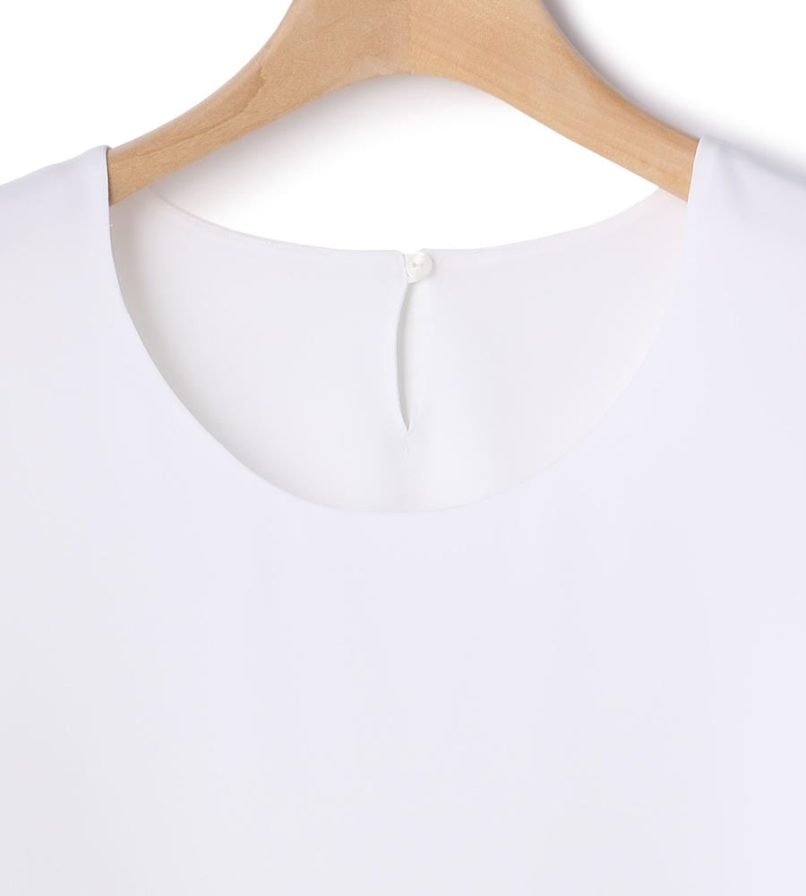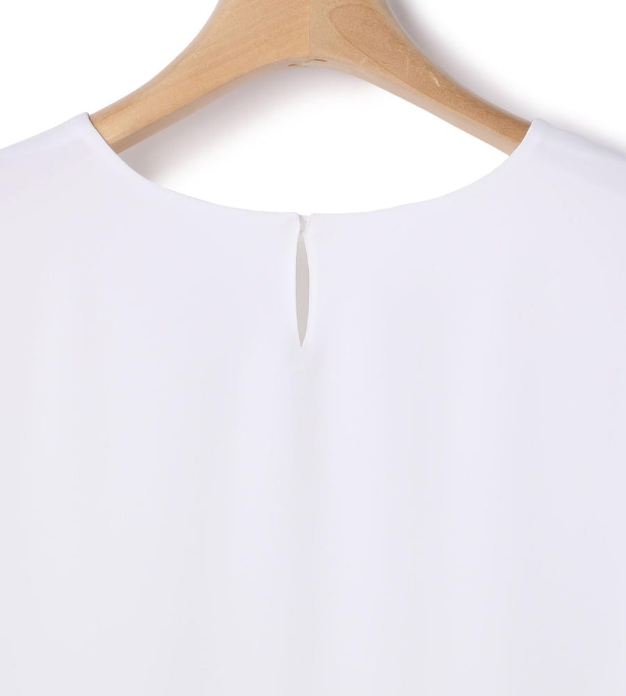 さらりとした上品な風合いのサテン生地を使用した、ふわりとした軽やかなシルエットのクルーネックブラウス。生地が重なるティアードデザインの裾がポイント。バックネック中央には涙あきを施し、さりげなく抜け感を意識しています。ミニマルなルックスで多彩なコーディネートに取り入れやすい一枚です。