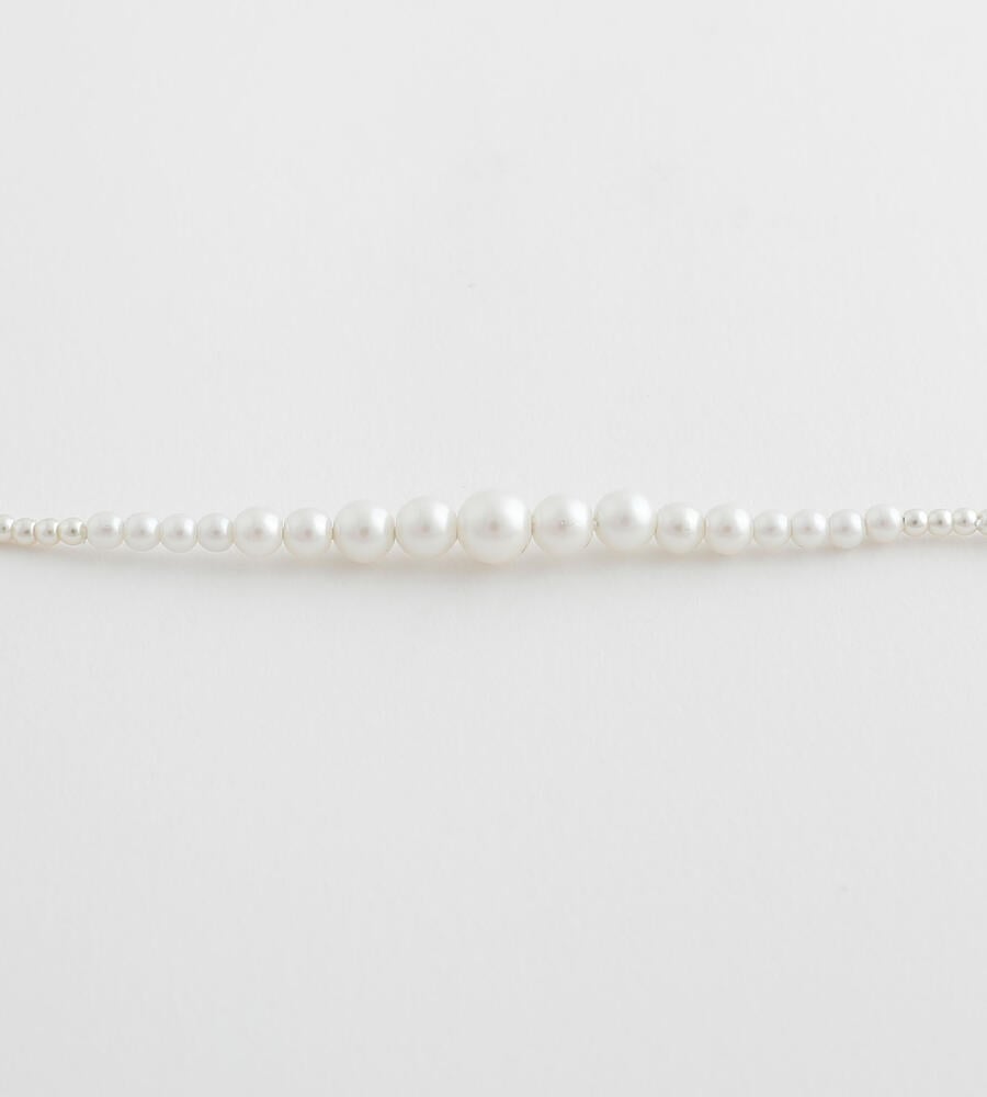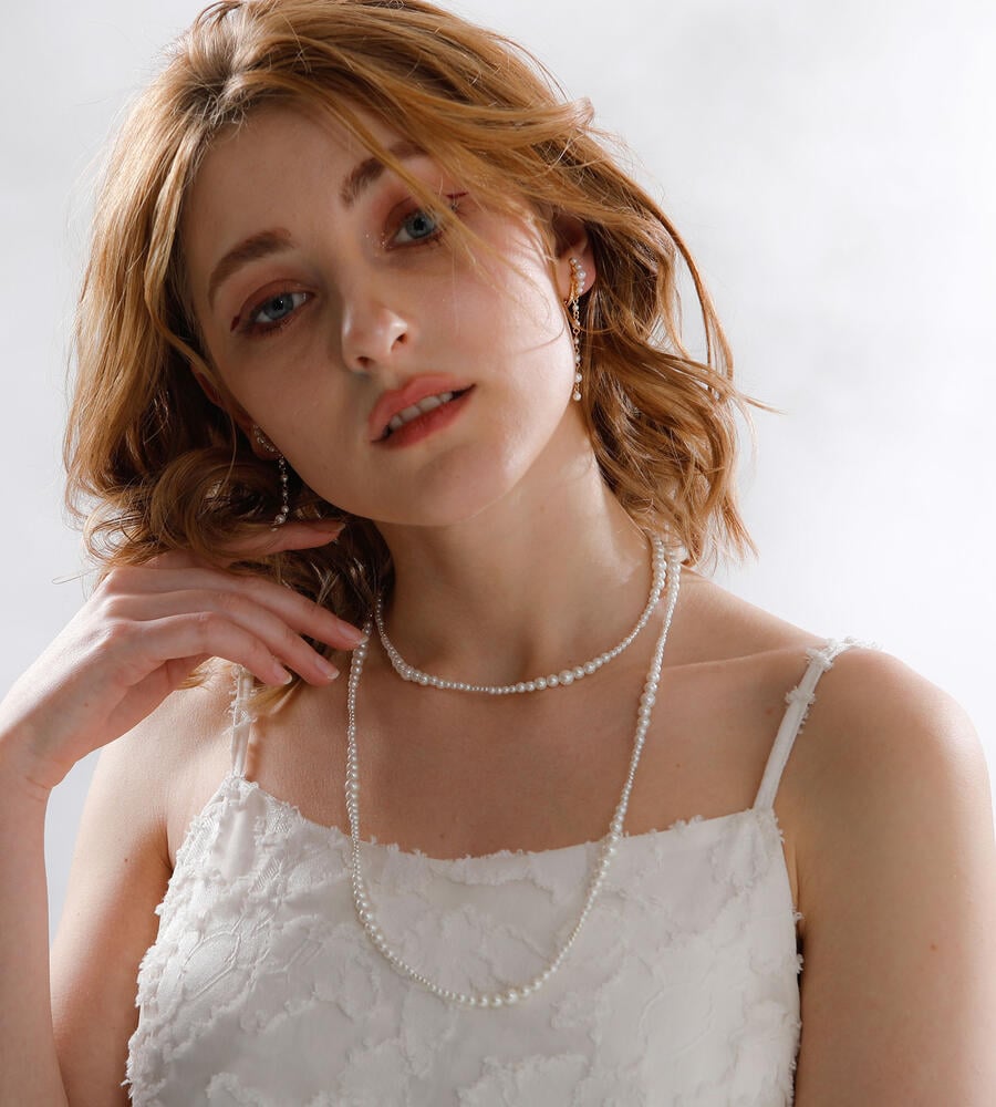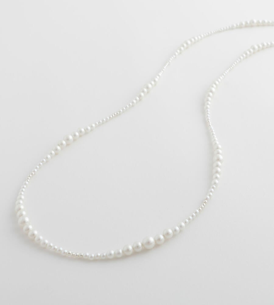 大きさの異なるパール調ビーズをグラデーションのように連ねたロングネックレス。パール調ビーズならではの柔和な色使いと光沢で、スタイリング全体をエレガントに映し出します。しっかりとした存在感のあるロングタイプは、シンプルコーデのアクセントに最適。オンオフ問わず多彩なコーデに活躍します。