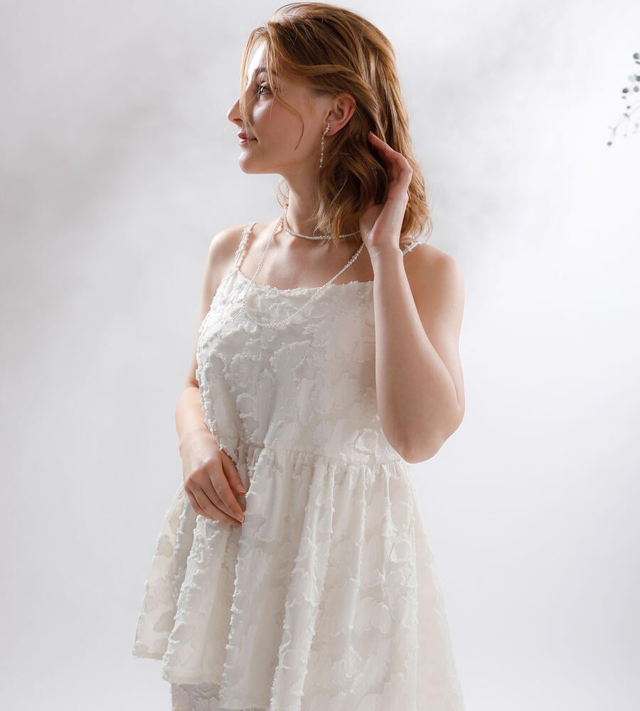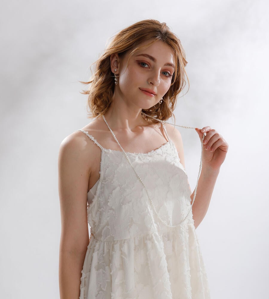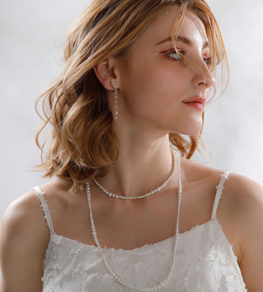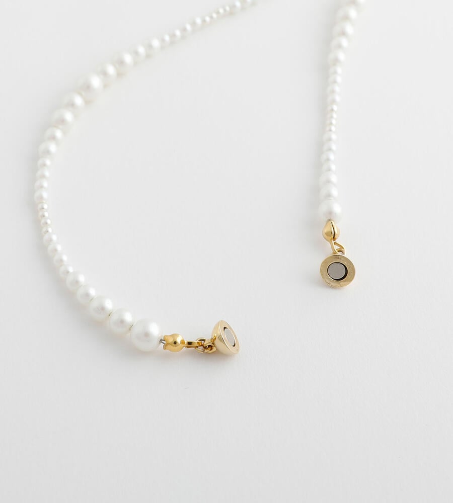 大きさの異なるパール調ビーズをグラデーションのように連ねたロングネックレス。パール調ビーズならではの柔和な色使いと光沢で、スタイリング全体をエレガントに映し出します。しっかりとした存在感のあるロングタイプは、シンプルコーデのアクセントに最適。オンオフ問わず多彩なコーデに活躍します。