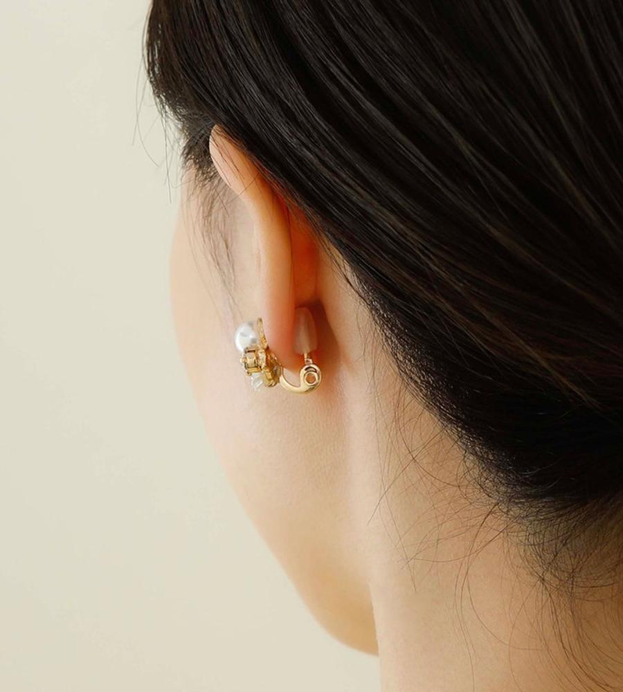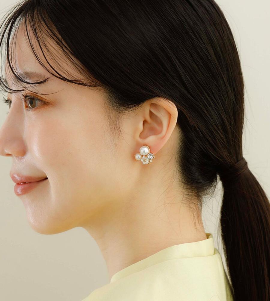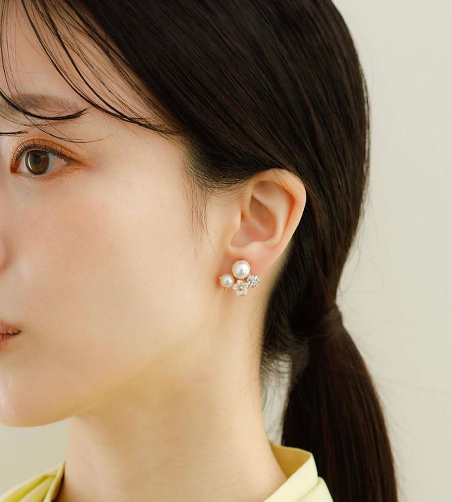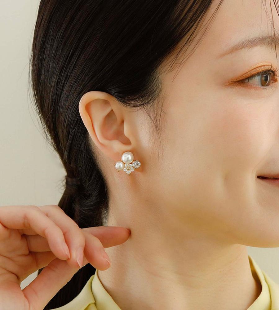 まるで耳元に小さな花畑を纏うような軽やかさ。可憐な小花に、艶やかなパールと輝くガラスストーンを添えて。上品なサイズ感ながら、ガラスストーンのきらめきが程よいアクセント。オンオフ問わず活躍する、エアフィットシリーズです。