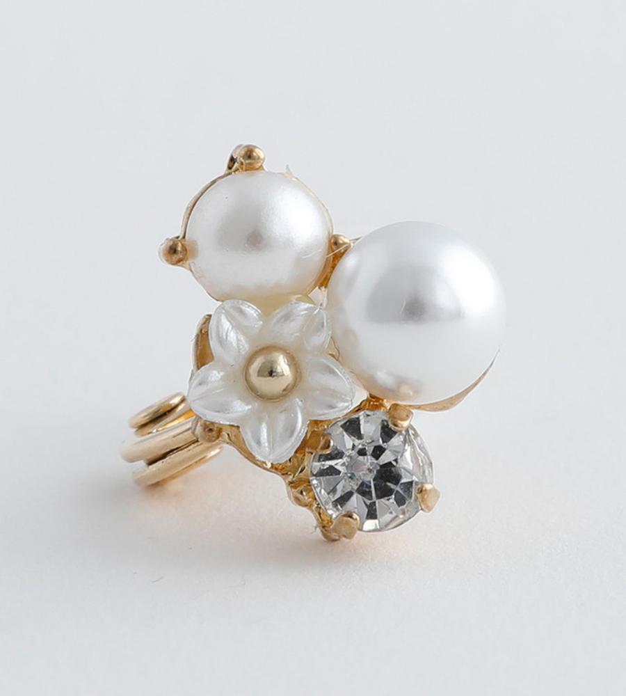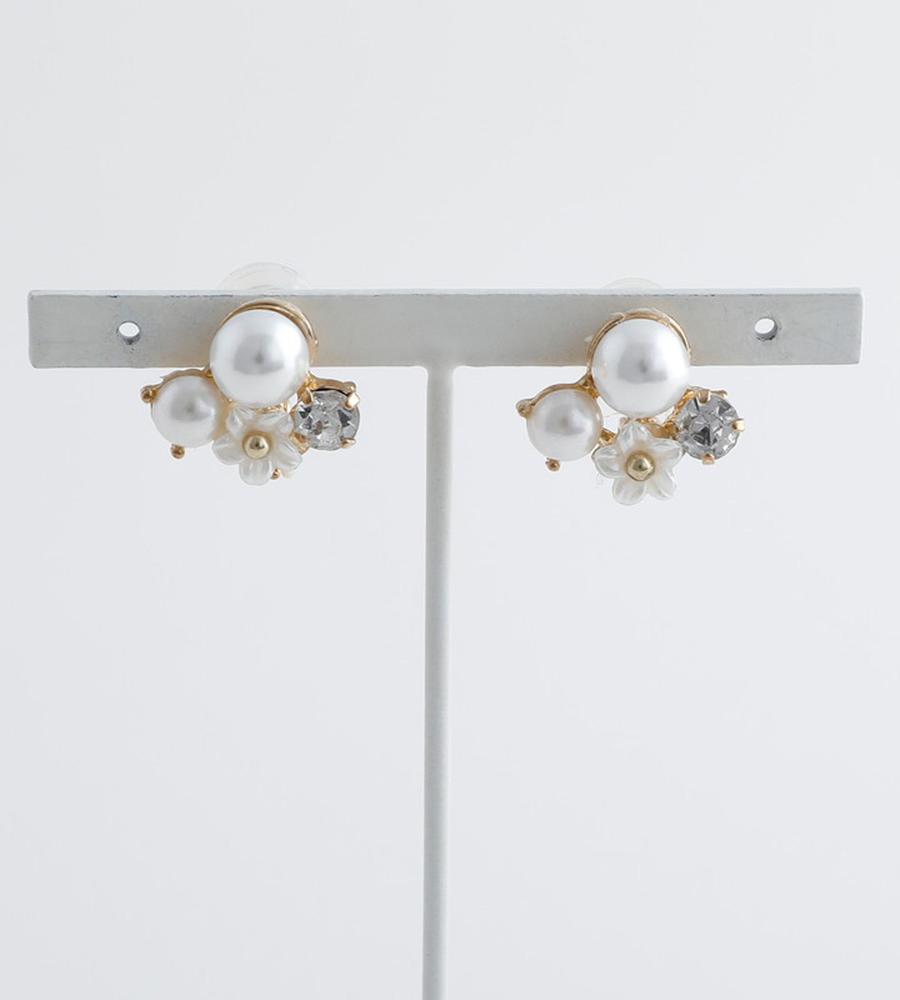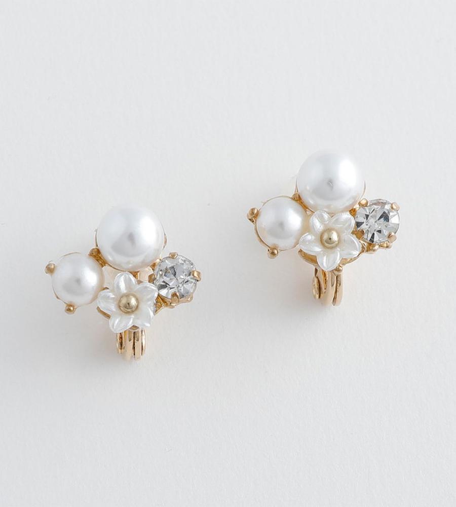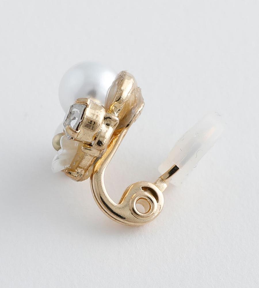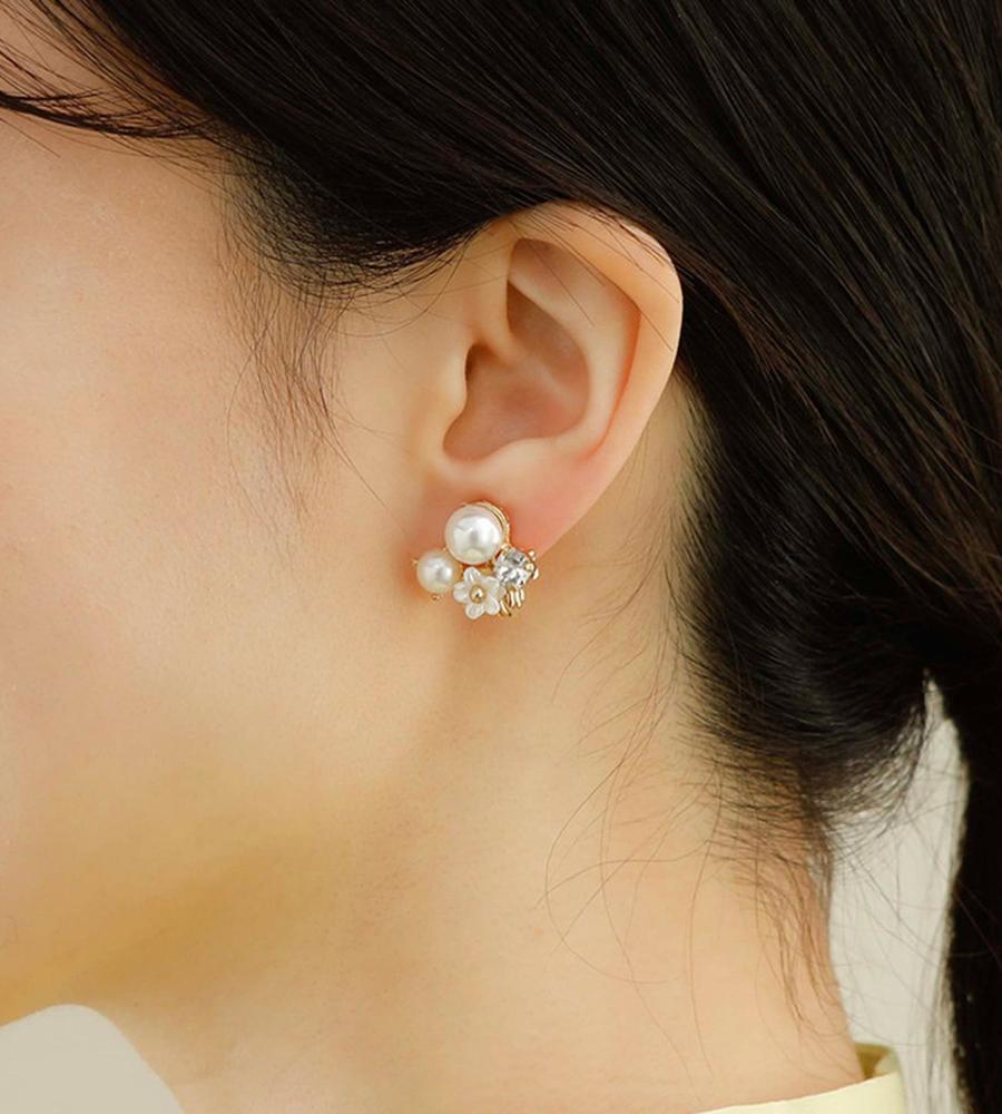まるで耳元に小さな花畑を纏うような軽やかさ。可憐な小花に、艶やかなパールと輝くガラスストーンを添えて。上品なサイズ感ながら、ガラスストーンのきらめきが程よいアクセント。オンオフ問わず活躍する、エアフィットシリーズです。