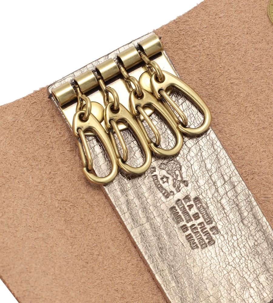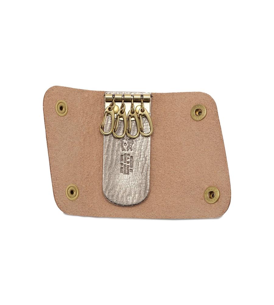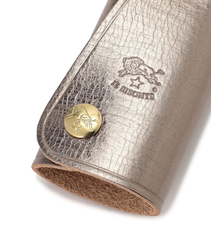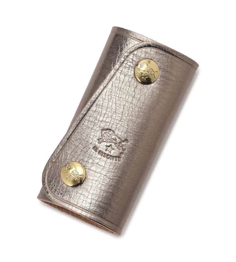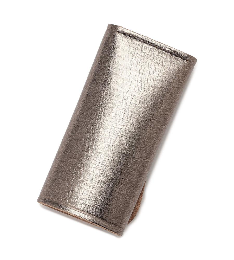 華やかなメタリックカラーのキーケース。フロントとスナップボタンにはブランドロゴの型押しがさりげなくスタイリッシュなデザイン。鍵をくるっと包むタイプのシンプルかつコンパクトなフォルムも魅力。デイリーに活躍するアイテムです。