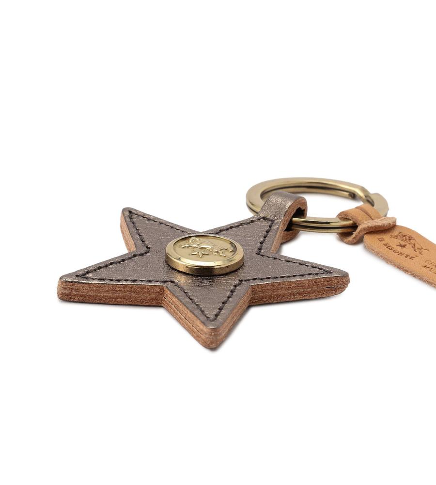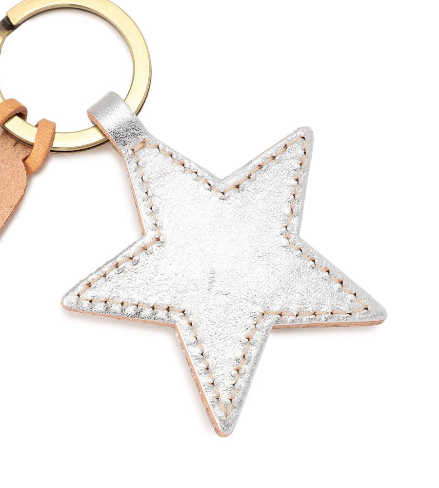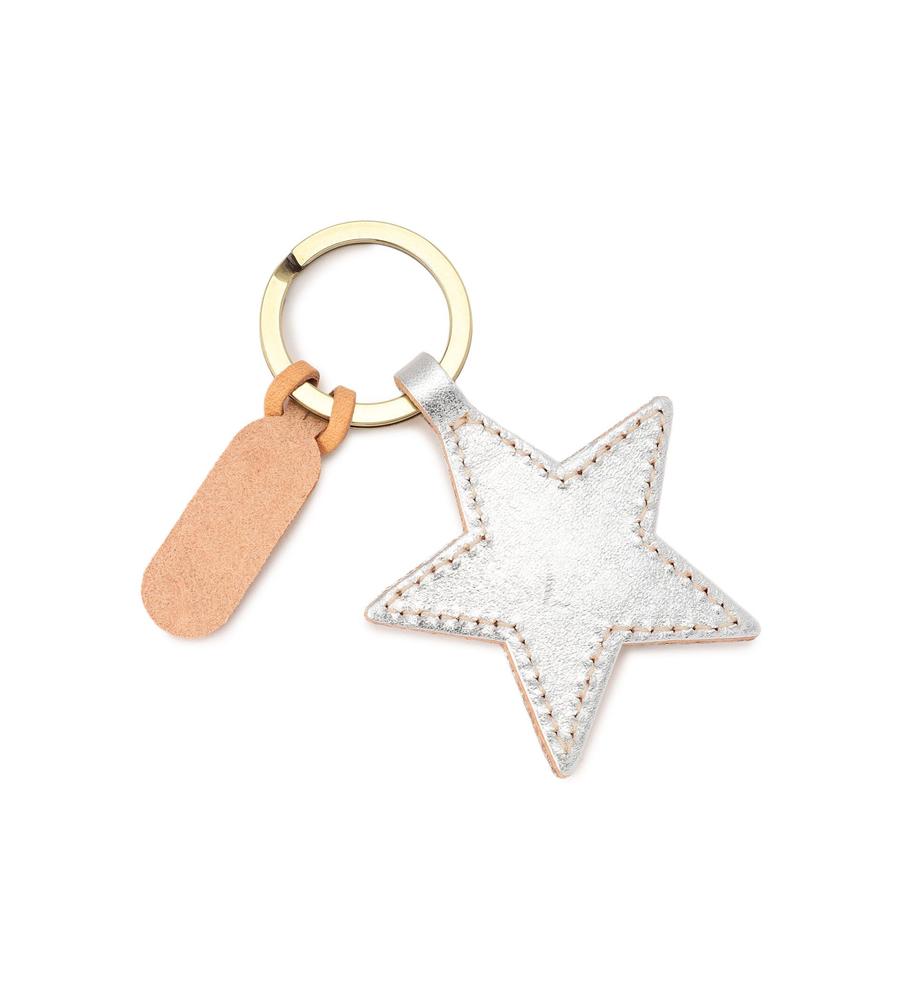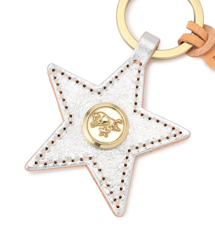 メタリックカラーと星形のチャームがインパクトのあるデザインのキーリング。センターにはブランドマークの型押しのゴールドボタンがおしゃれ。ブランドの特徴でもある上質なレザーのブランドタグもポイント。ホリデーギフトにも最適な華やかさ満点のアイテムです。