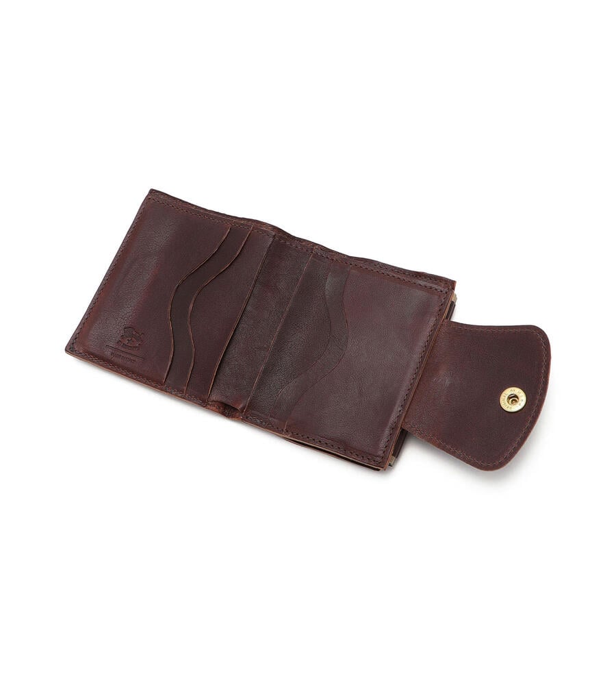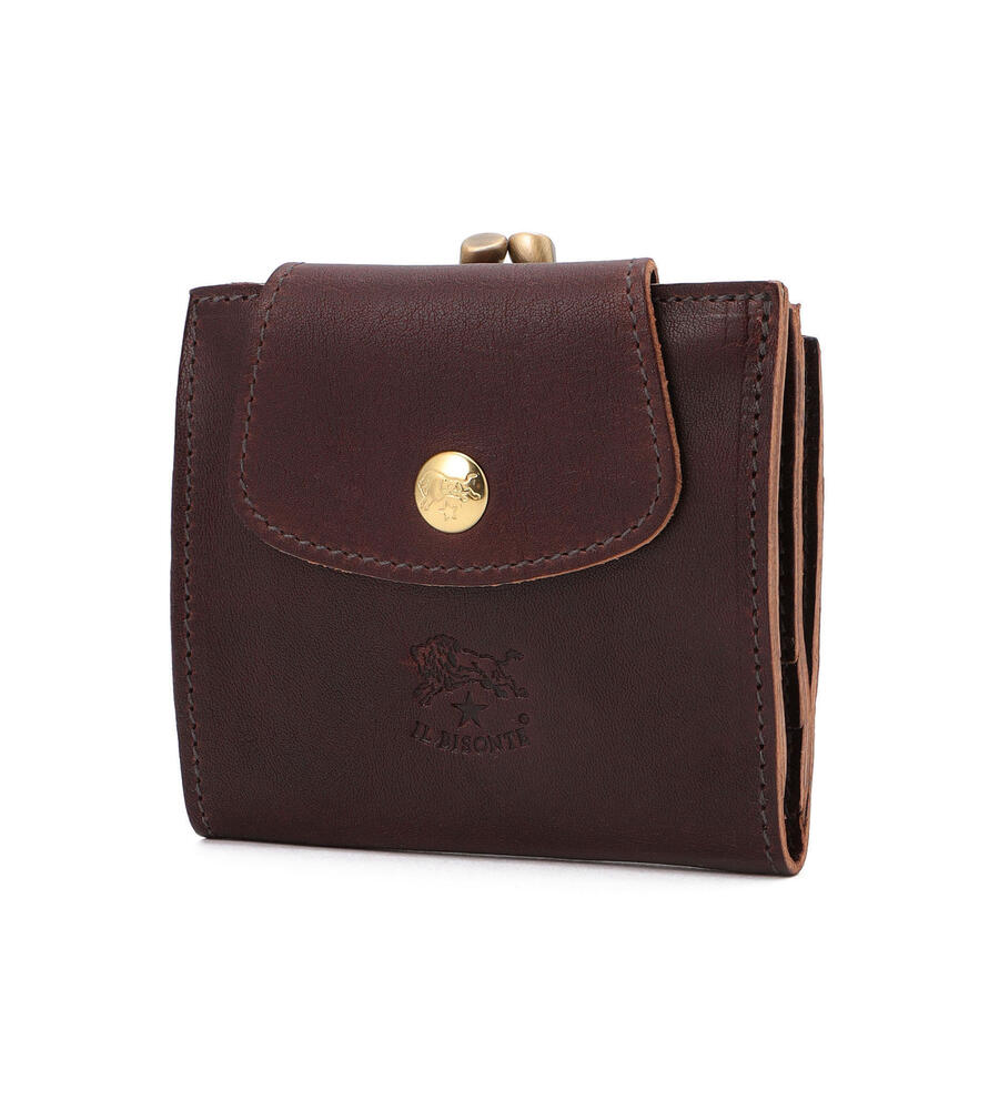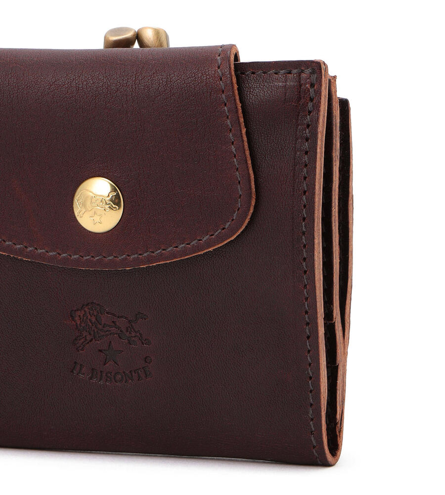 イルビゾンテのロゴをフロントとスナップボタン部分に型押しした、スタイリッシュな2つ折り財布。イルビンゾンテらしい、上質でマットな革素材とステッチが高級感あるポイント。小銭入れ部分はがま口仕様、立体的なお札入れと、機能面も優秀。トレンドレスなデザインで長く愛用できるアイテムです。