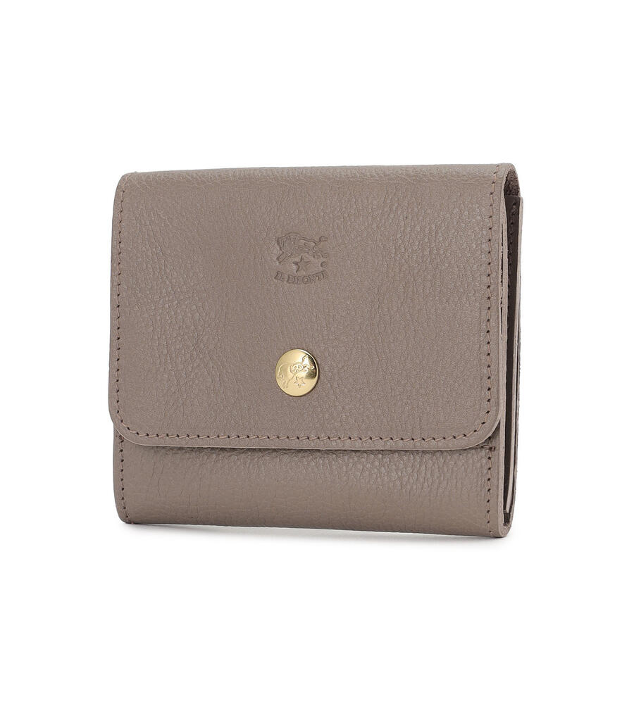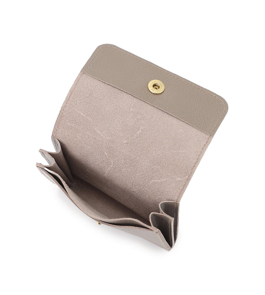 上品で格調の高い皮革素材を用いたミニウォレットです。フロントに添えたゴールドの金具とロゴの型押しが、エレガントなアクセントになっています。マチのあるカード入れを備えており、カード類をスマートに収納できるつくり。紙幣は折り畳んで収納することが可能です。中性的な佇まいで性別を問わずにお使いいただけます。