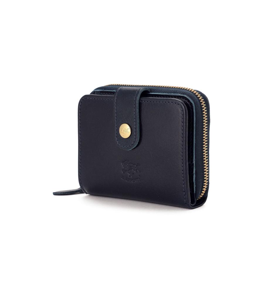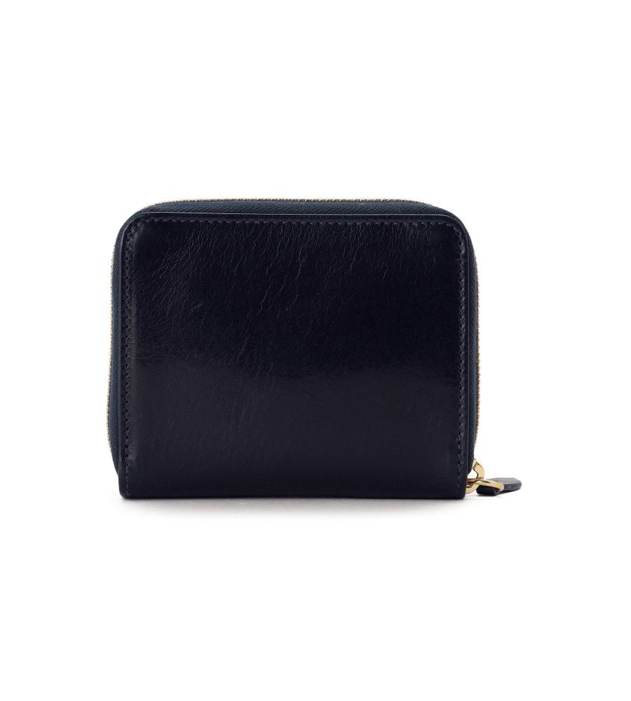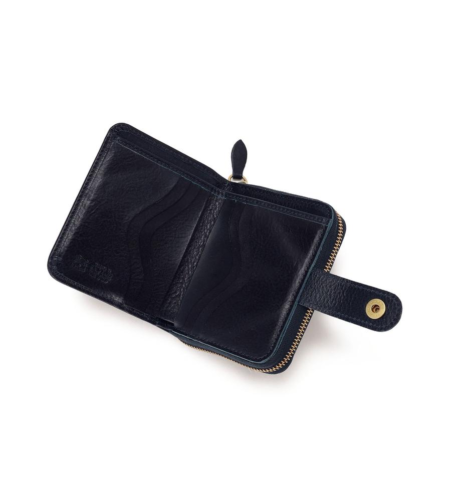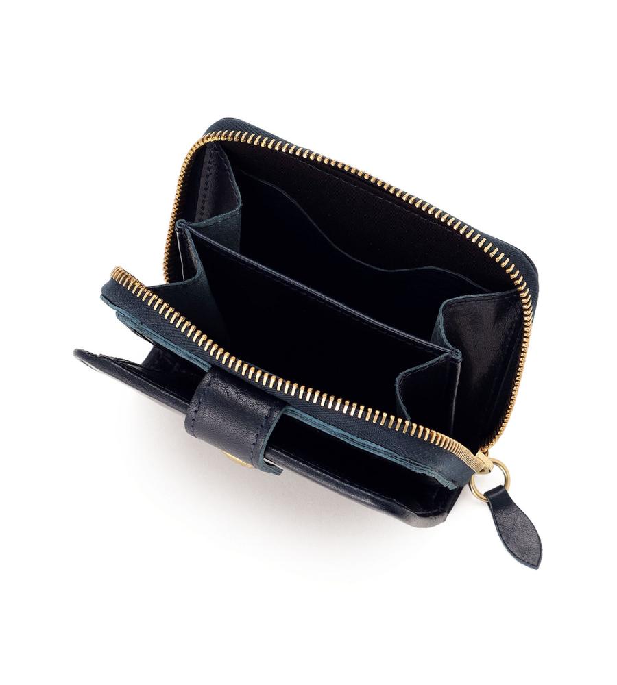 マットな光沢を持つ皮革素材の2つ折りウォレット。ラウンドジップとスナップボタンのタブで留めるつくりです。コインポケットが独立した、使い勝手の良いデザイン。コンパクトなサイズ感は、キャッシュレス派の方にもおすすめです。