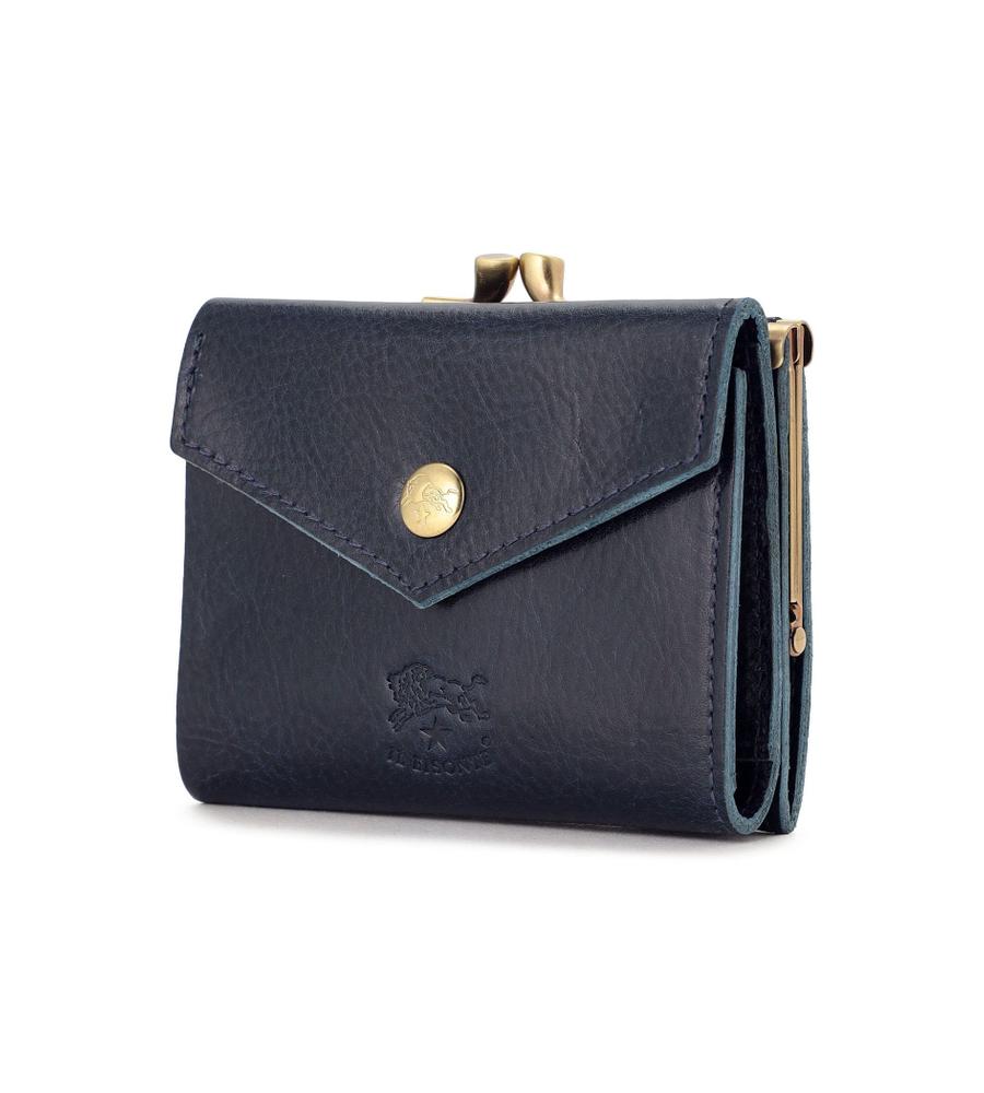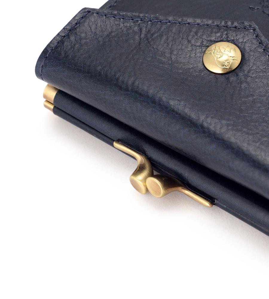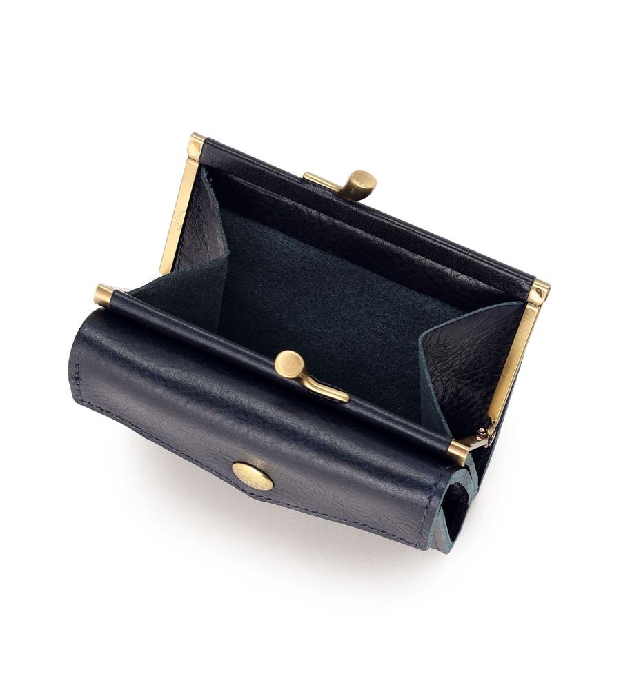 がま口デザインが印象的な2つ折りウォレット。マットな光沢を持つレザーで、高級感のある佇まいに仕上げています。コイン入れはがま口ポケットで独立しており、使いやすいデザイン。キャッシュレス派の方にもおすすめのコンパクトサイズです。