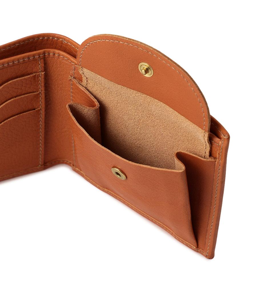 手にしっくりとなじむ皮革を用いた2つ折りウォレット。コインもカードも紙幣もすっきりと収まるコンパクトな設計。ハート入りのロゴの型押しが個性的なアクセントになっています。