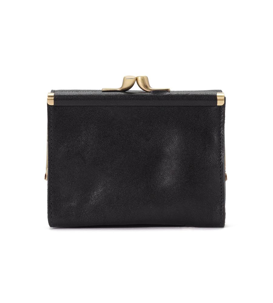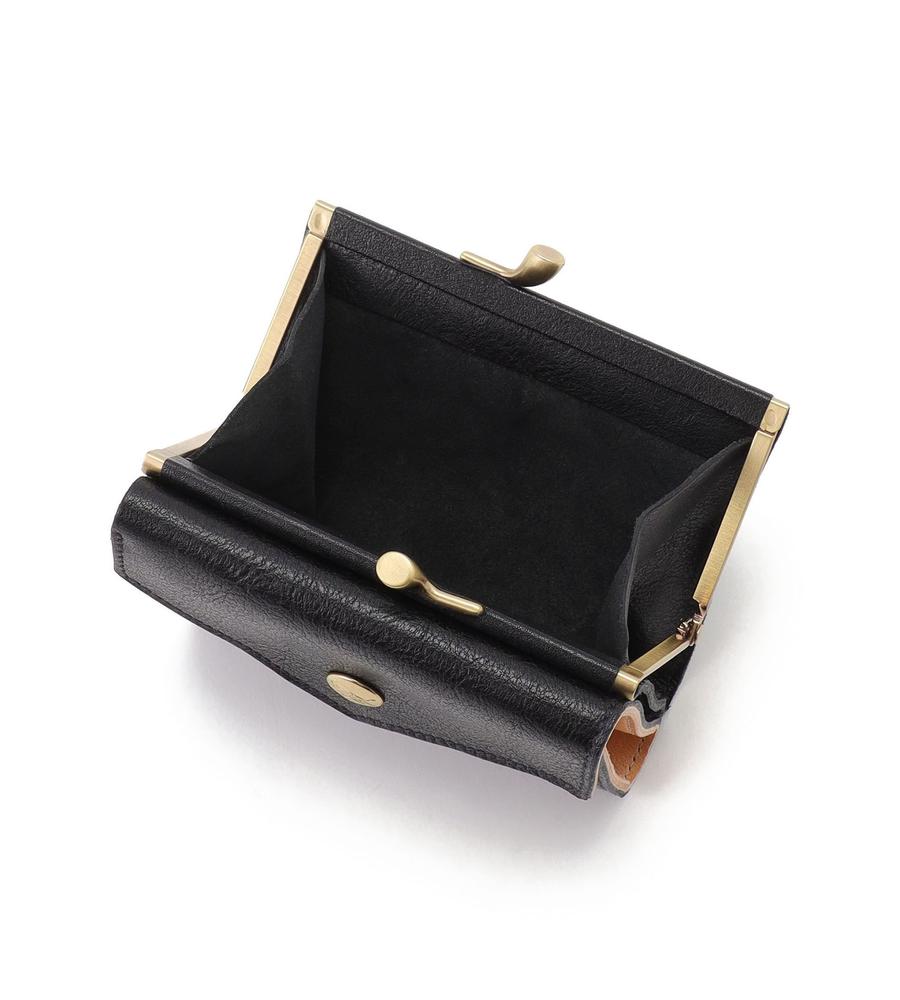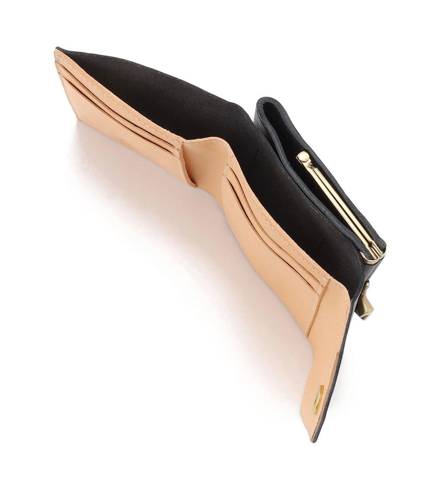 フロントにシグネチャーロゴを型押ししたウォレットです。小さめのバッグにも収まる二つ折り、外付けのがま口でコインの出し入れのしやすさにもこだわりました。使うほどに手に馴染む本牛革ならではの質感もポイントです。