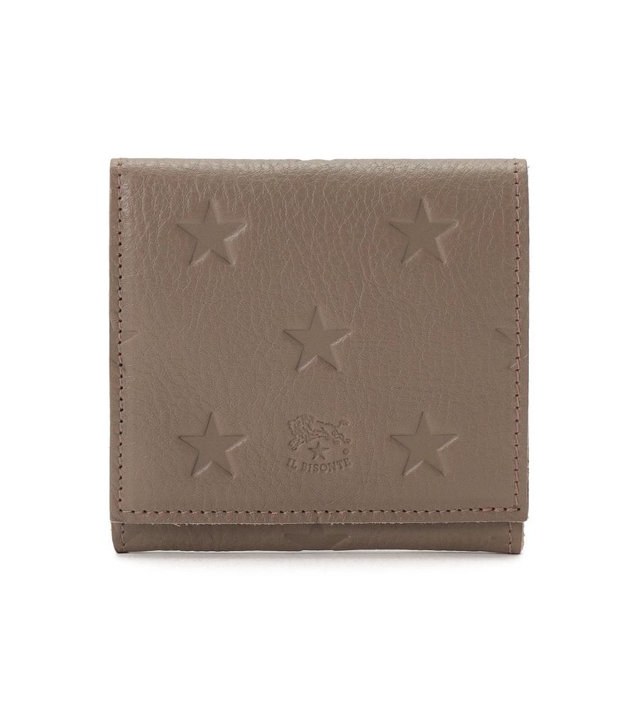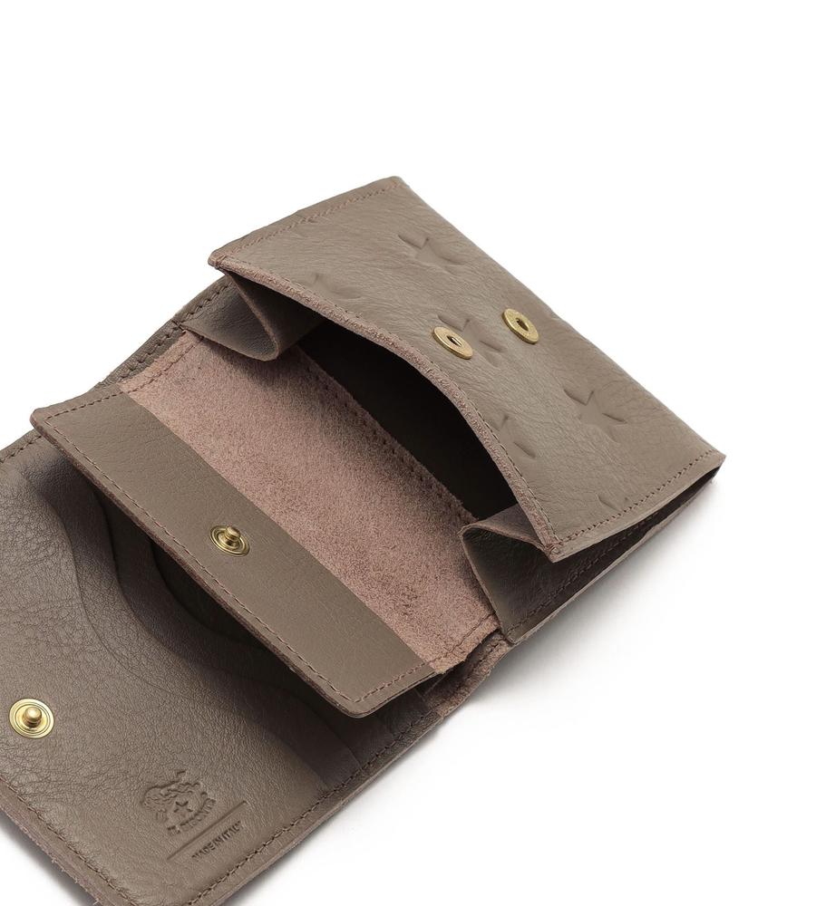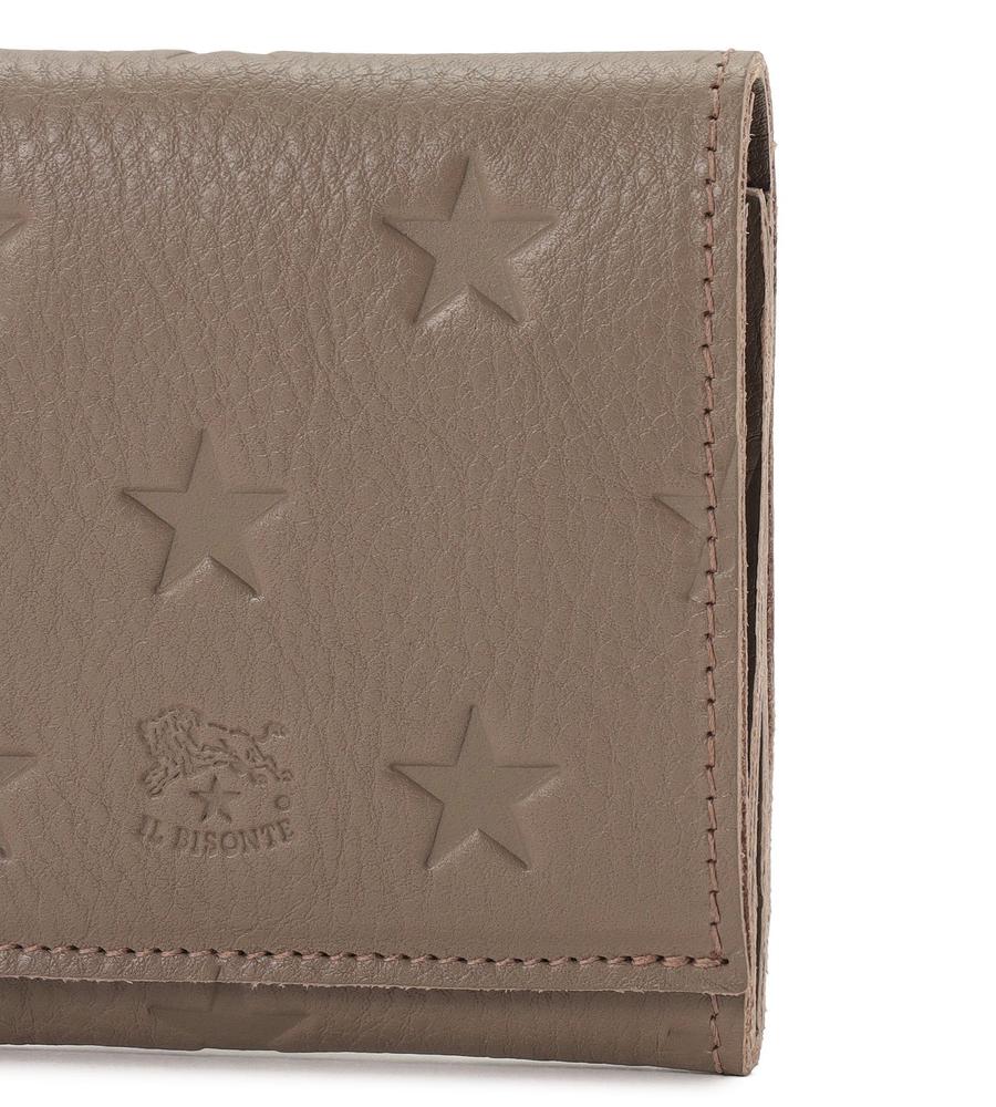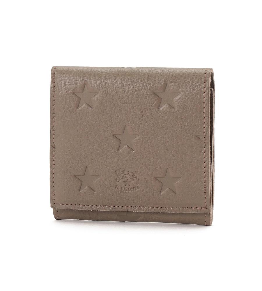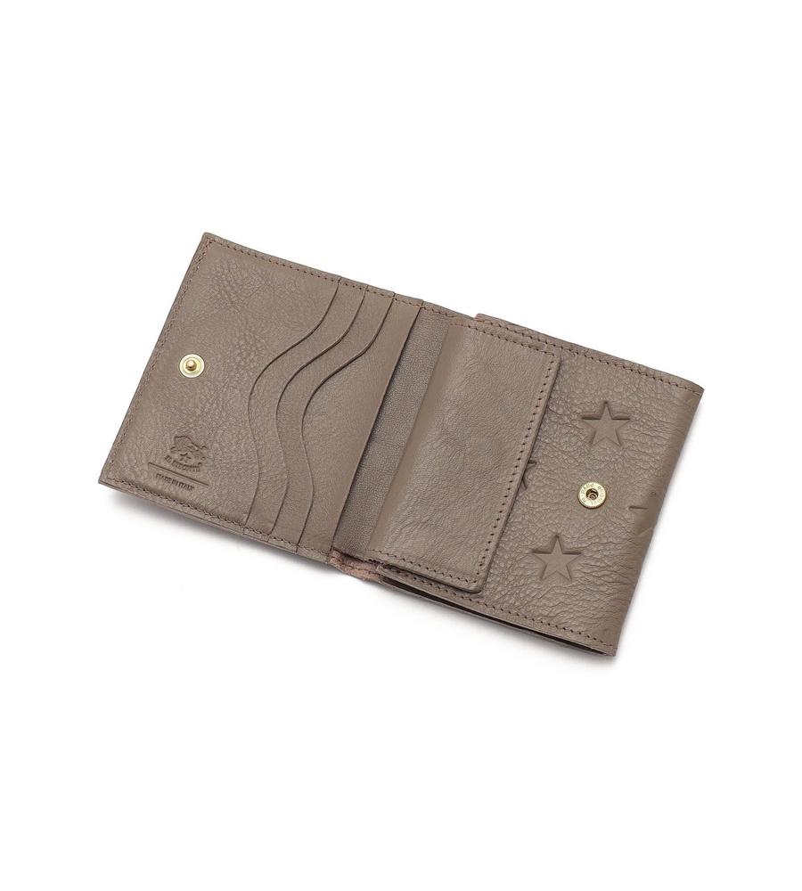 上質なレザーにブランドを象徴するスターモチーフを型押しした二つ折りウォレット。内側に小銭、紙幣、カード入れを備え、中身を整理して収納できます。コンパクトながら使い勝手がよく、持ち運びにも便利な一品です。
