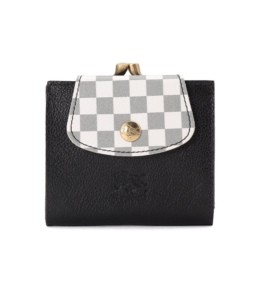 がま口仕様のコイン入れのレザーウォレット。チェッカーボード柄がデザインアクセント。ブランドロゴの型押しがさりげなくスタイリッシュなポイント。中が見やすいコイン入れ、充実のカード入れで使い勝手も抜群。デイリーに活躍するアイテムです。