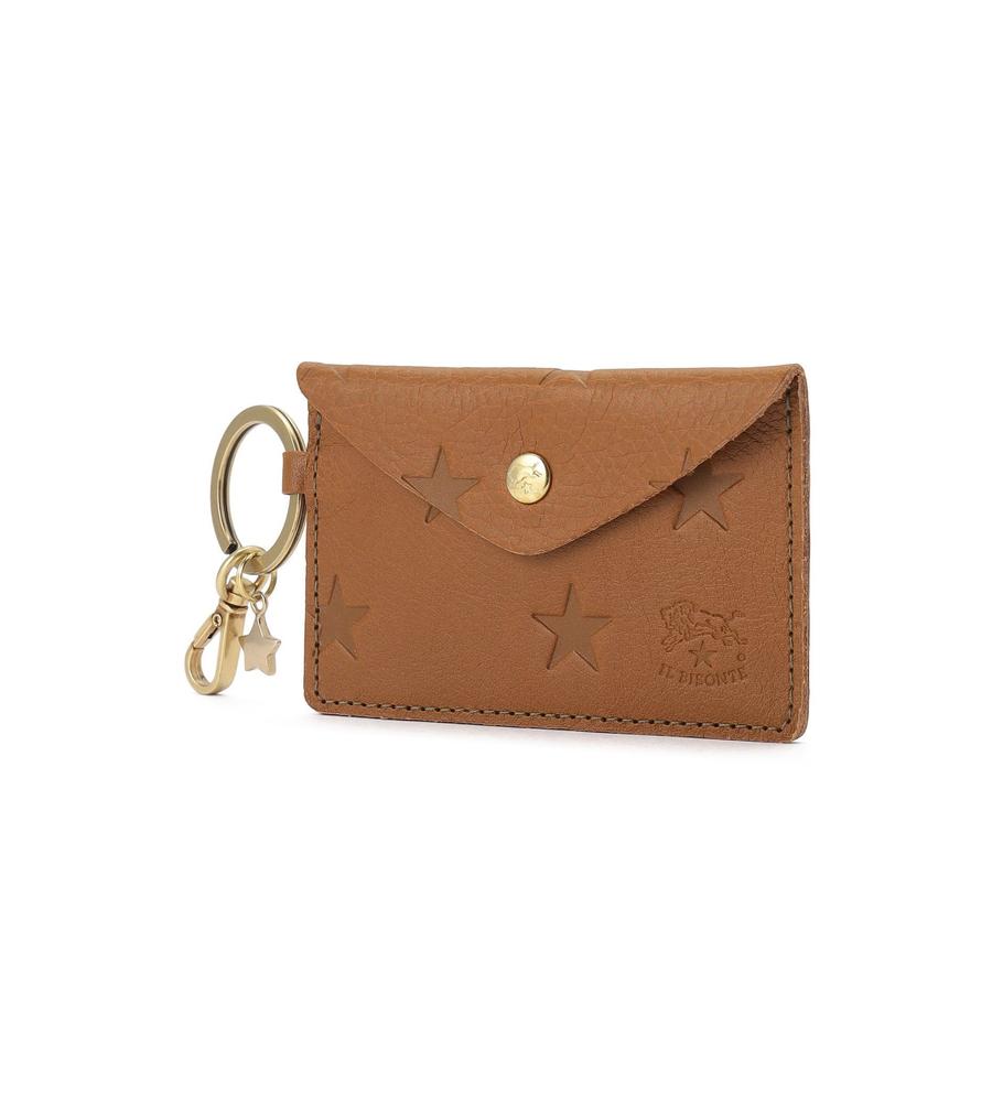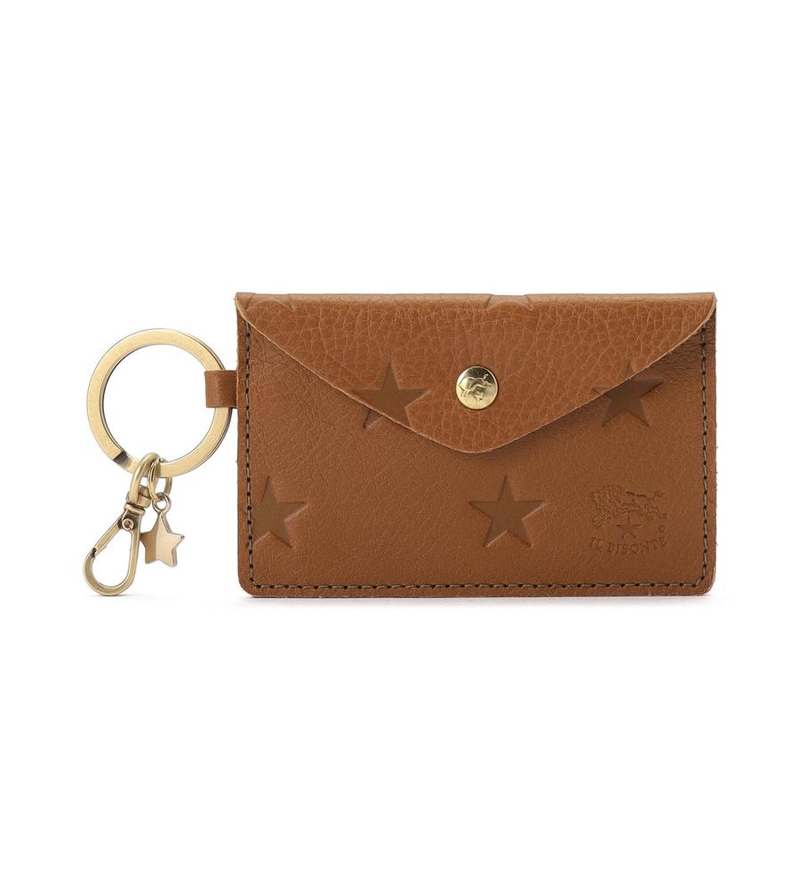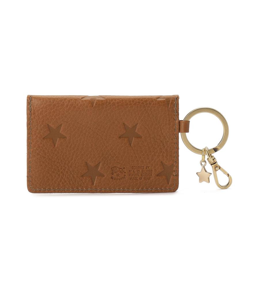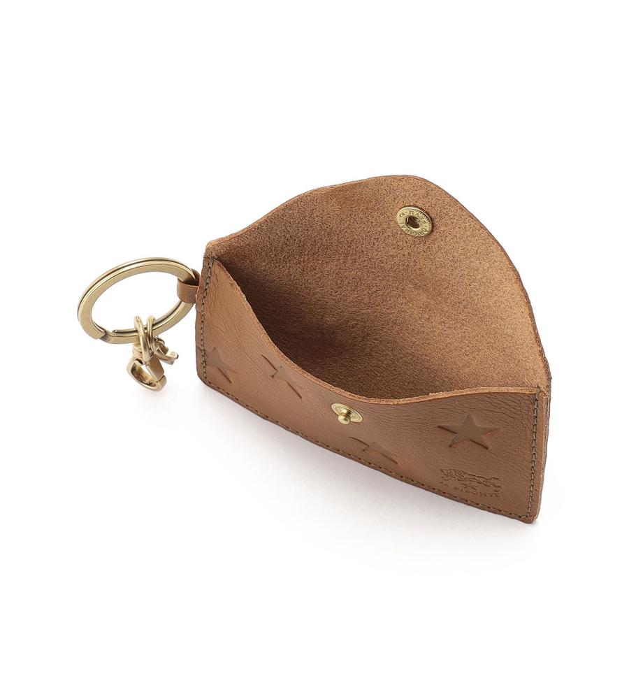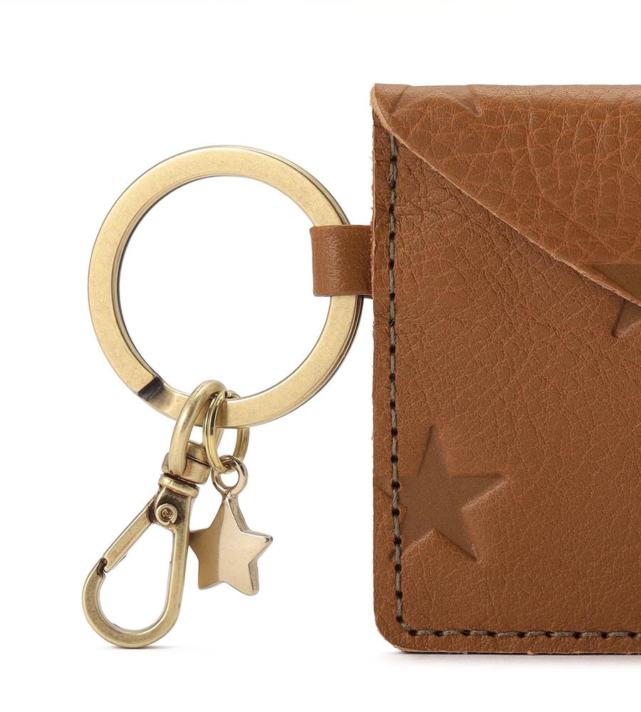 上質なレザーにブランドを象徴するスターモチーフを型押しした、キーリング付きのフラップ式カードケース。大切な鍵とカードをひとつにまとめて持ち運べる便利な一品。ちょっとした小物や小銭を入れるのもおすすめです。