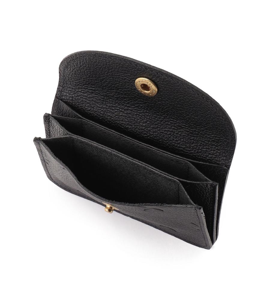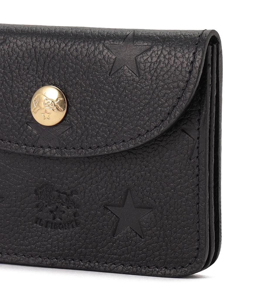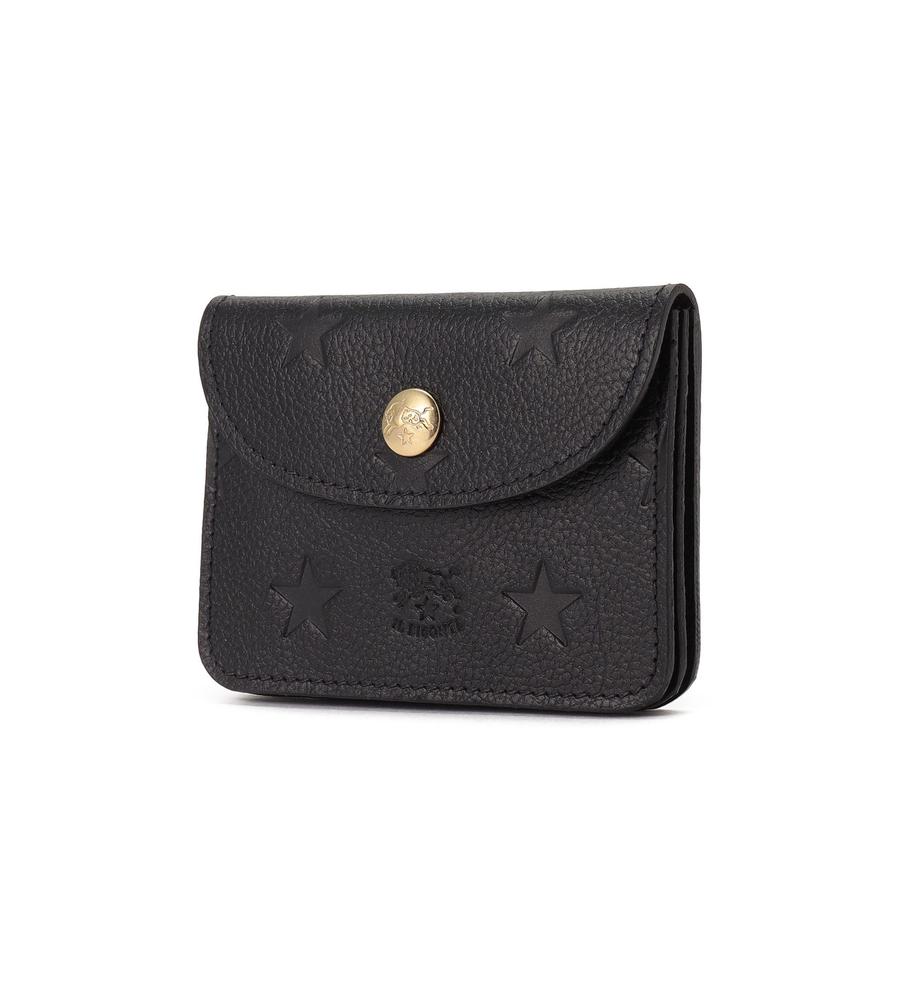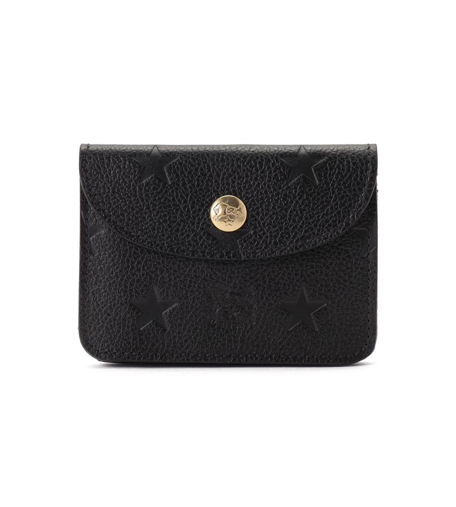 ブランドの特徴でもある上質なレザーで仕立てたカードケース。ブランドロゴと星柄の型押しがスタイリッシュなデザイン。ゴールドのボタンがエレガントなポイント。コンパクトなフォルムながら、カードの整理に便利な仕切りと立体的なフォルムも魅力です。