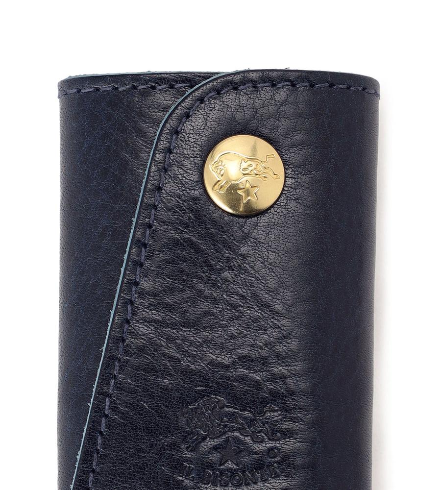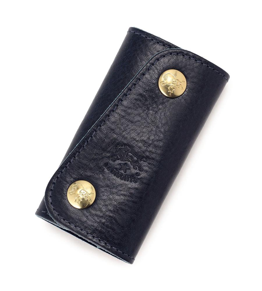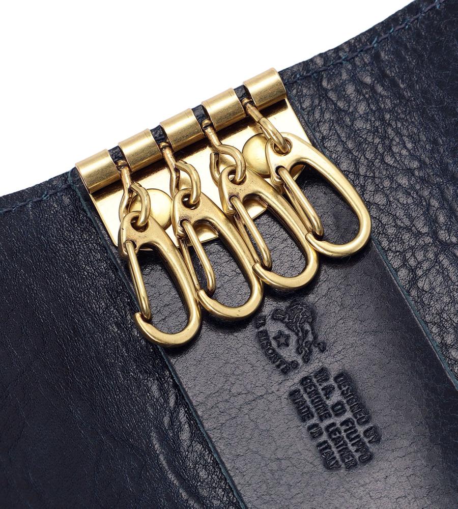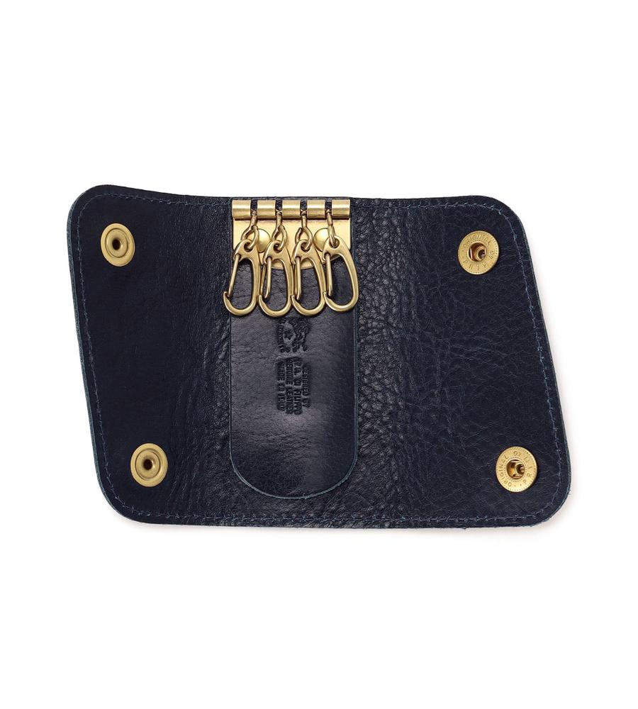斜めに配したメタリックのスナップが目を引くキーケース。フラップにはおなじみのバッファローモチーフを刻印しています。4つのフックが付いており、鍵を見分けやすい仕様。上質なレザーの風合いも魅力です。