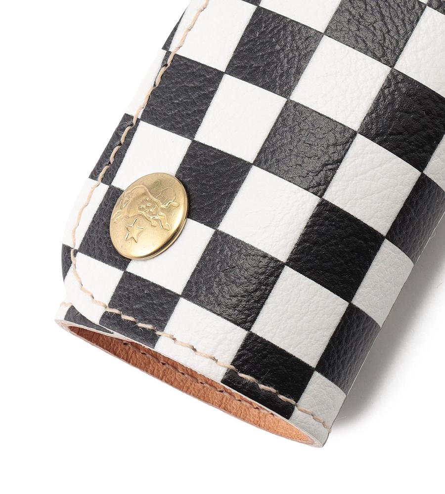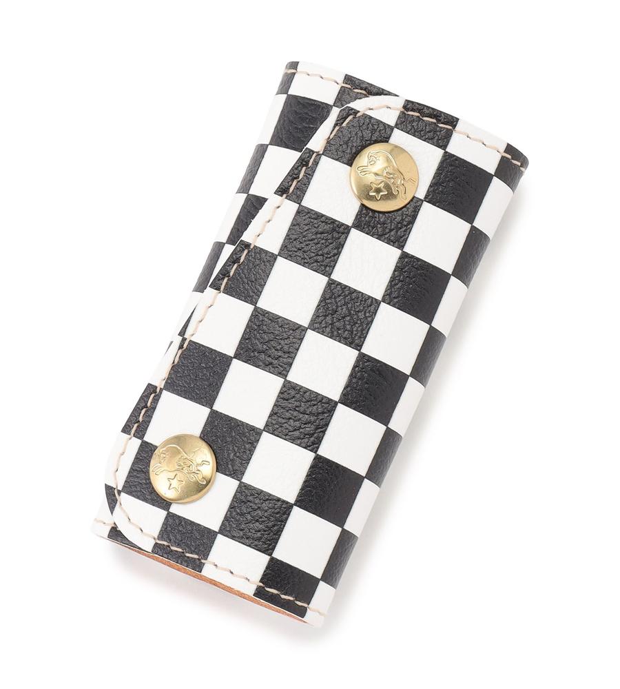 チェッカーボード柄がおしゃれなデザインのレザーキーケース。ボタンには、ブランドロゴマークの型押しがさりげなくスタイリッシュなデザイン。簡単に取り外し可能なナスカンタイプ。デイリーに活躍するアイテムです。