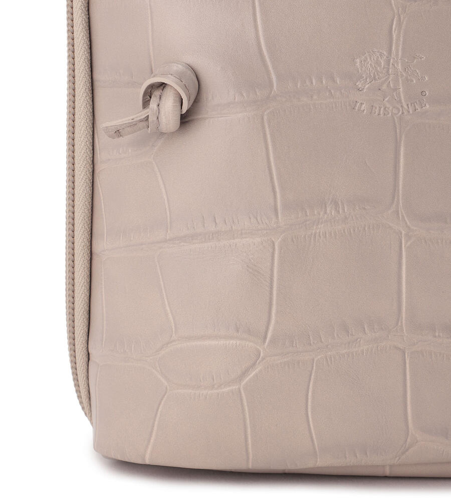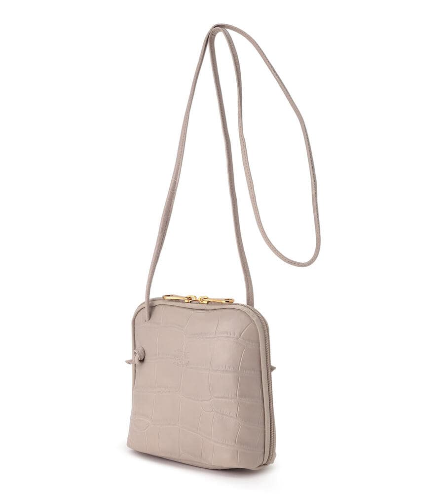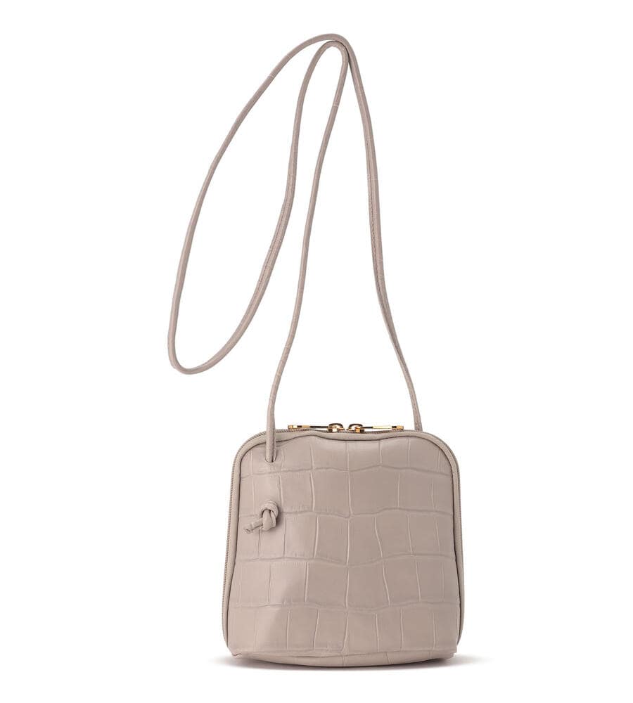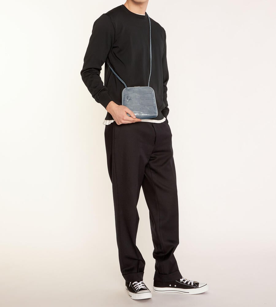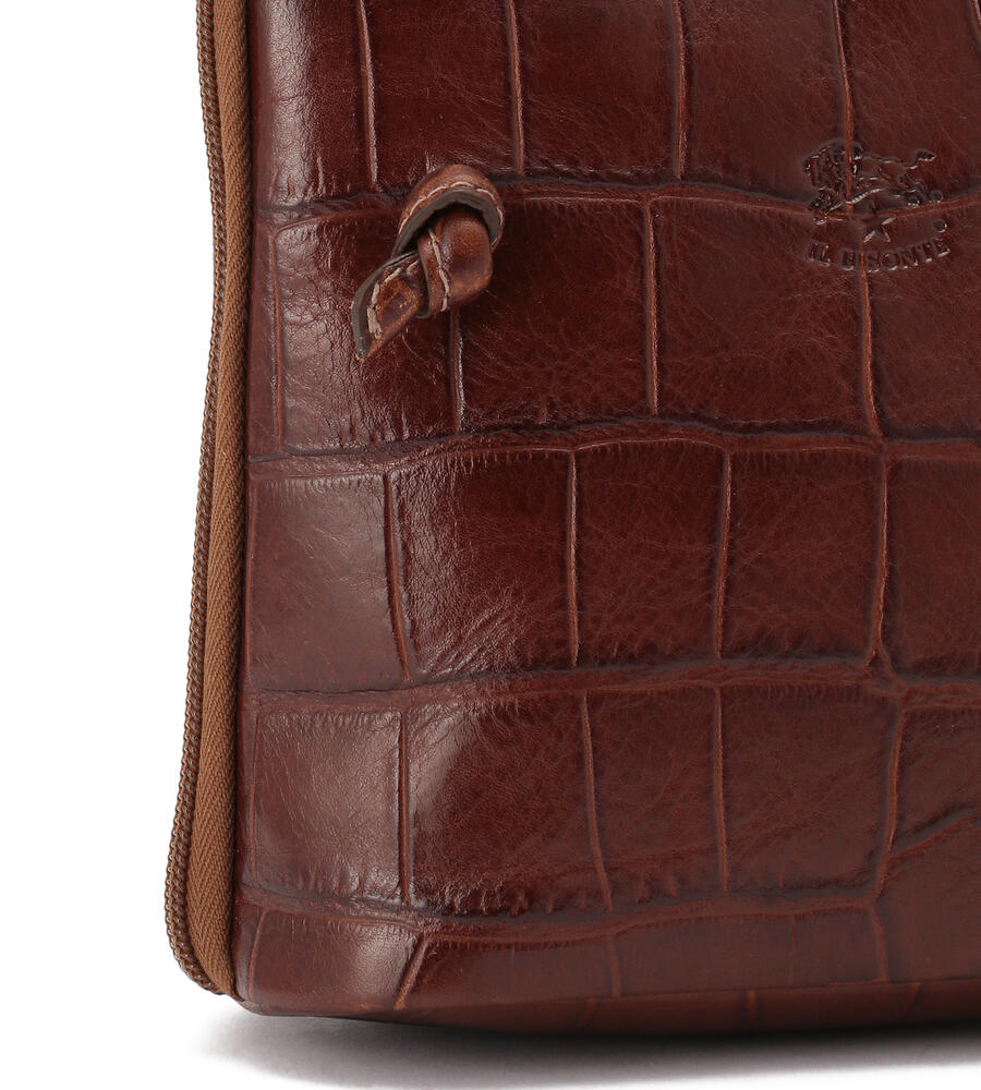 クロコダイルの型押しがほどこされたレザークロスボディバッグ。コンパクトなスクエアフォルムとスリムなストラップが軽やかな印象のアイテムです。間口は両側に大きく開くジップクロージャー。中身が見渡しやすく、物の出し入れもスムーズに行なえます。フロントのバイソンロゴがワンポイントに。