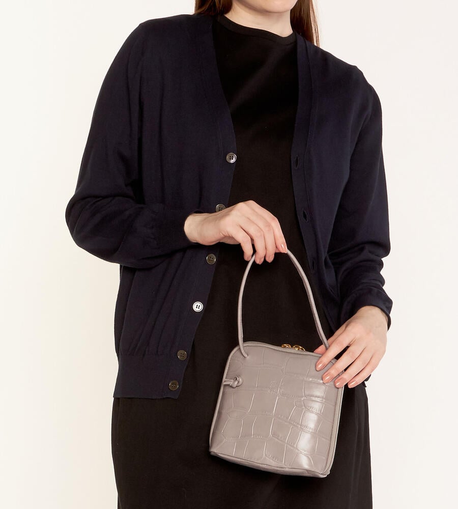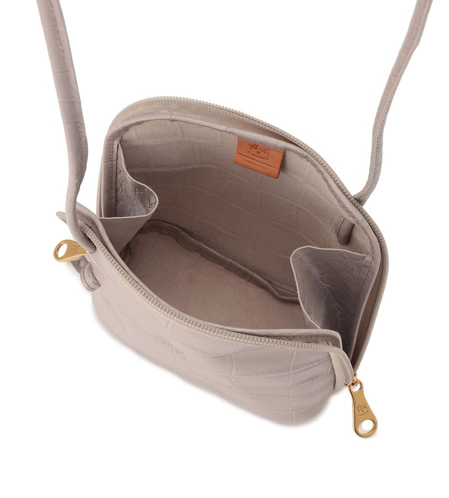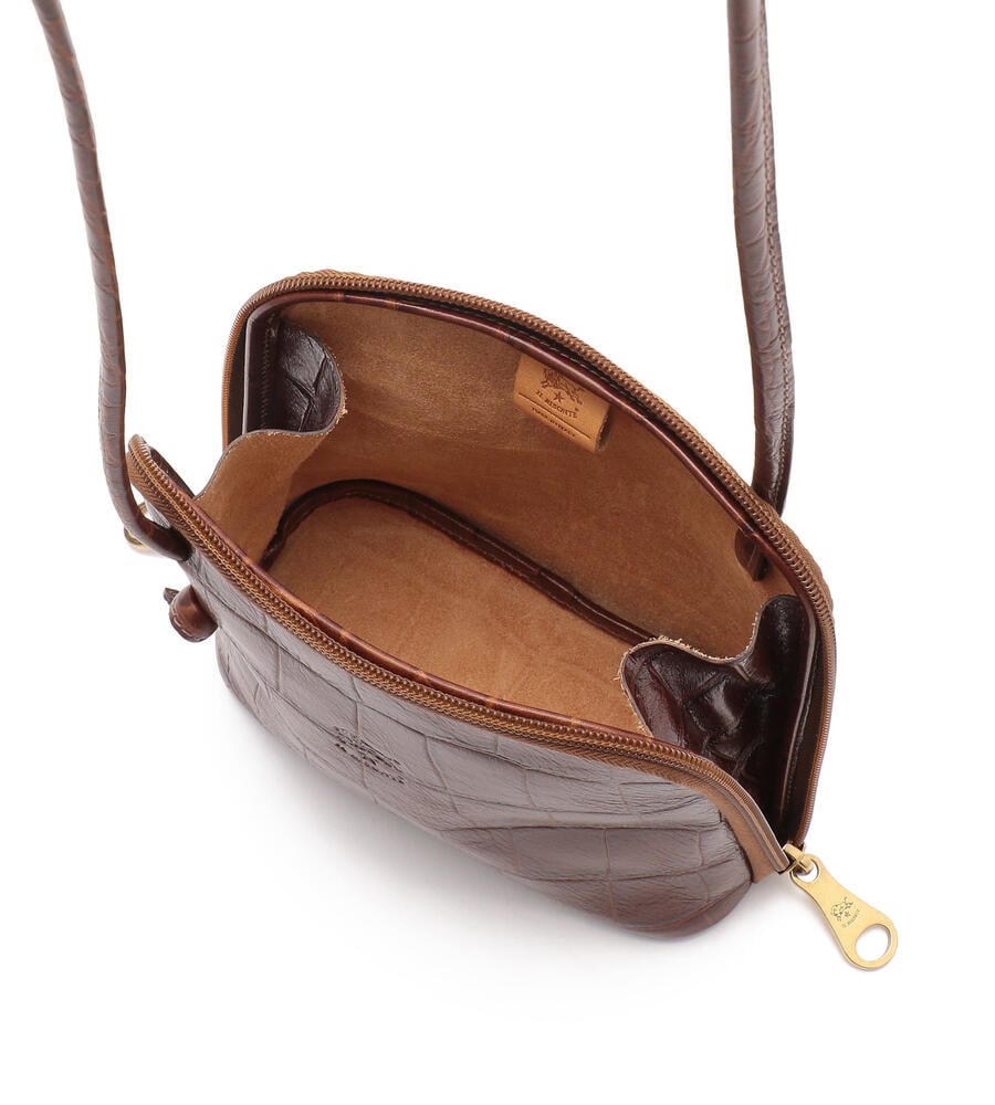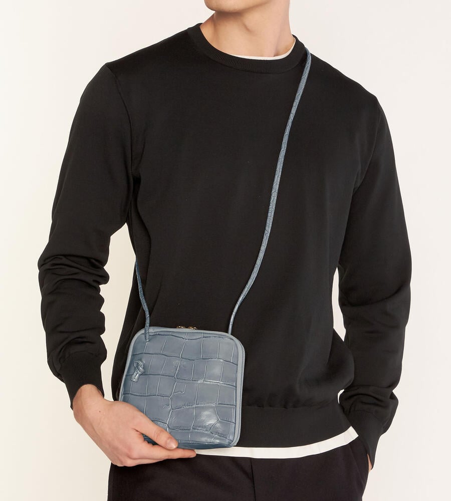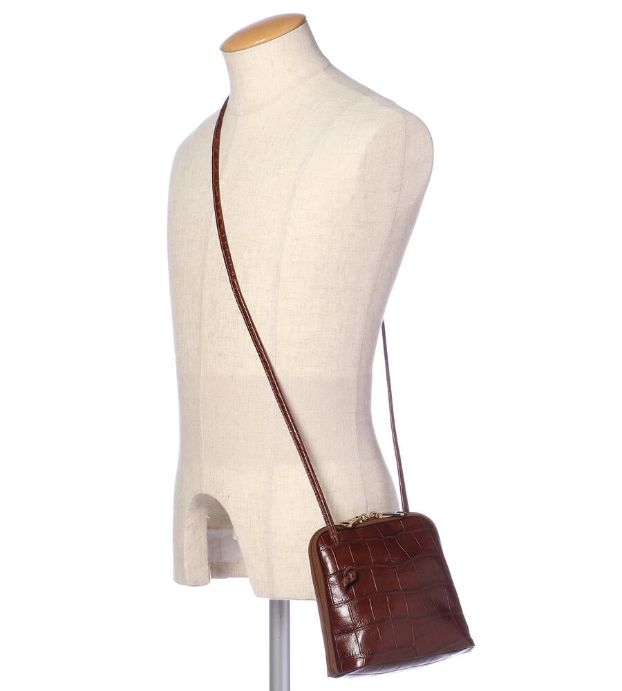 クロコダイルの型押しがほどこされたレザークロスボディバッグ。コンパクトなスクエアフォルムとスリムなストラップが軽やかな印象のアイテムです。間口は両側に大きく開くジップクロージャー。中身が見渡しやすく、物の出し入れもスムーズに行なえます。フロントのバイソンロゴがワンポイントに。