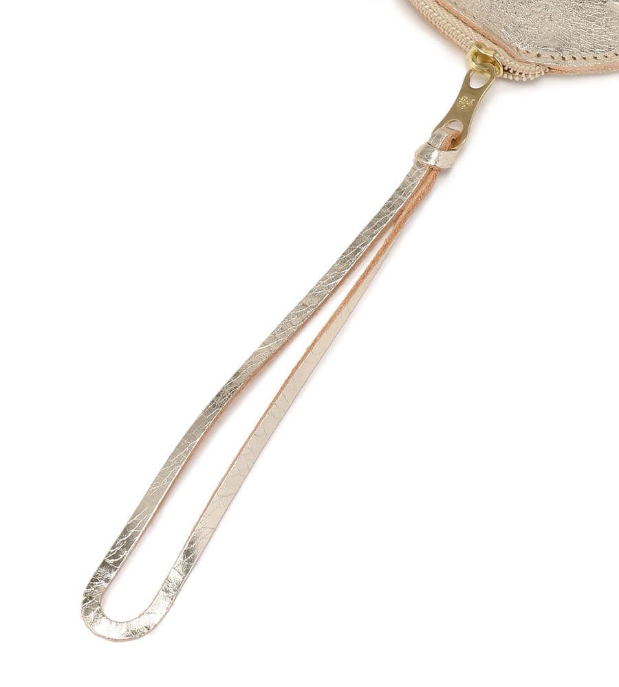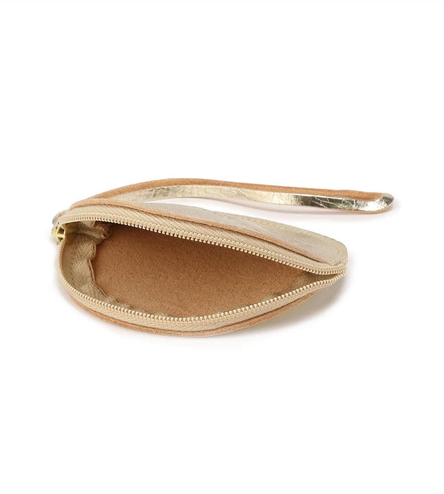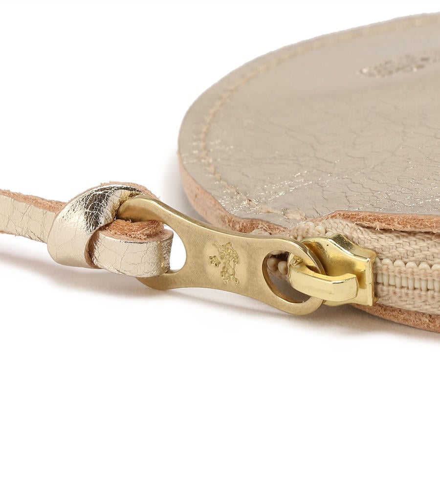 キラリと輝くメタリックが華やかな印象のラウンドフォルムコインパース。ブランドロゴの型押しがアクセントに。ストラップつき、コンパクトなサイズは使い勝手もよくおすすめです。