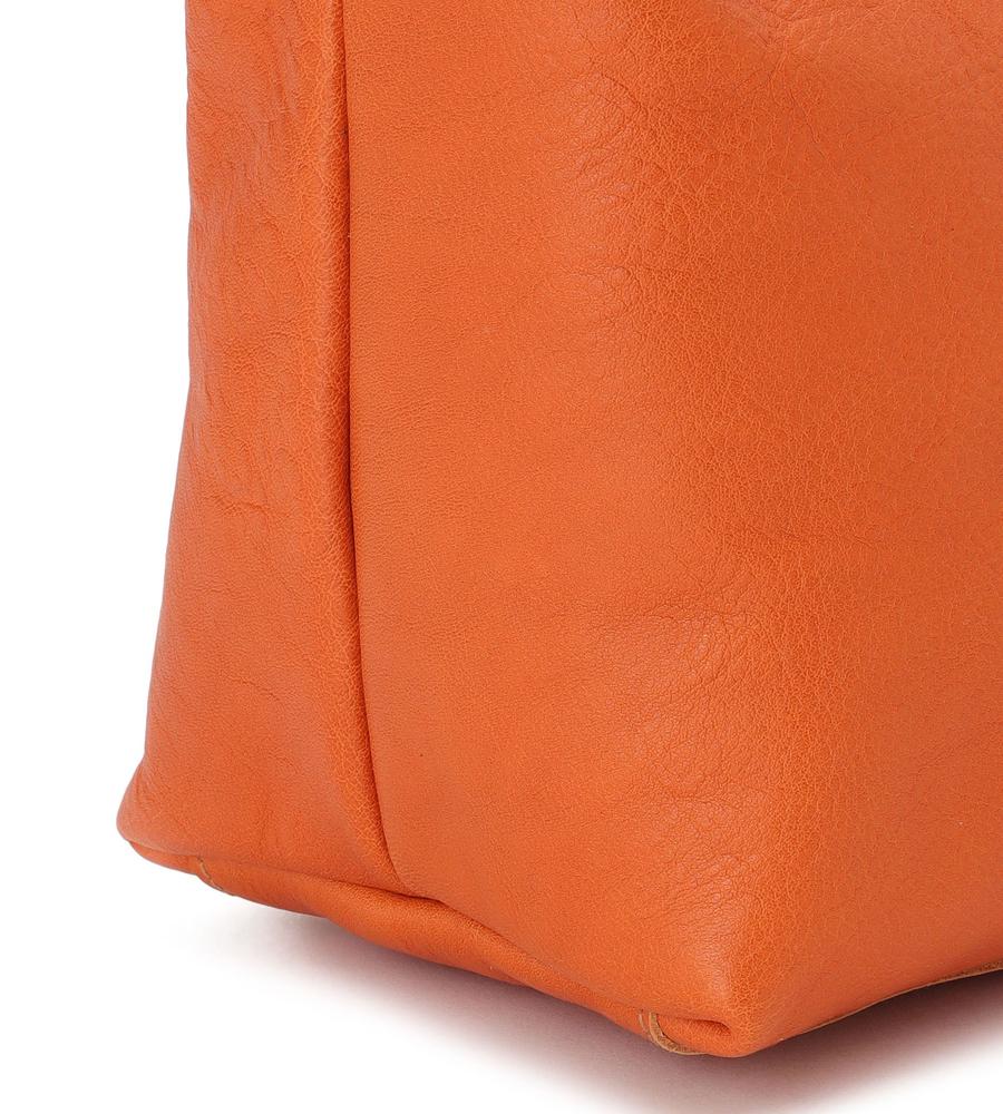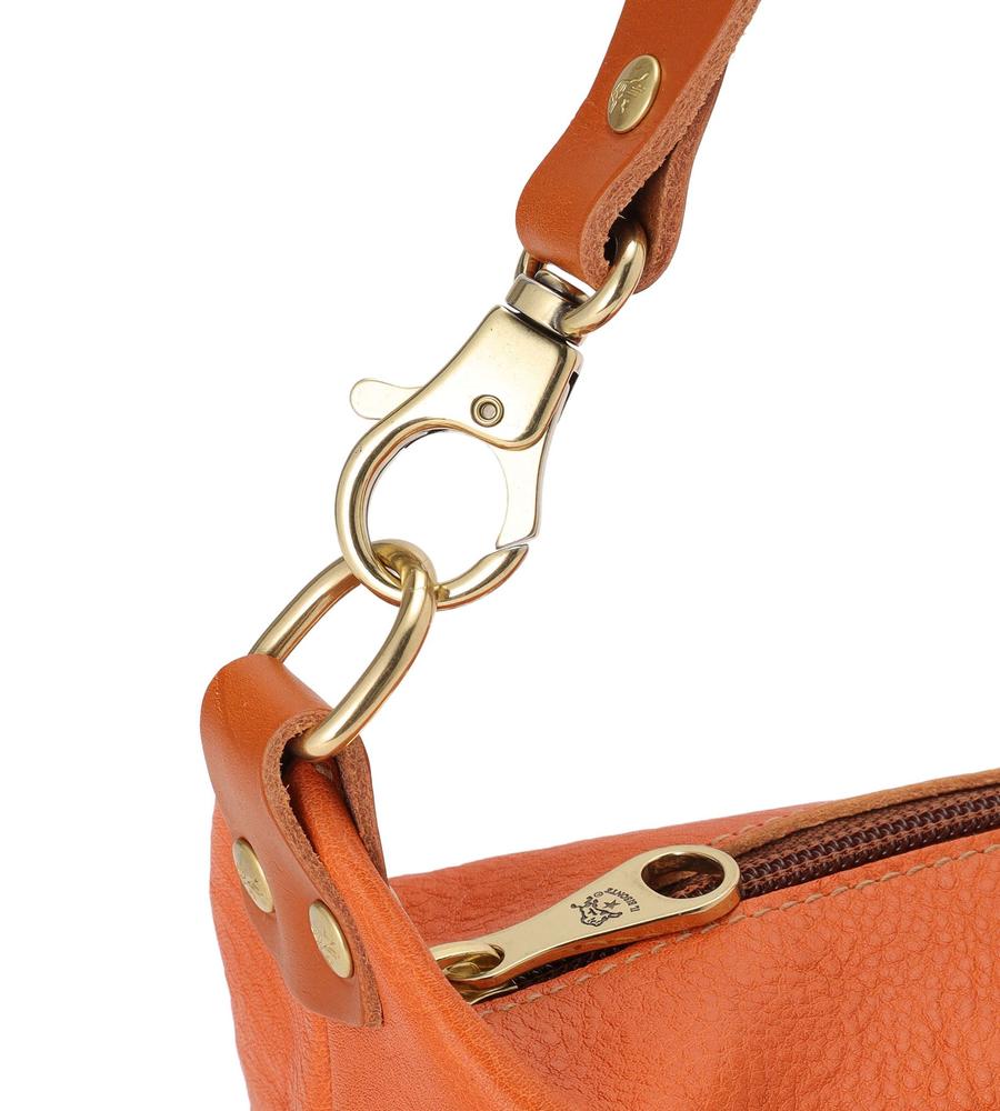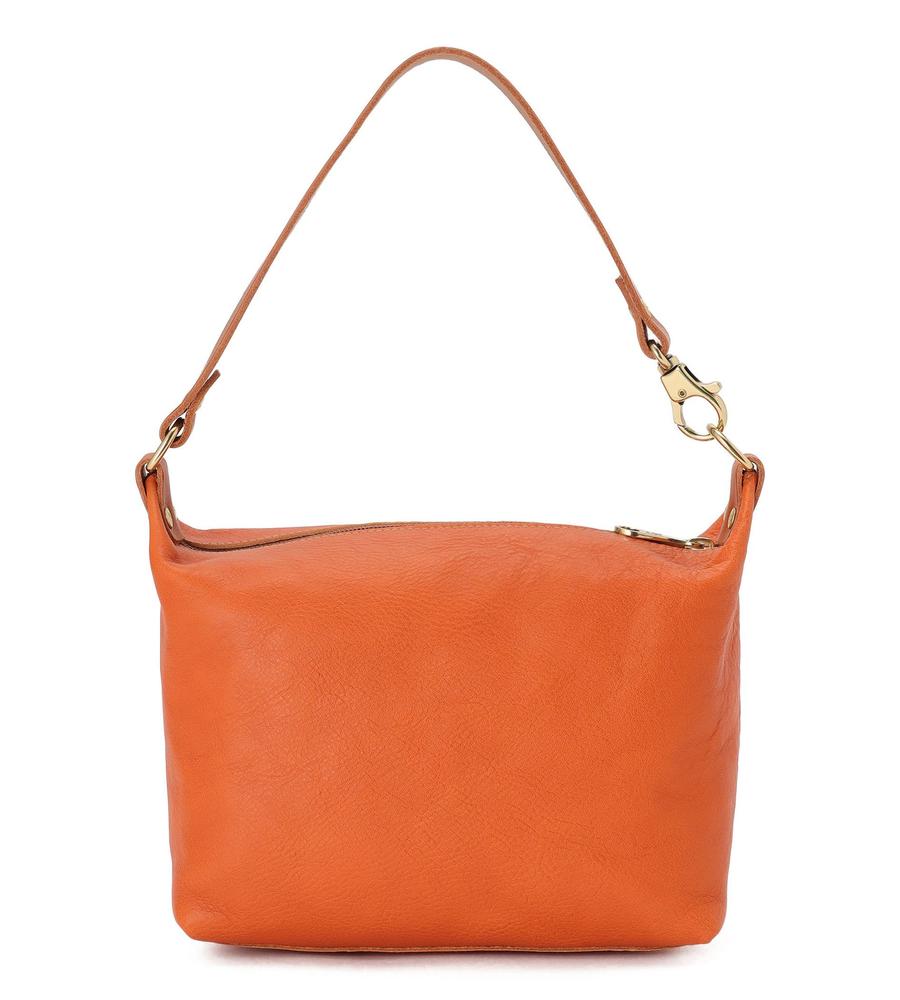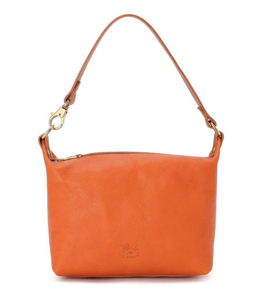 肩にしっくり馴染むワンハンドル仕様のショルダーバッグ。型押しロゴとヴィンテージ調のメタルパーツがデザインのアクセント。裏地がなく、レザーの上質感を堪能できる仕上がり。マチ幅を広く取った立体的なフォルムで収納力も充分です。