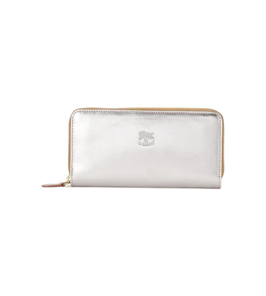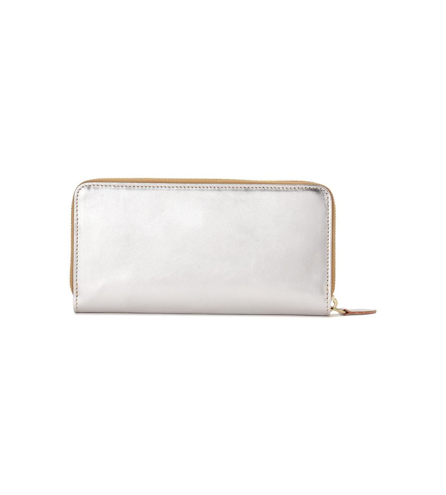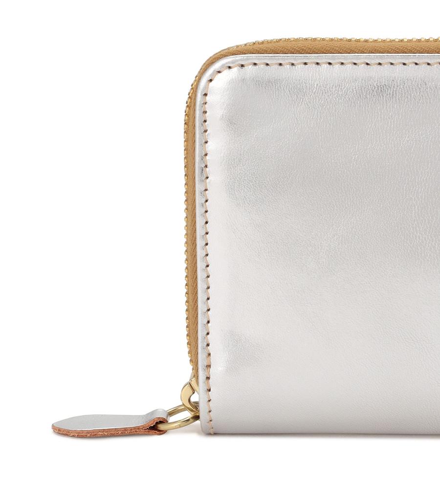 輝くメタリックカラーがゴージャスなムードのラウンドジップのロングウォレット。フロントのブランドロゴの型押しがおしゃれなアクセント。立体的なポケットは、ジップ付きのコインケースと充実のカードケース付きで収納力抜群のアイテムです。