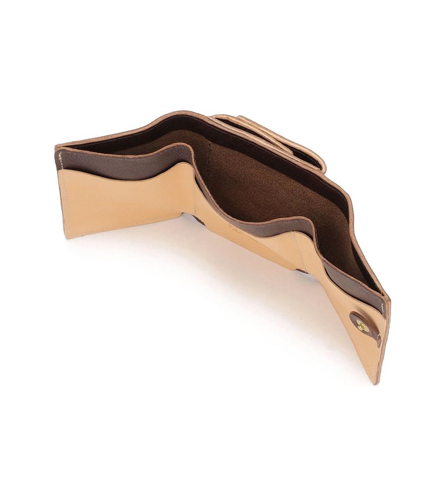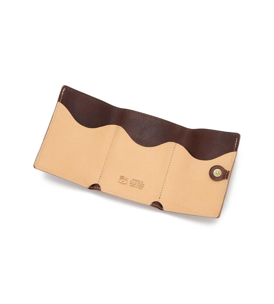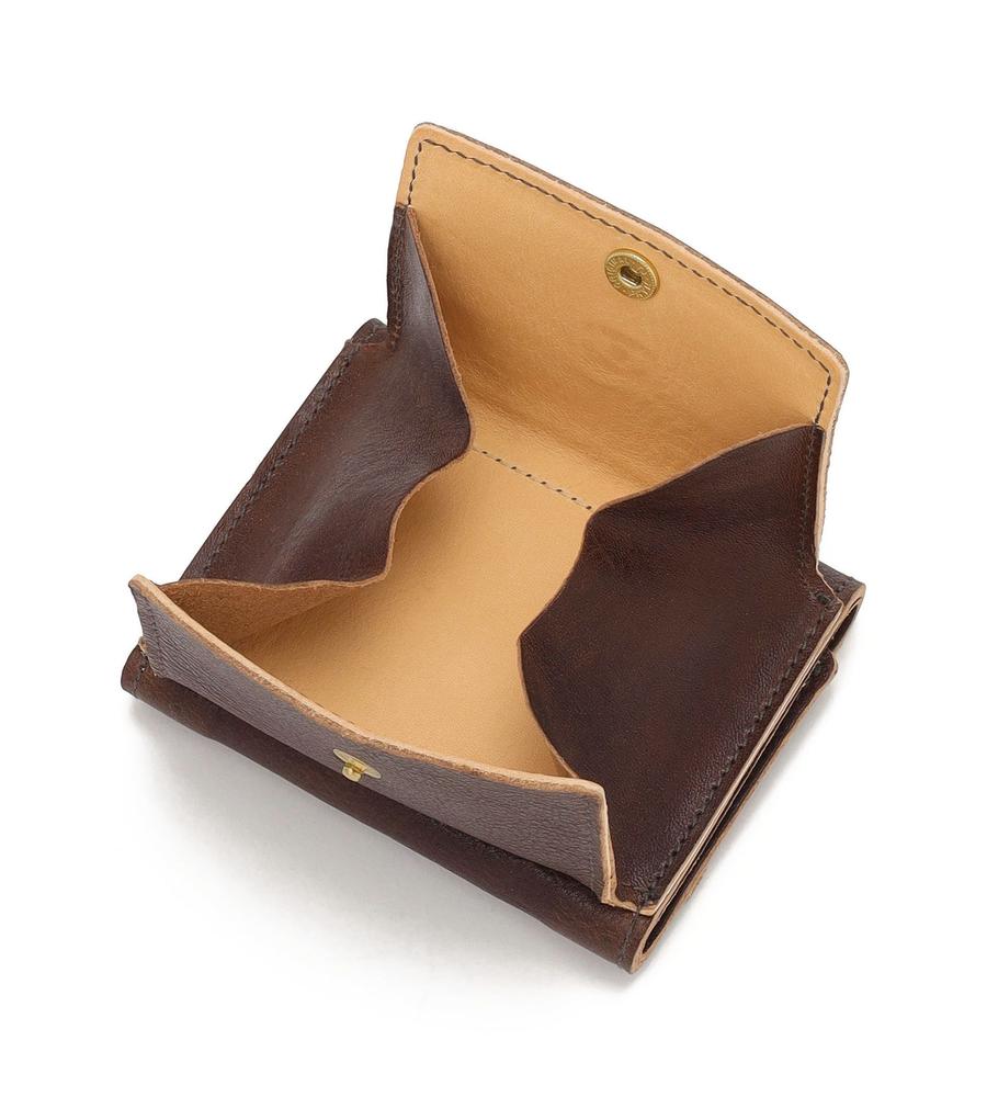 シグネチャーロゴを型押ししたウォレットです。小さめのバッグにも収まる三つ折りデザイン、大きく開く外付けのコインケースで出し入れしやすくデザインしました。使うほどに手に馴染む本牛革ならではの質感もポイントです。