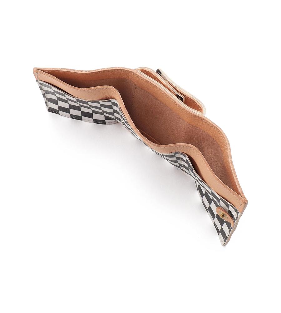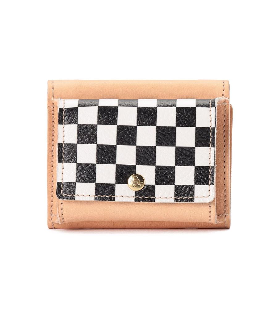 チェッカーボード柄をアクセントにした3つ折りレザーウォレット。ブランドロゴの型押しがさりげなくスタイリッシュなポイント。立体的なコイン入れで使い勝手も抜群。コンパクトなフォルムでミニマムなお出かけスタイルにぴったりなアイテムです。