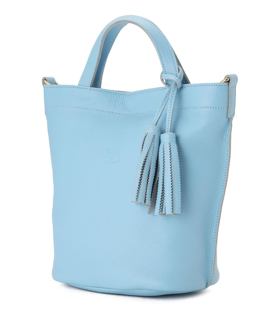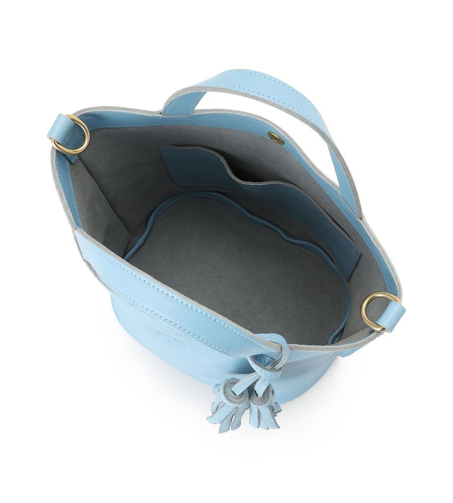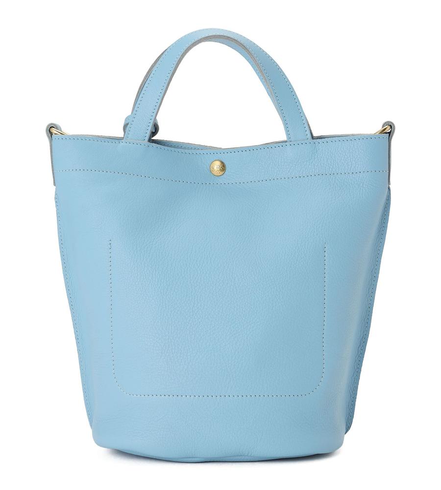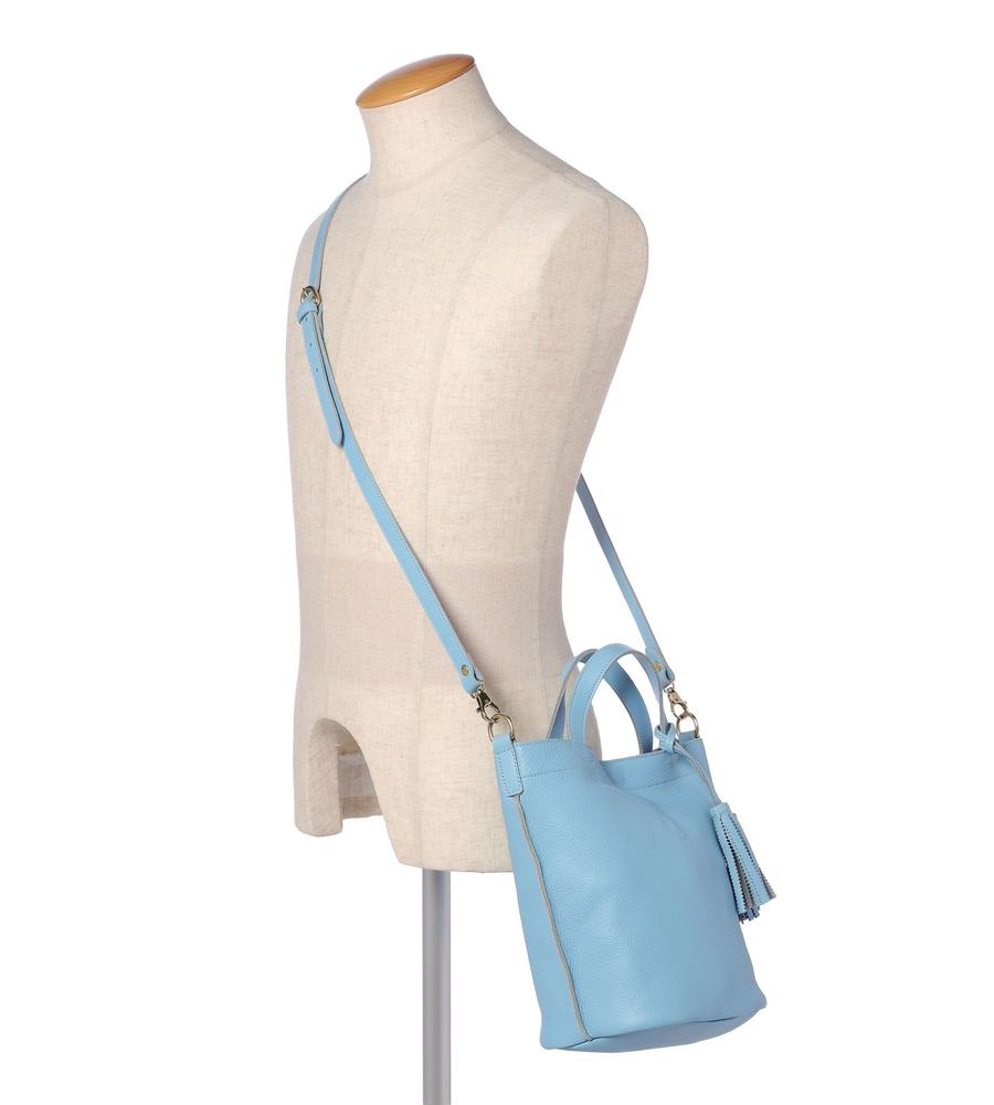 広めの底マチを備えたバケツ型の2wayレザーバッグ。優しい色味と柔らかな質感がエレガント。内側は裏地のない仕様で、便利なオープンポケットを設置。ショルダーストラップとチャームが付属し、持ち方のアレンジも楽しめます。