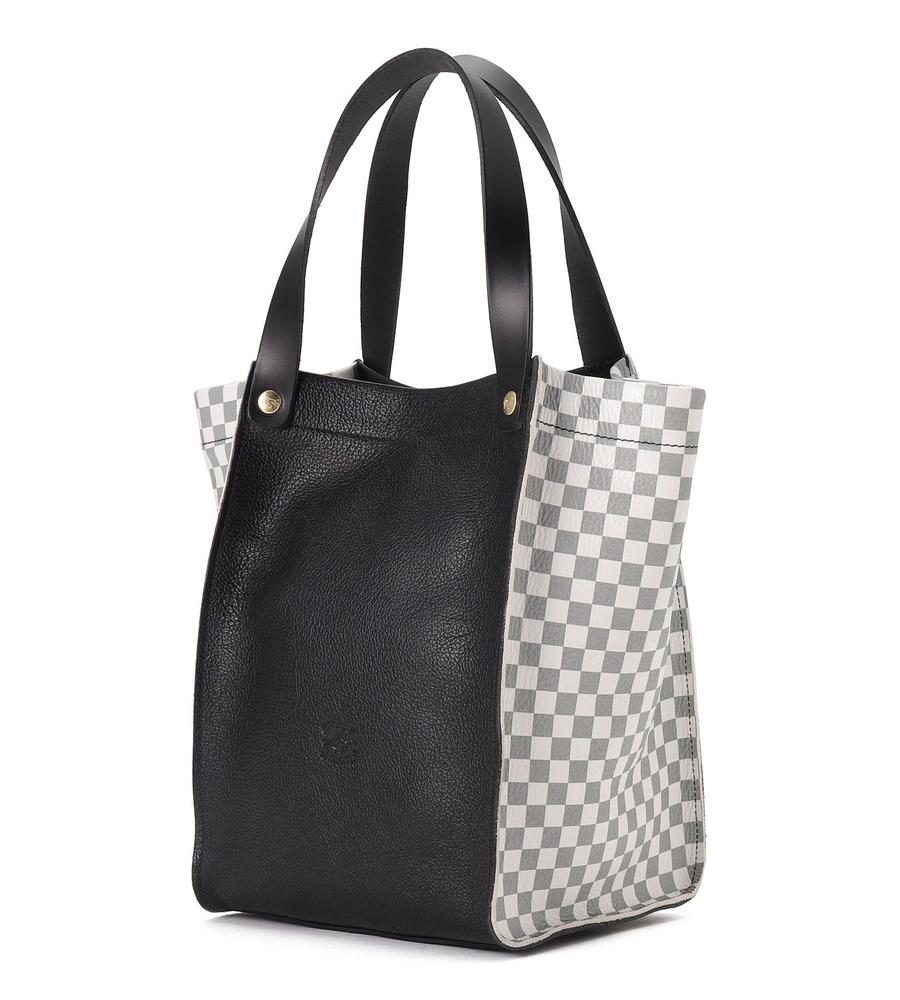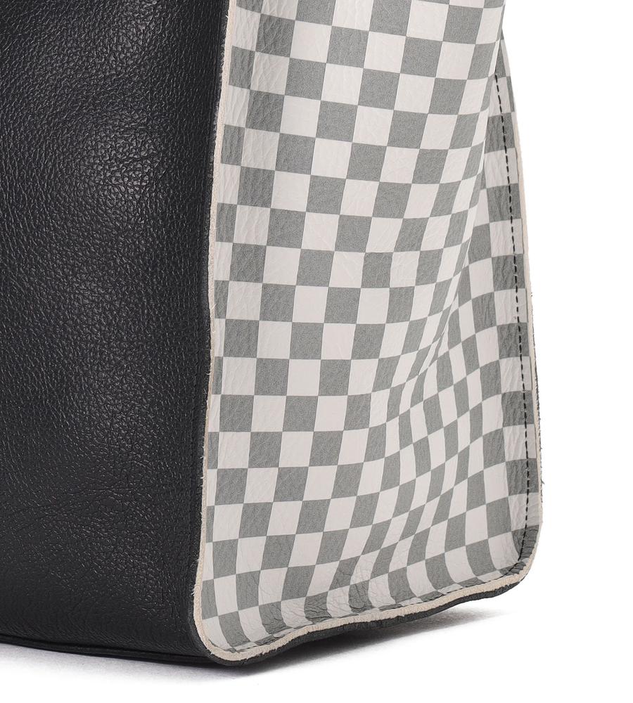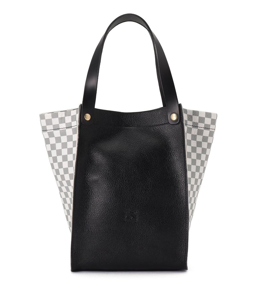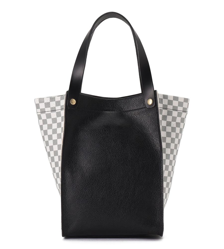 ブランドの魅力でもある上質なレザーで仕立てたトートバッグ。マチの部分のチェッカーボード柄がおしゃれなデザイン。フロントにはブランドロゴの型押しがさりげなくスタイリッシュなデザイン。マチが広く、使い勝手も抜群なのもうれしいポイントです。