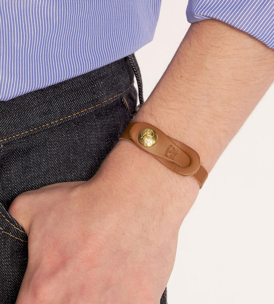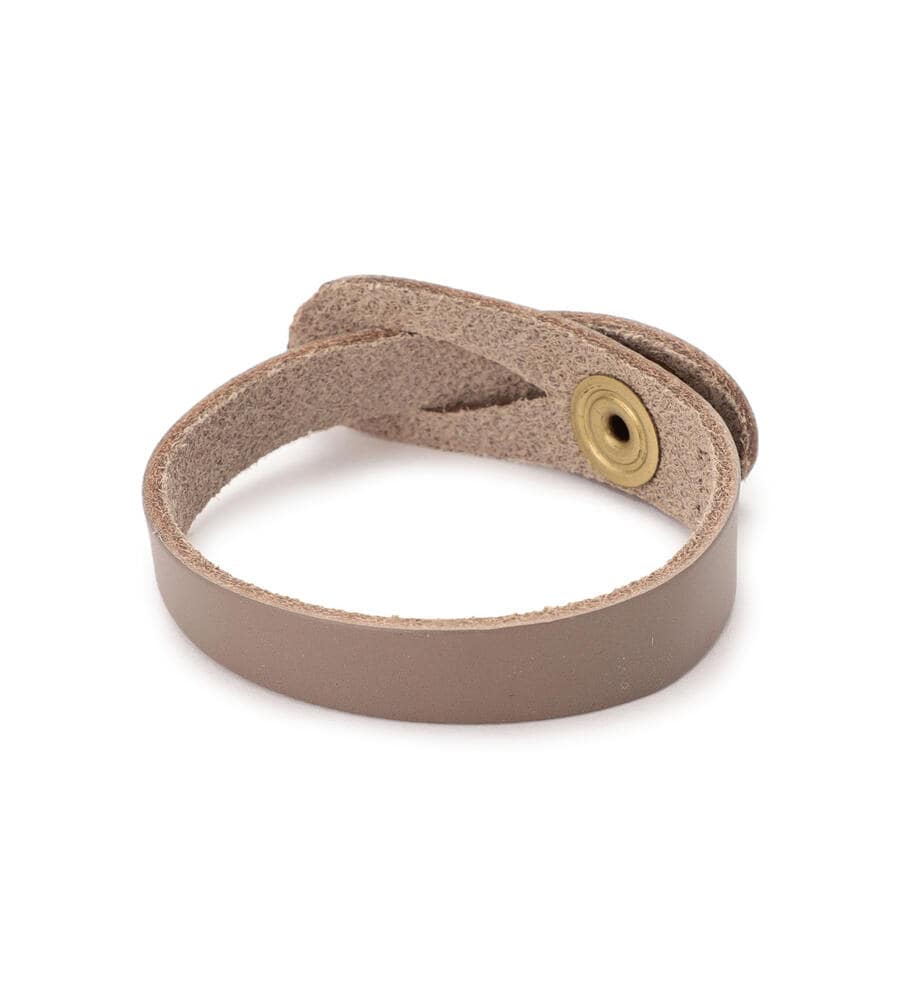 オリジナルのバケッタレザーを採用したシンプルなブレスレット。スナップボタン仕様なので、着脱がスムーズに行えます。ユニセックスなデザインなので、男女ともにお使いいただけます。ギフトとしてもおすすめのアイテムです。