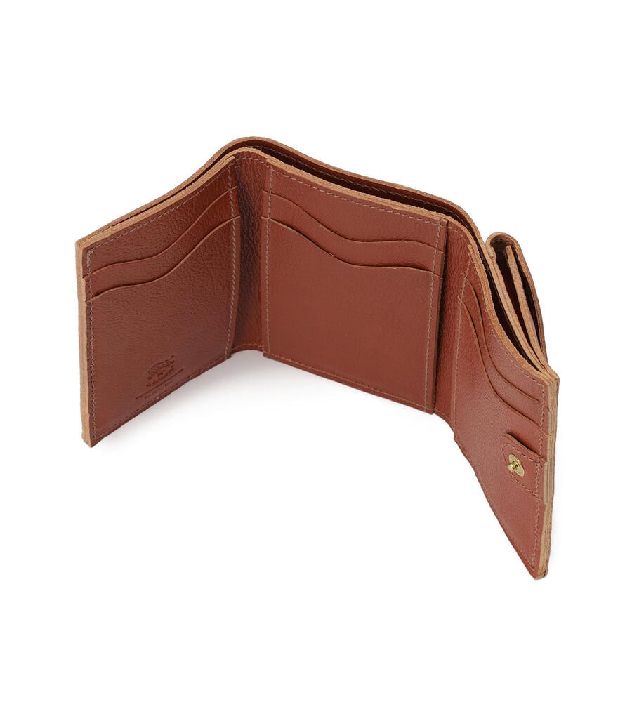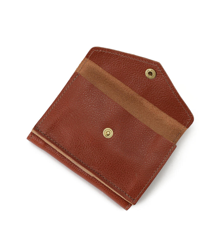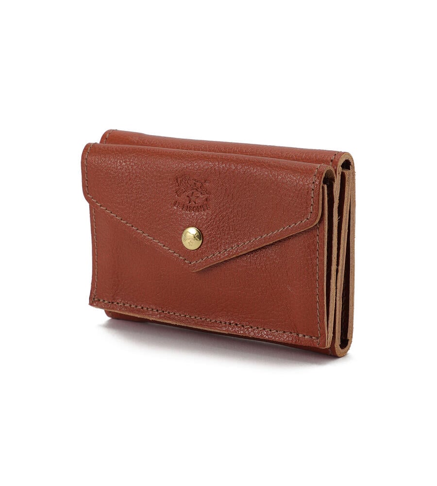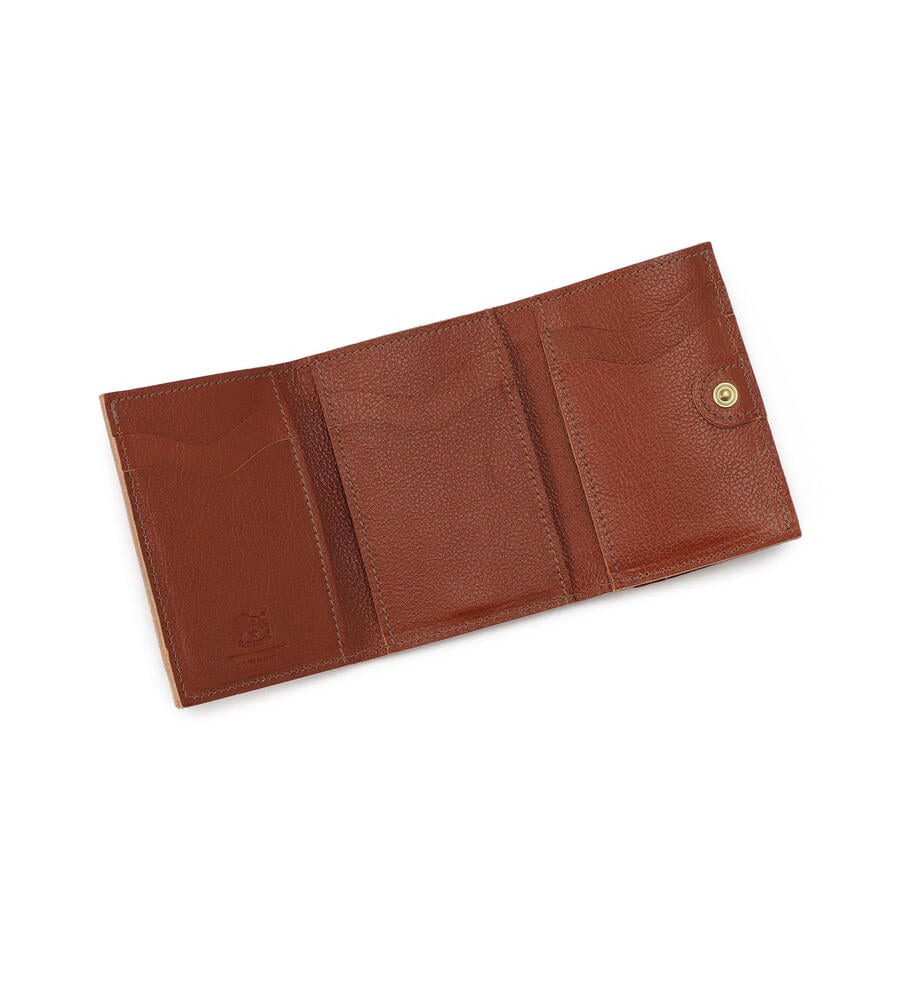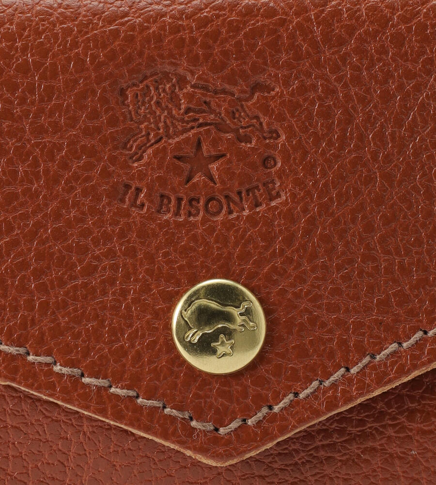 表情豊かなレザーの質感を楽しめる、フラップデザインのトリフォルドウォレット。コインポケット、カードホルダー、札入れを備えており、収納力は満足度大。フラップにさりげなくバイソンロゴの型押しがほどこされています。