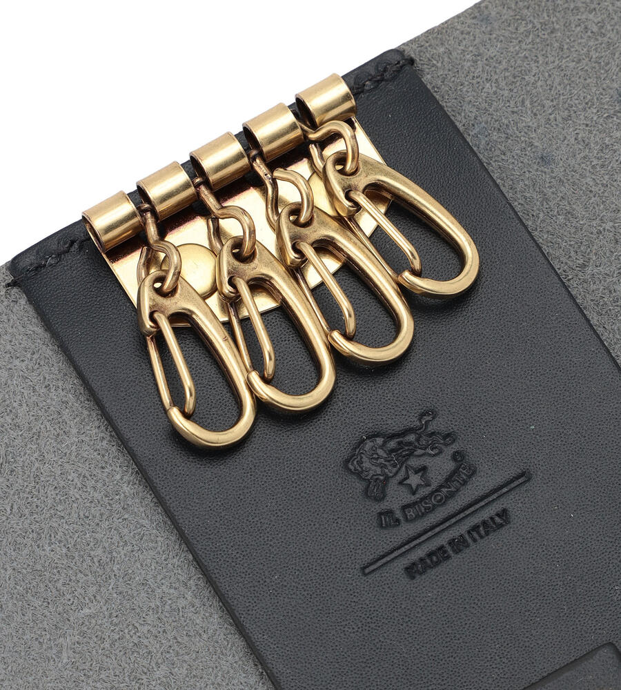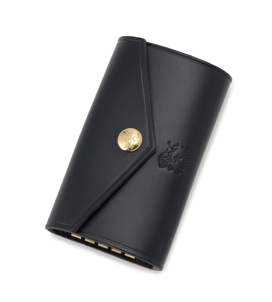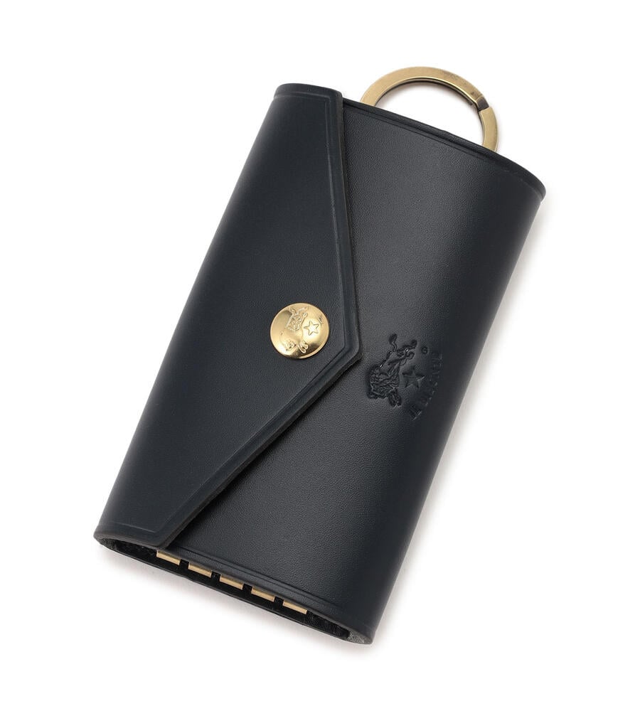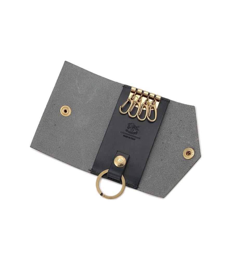存在感溢れるゴールドボタンとブランドロゴの型押しがあしらわれたエレガントなルックスのレザーキーケース。内部にはキーリングと4つのキーフックを備えており、収納力は満足度大。スナップボタン開閉でスムーズに鍵を取り出せます。