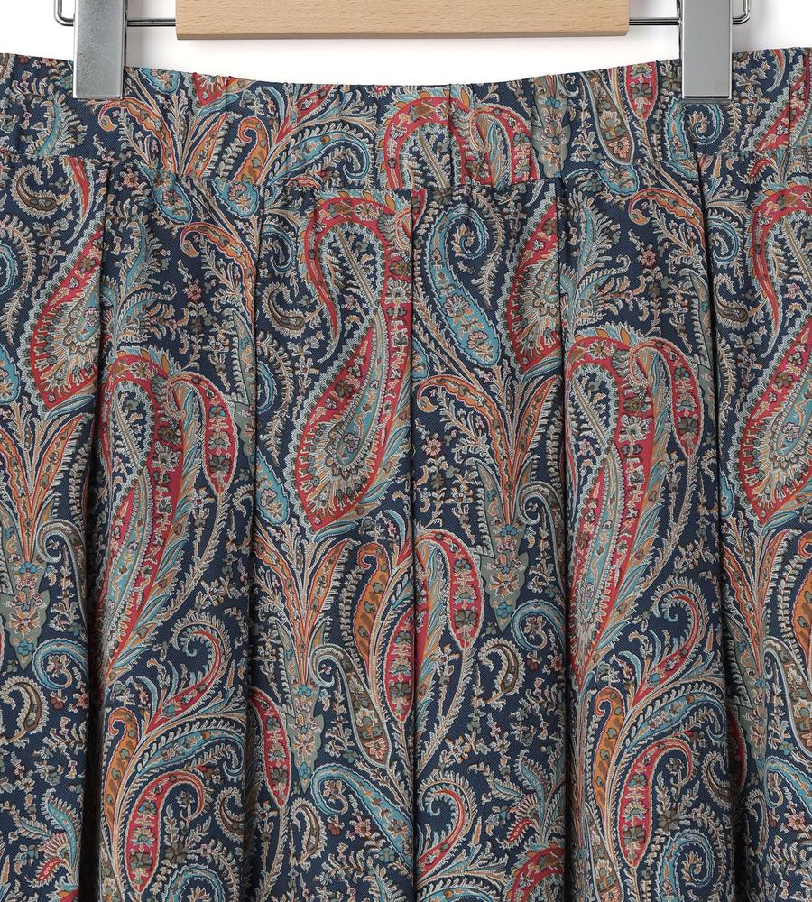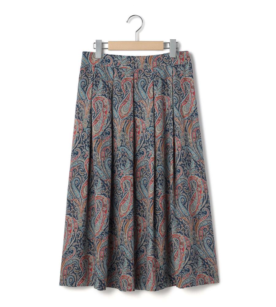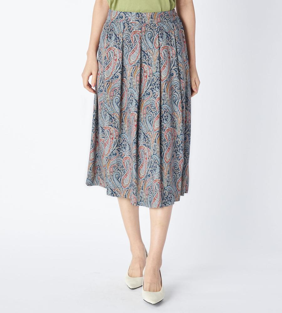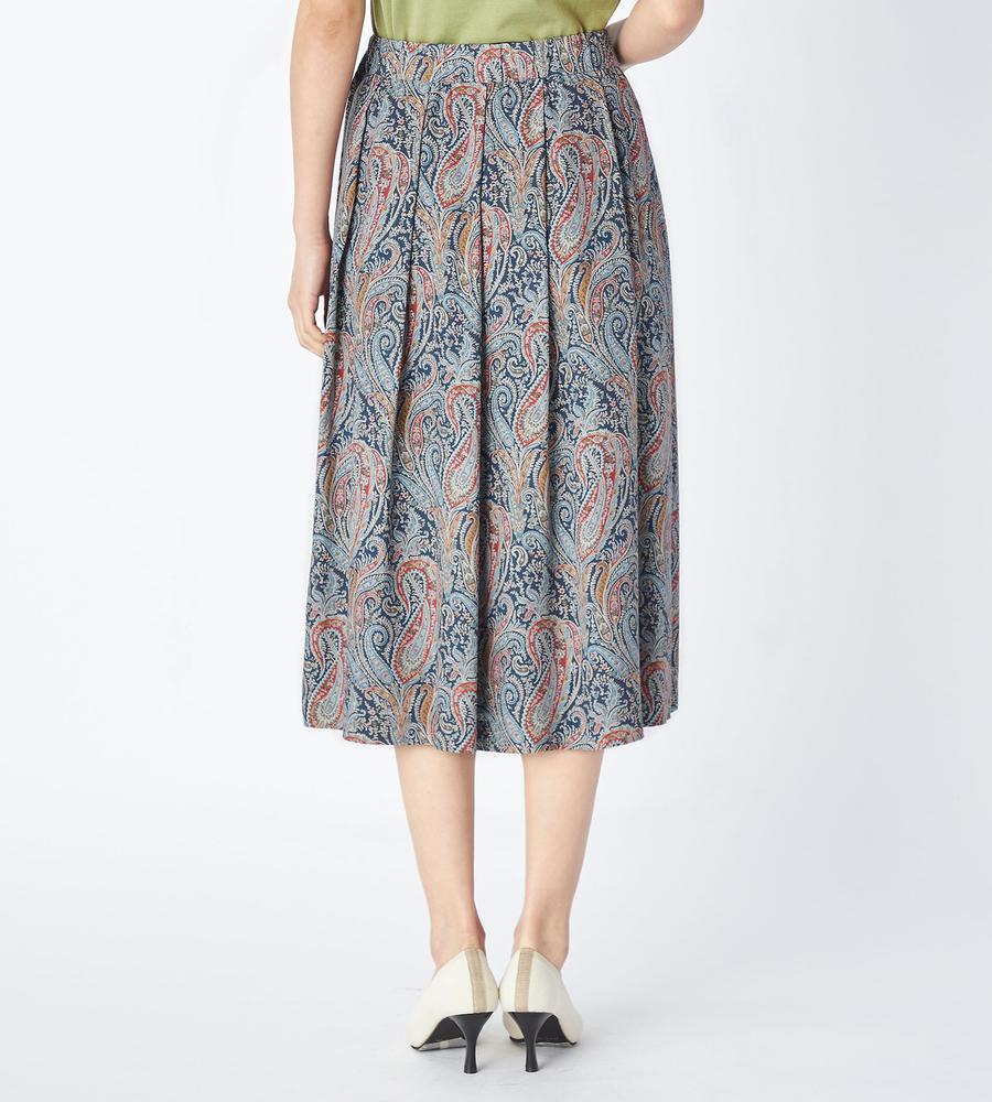 遠目にも存在感たっぷり、華やかな着こなしをかなえてくれるペイズリー柄のスカートです。膝がかくれるきちんと感のあるミディ丈、動きにあわせて広がるタックプリーツをあしらいました。ウエストの後ろはゴム切り替えでトップスINしやすくお腹まわりも楽ちん、あえてカジュアルなTシャツとの組み合わせもおすすめです。