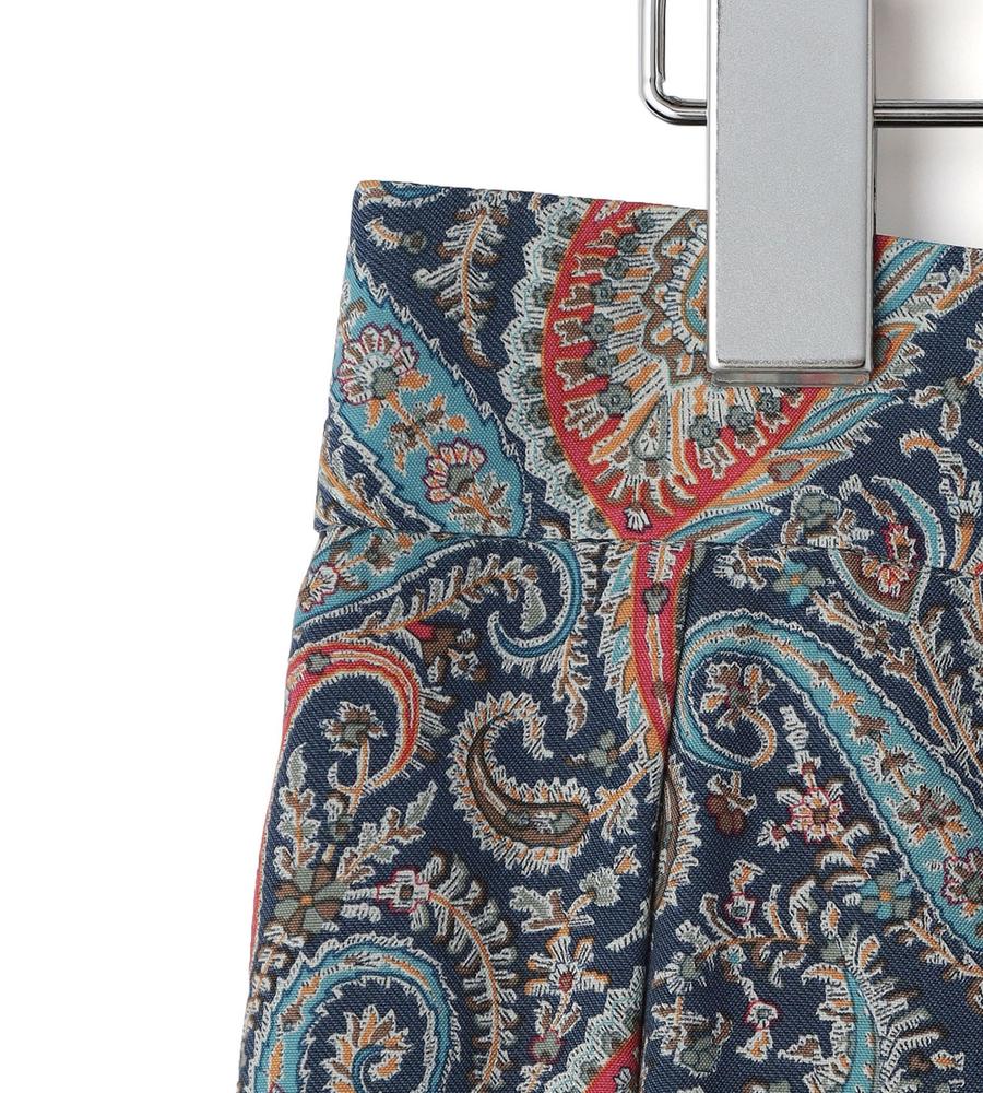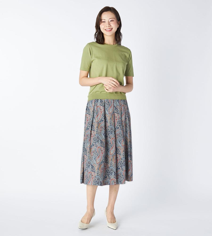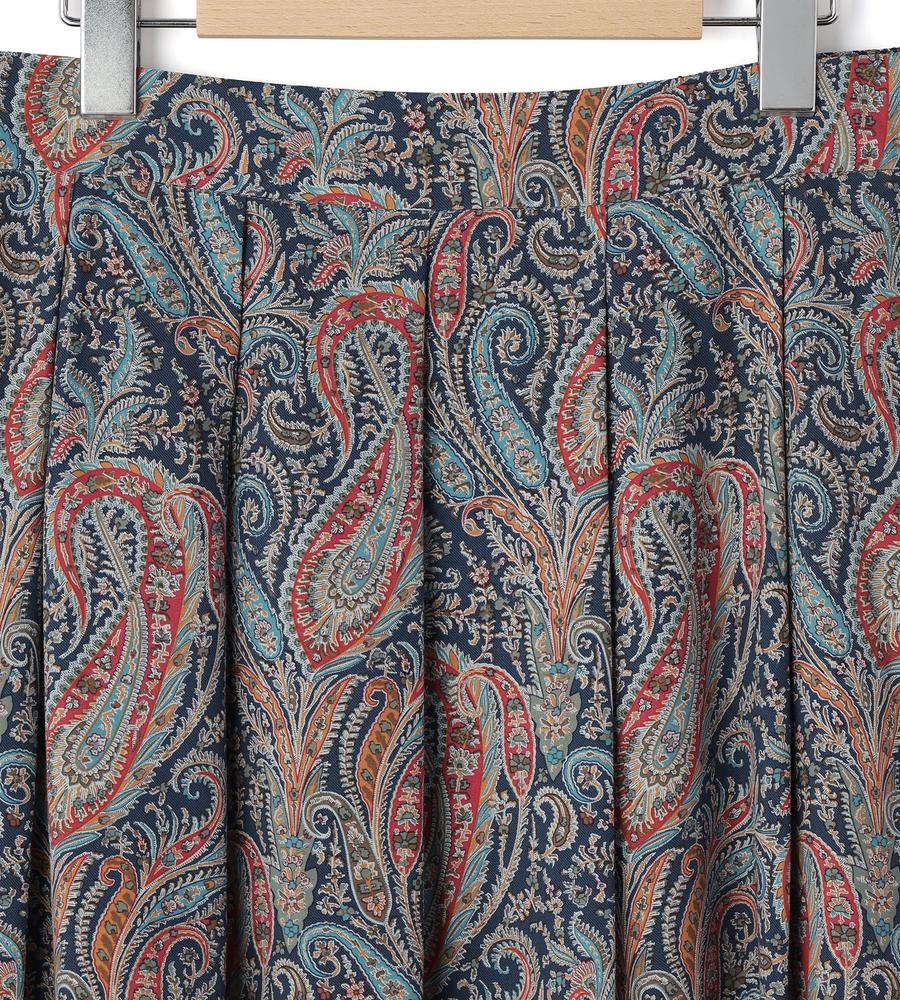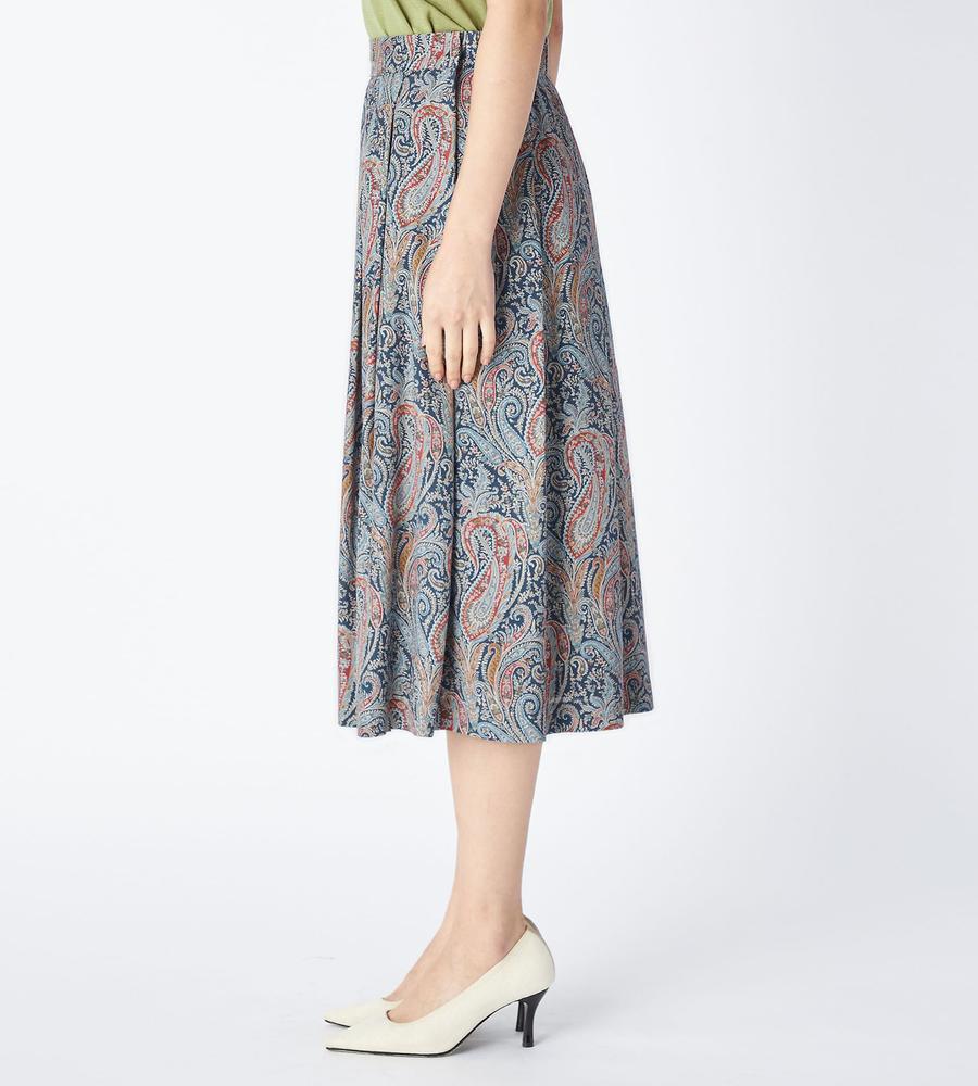 遠目にも存在感たっぷり、華やかな着こなしをかなえてくれるペイズリー柄のスカートです。膝がかくれるきちんと感のあるミディ丈、動きにあわせて広がるタックプリーツをあしらいました。ウエストの後ろはゴム切り替えでトップスINしやすくお腹まわりも楽ちん、あえてカジュアルなTシャツとの組み合わせもおすすめです。