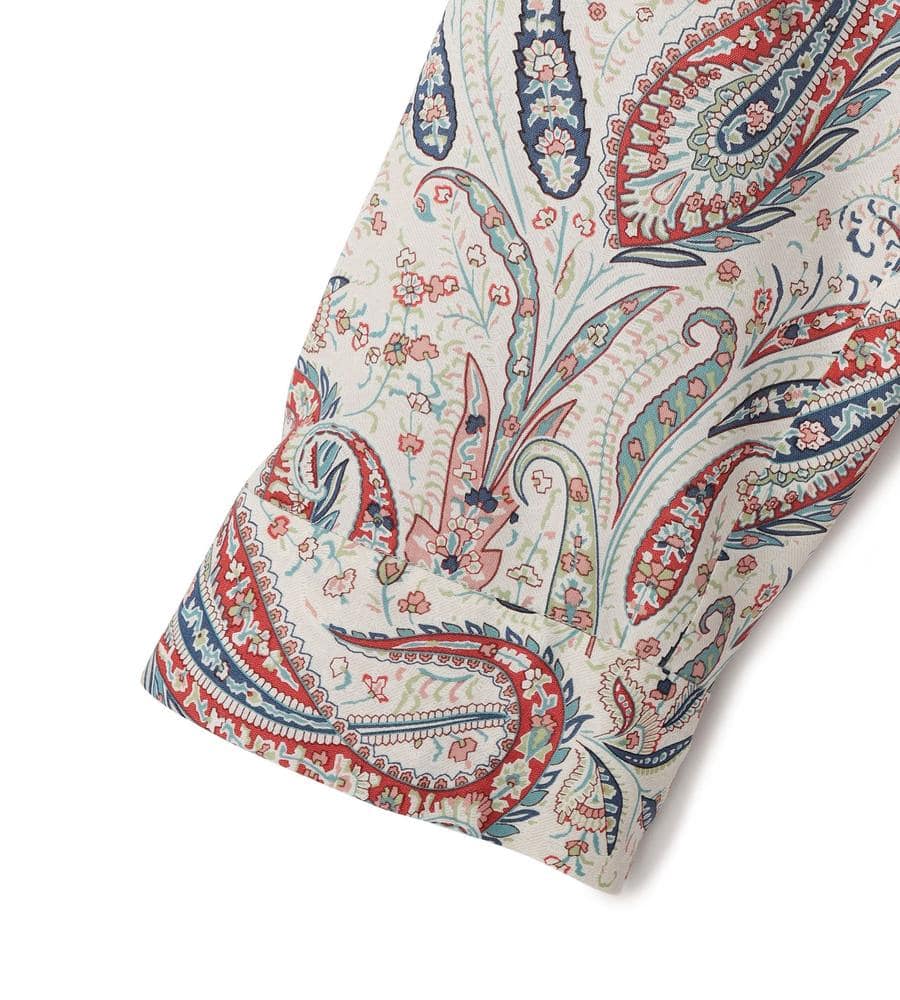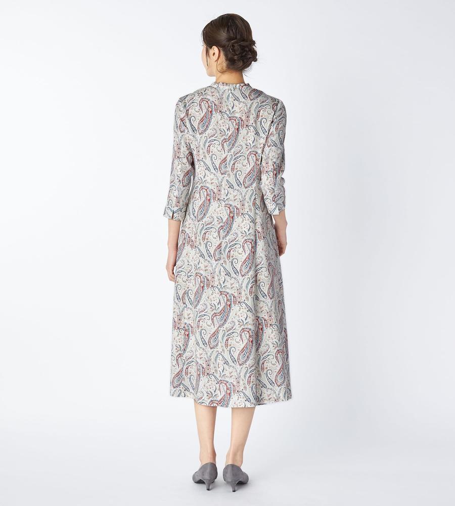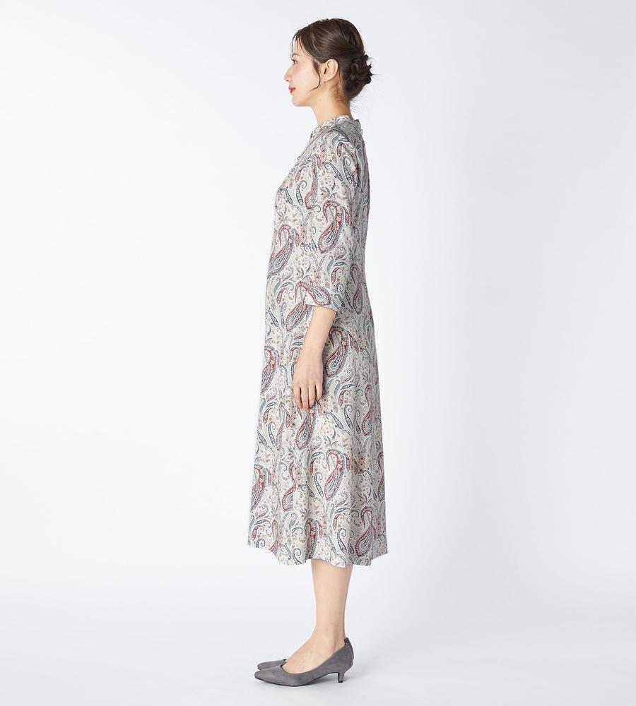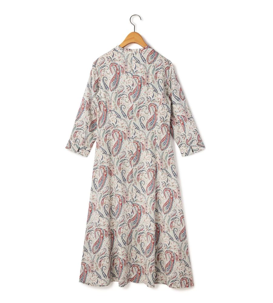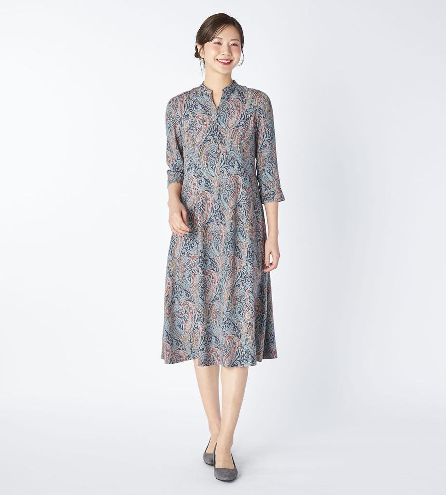 遠目にも存在感たっぷり、華やかな着こなしをかなえてくれるペイズリー柄のロング丈ワンピースです。顔まわりをすっきりと見せてくれるマオカラーが、カジュアルなのにきちんと洗練された雰囲気を作ってくれます。これ1着でトータルコーデがかなう主役アイテムで、リゾートやパーティーにもぴったりです。