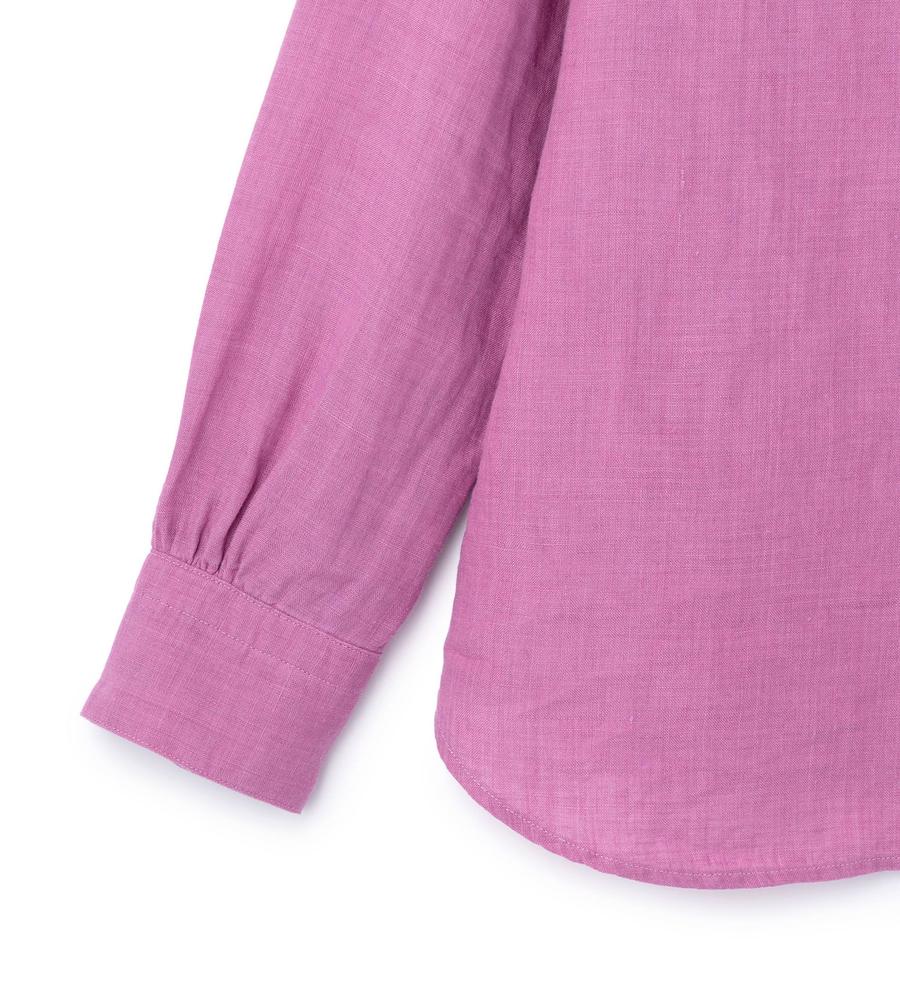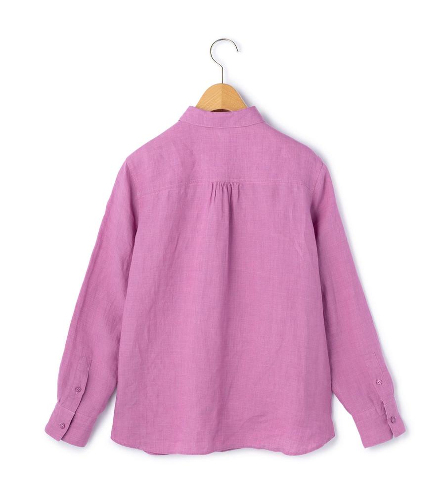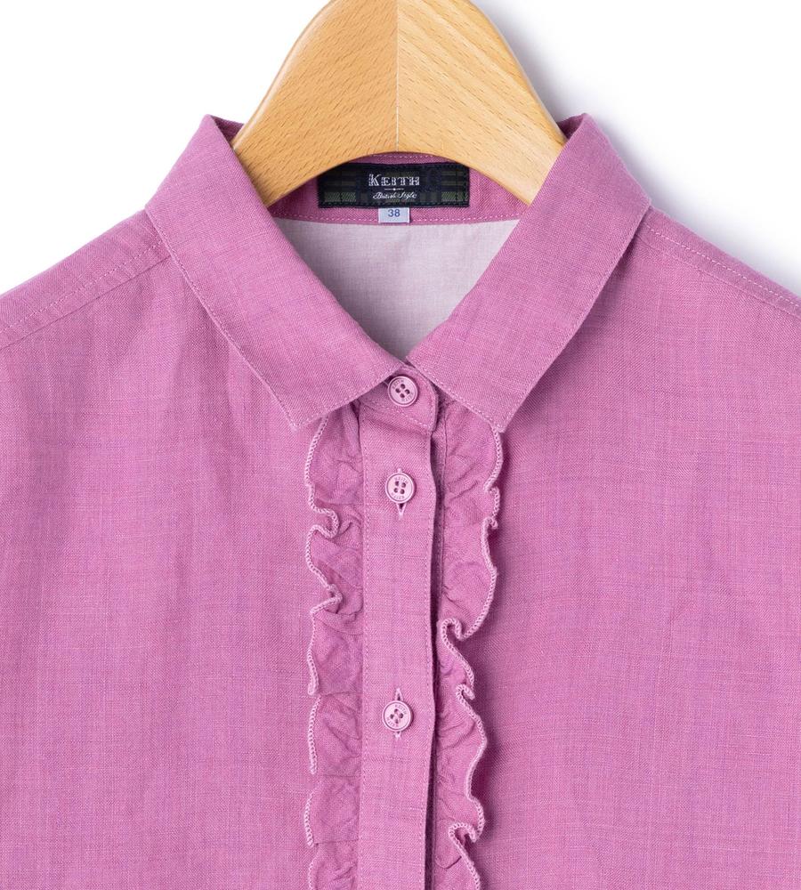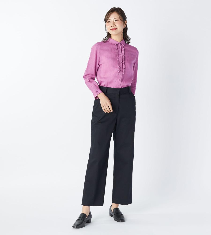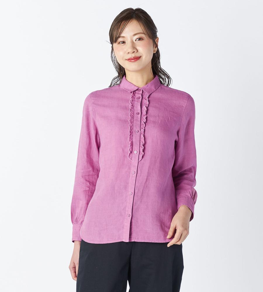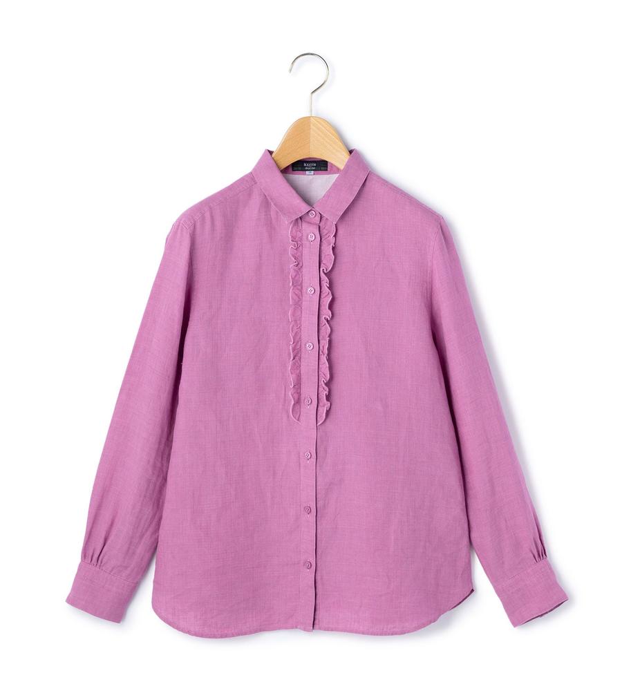 天然素材ならではの風合いをお楽しみいただける、麻素材のロングスリーブブラウスです。細かなフリル使いにより、さりげなく女性らしさを演出しているのが魅力。裾にラウンドカットが施されているため、ボトムからタックアウトしたスタイリングもお楽しみいただけます。インナーに着てもフリルがポイントに。