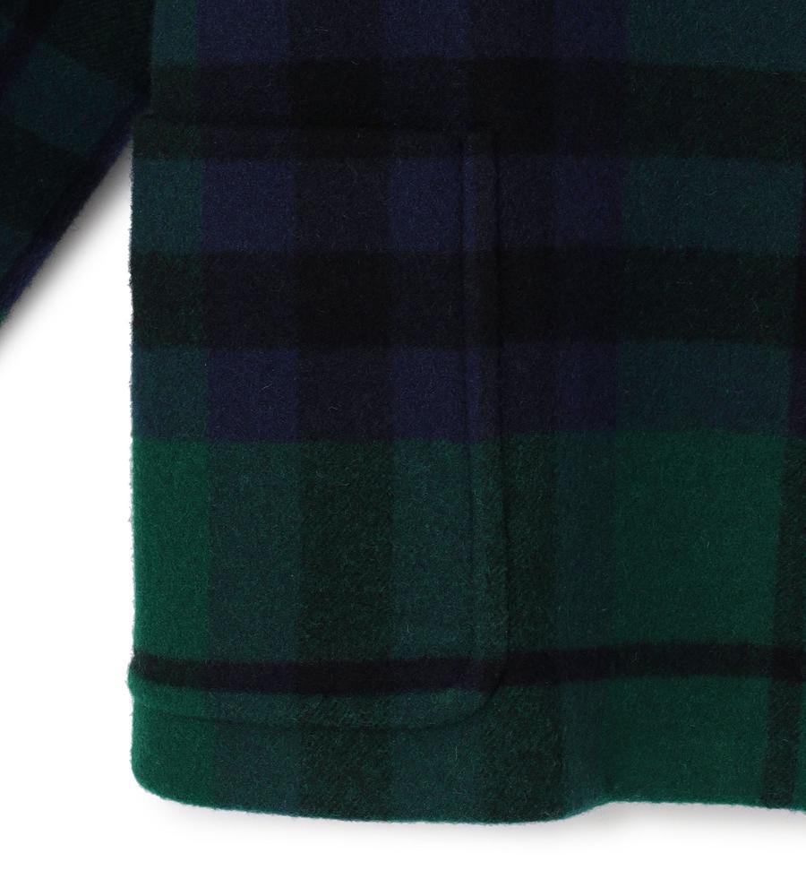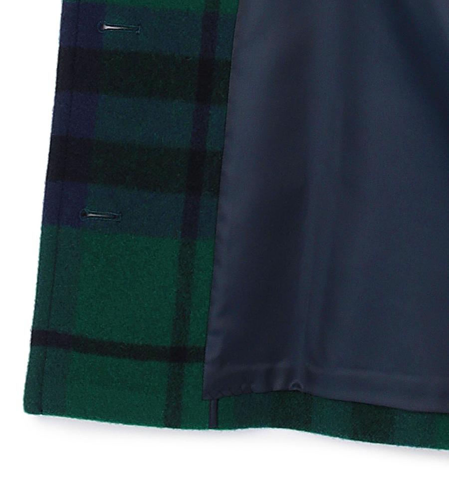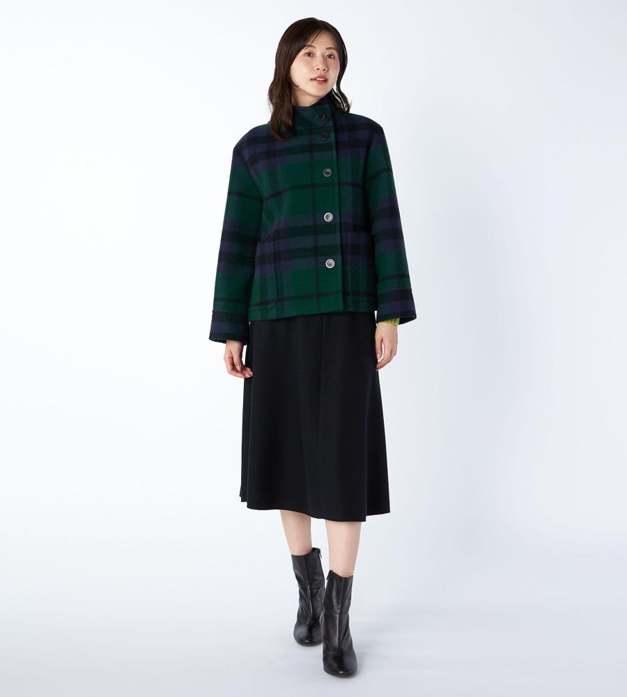 大きめの総チェック柄が印象的なコート。スタンドカラーと、アシンメトリーなフロントデザインがスタイリッシュなデザインディティール。様々なボトムとバランスよく着こなせる長すぎない腰下丈。便利なポケット付き。暗くなりがちな秋冬の着こなしに華やかなアクセントを与えてくれるアイテムです。