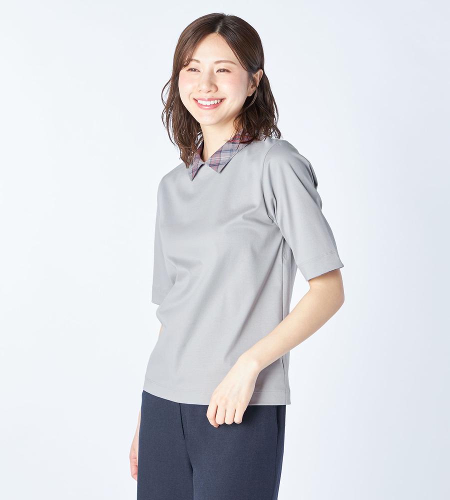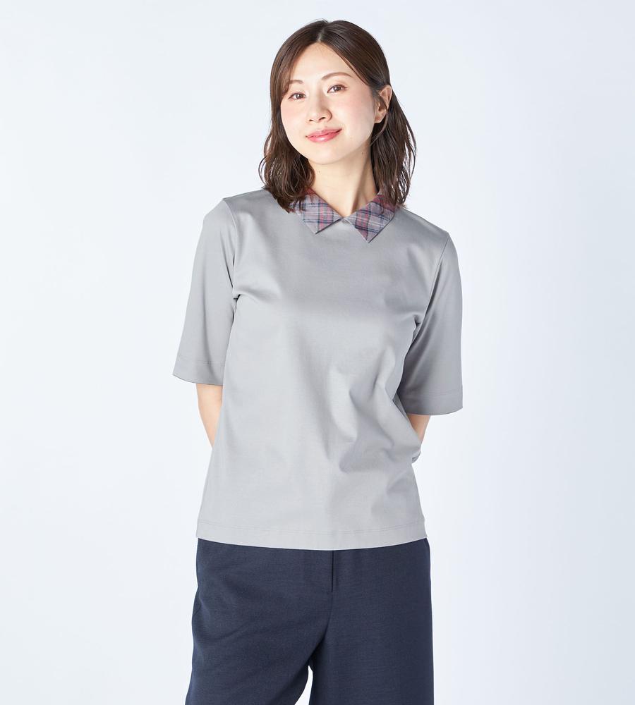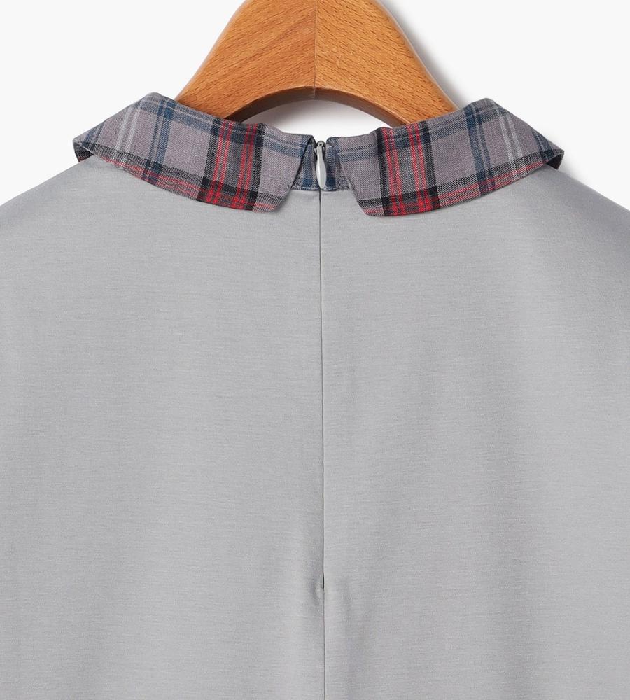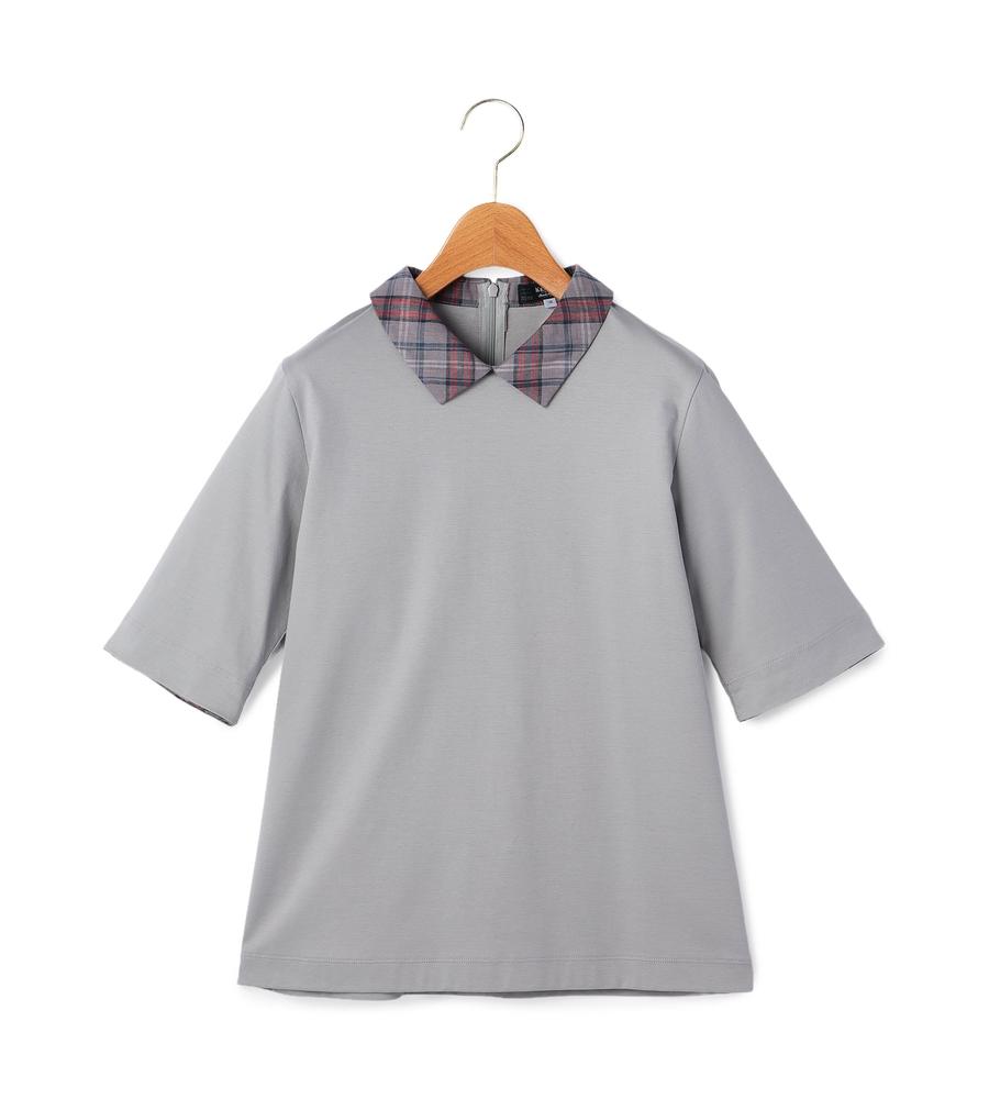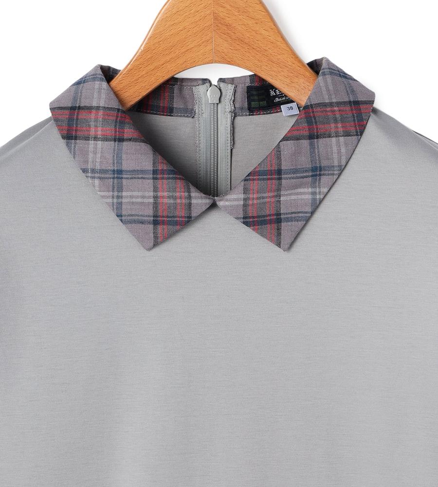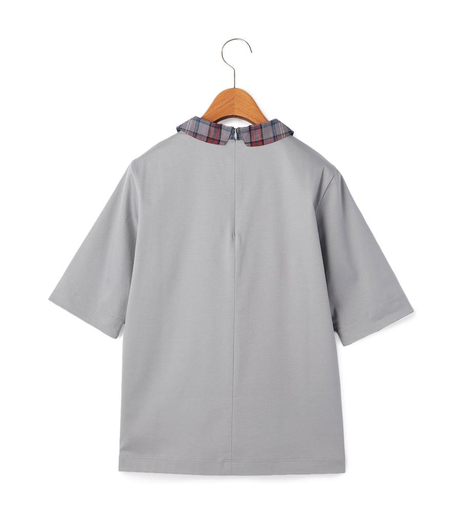 衿部分をチェック柄で切り替えた、異素材MIXデザインのプルオーバートップスです。背中側にジップを付けた脱ぎ着のしやすいデザイン、これ1着でレイヤード風のスタイルがお手軽にかないます。これからの季節にぴったりなサラッとした着心地も魅力です。
