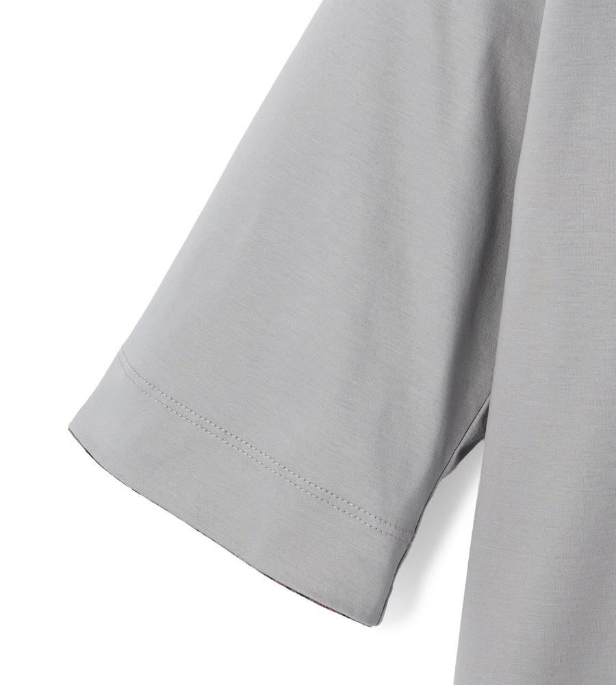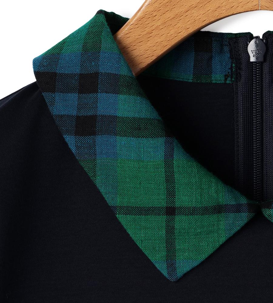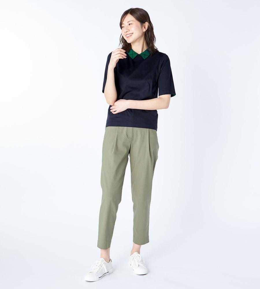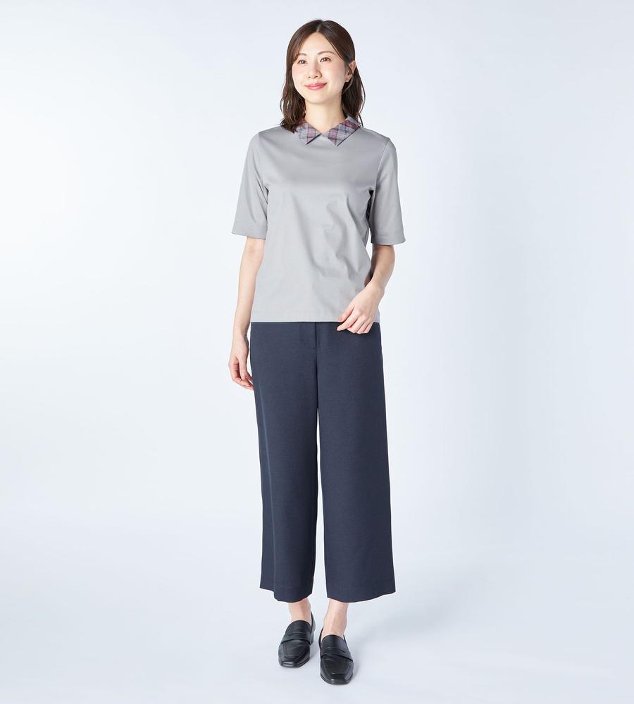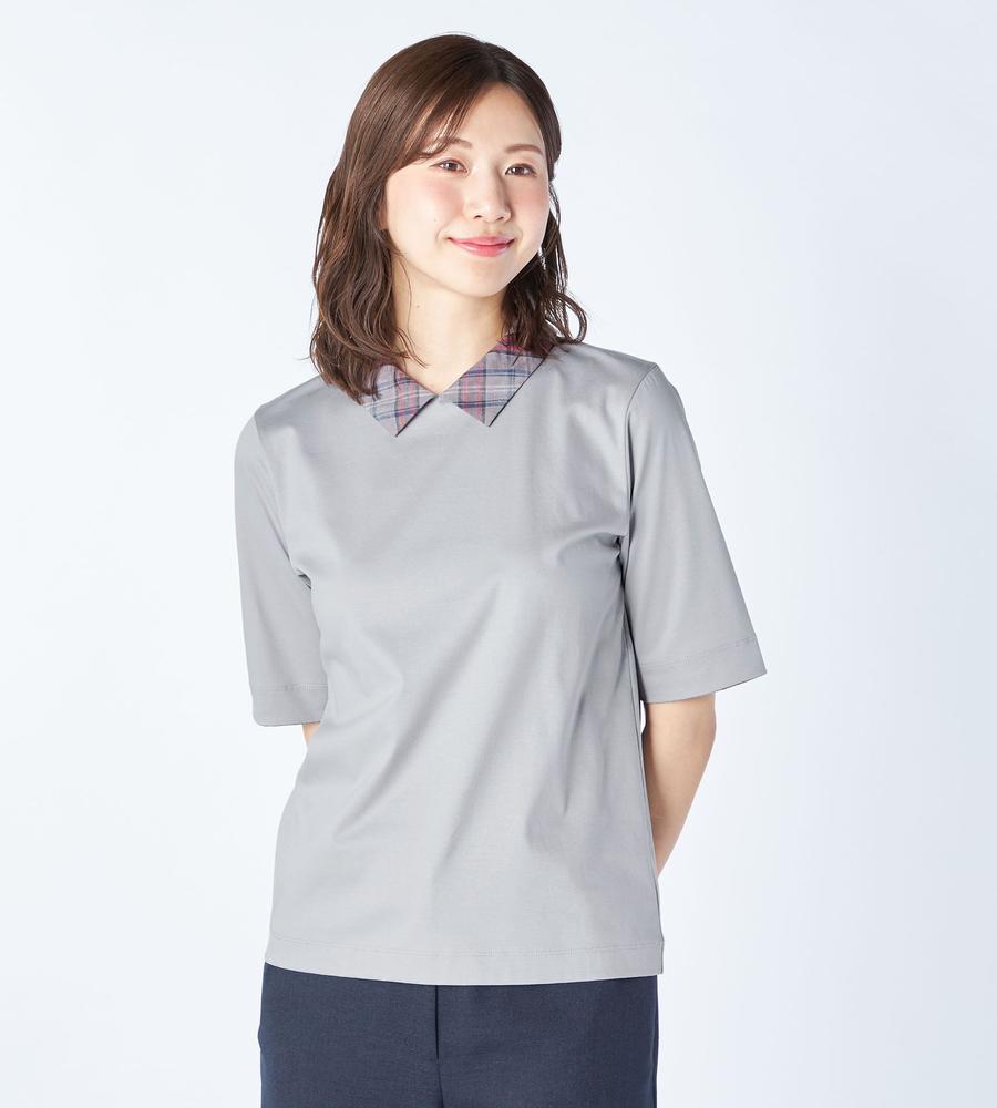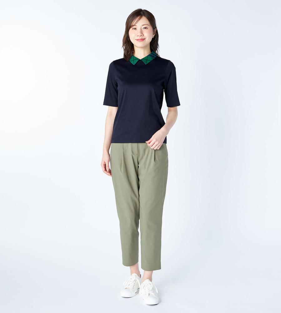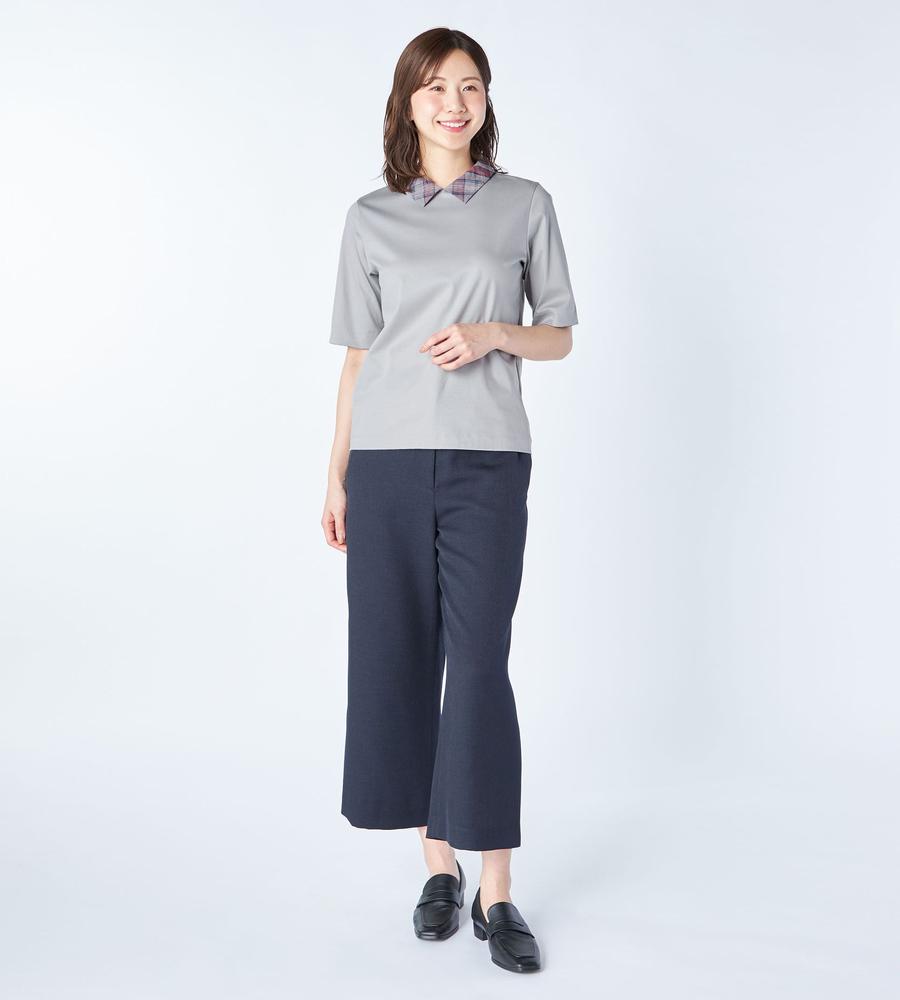 衿部分をチェック柄で切り替えた、異素材MIXデザインのプルオーバートップスです。背中側にジップを付けた脱ぎ着のしやすいデザイン、これ1着でレイヤード風のスタイルがお手軽にかないます。これからの季節にぴったりなサラッとした着心地も魅力です。
