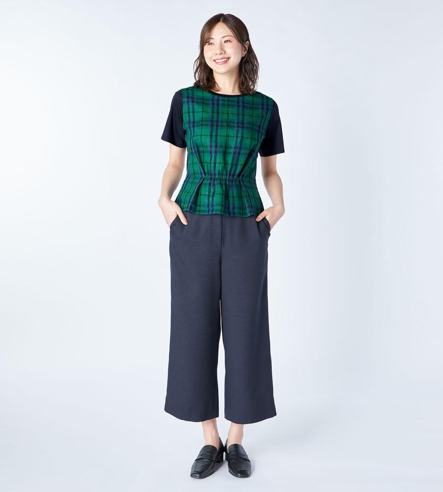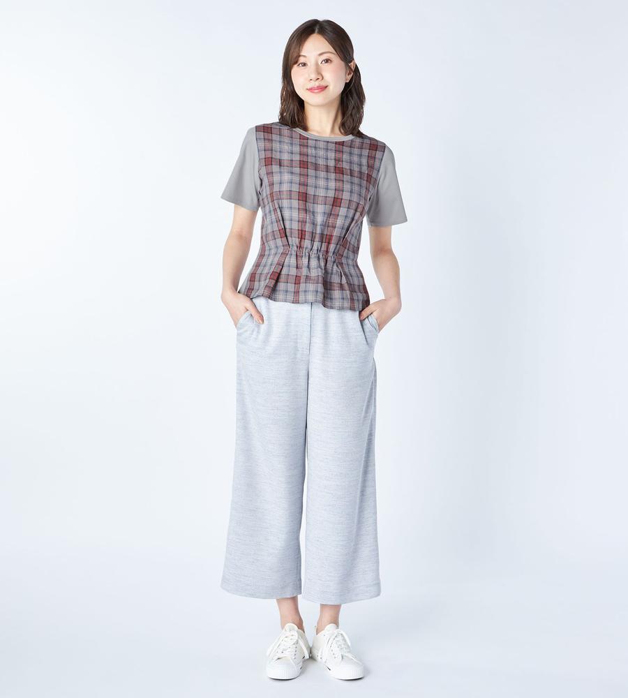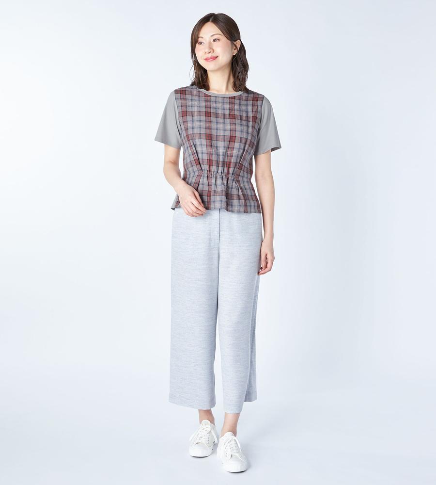 前身ごろをチェック柄で切り替えた、異素材MIXデザインのプルオーバートップスです。ウエスト部分にギャザーをよせたデザインで、そのまま着るだけでくびれコンシャスな着こなしをかなえてくれます。これからの季節にぴったりなサラッとした着心地も魅力です。