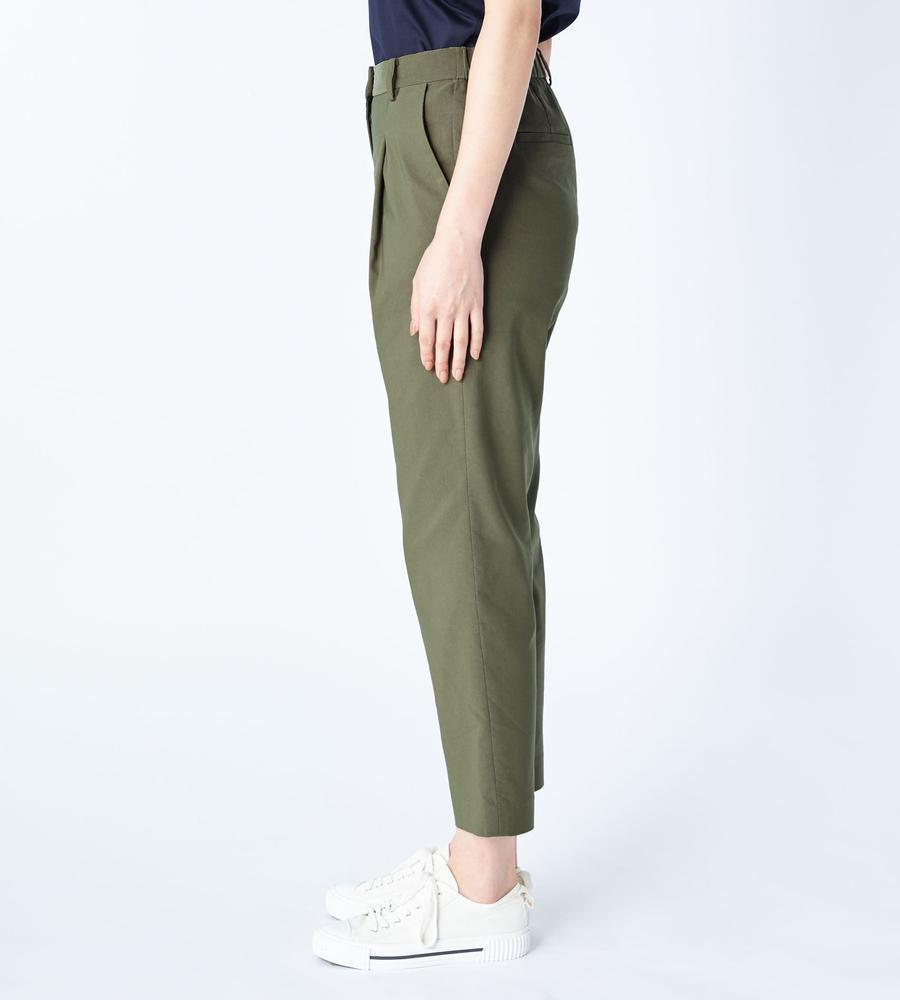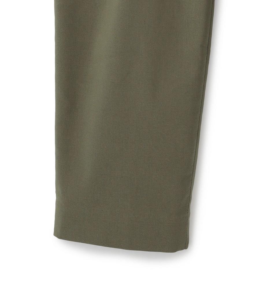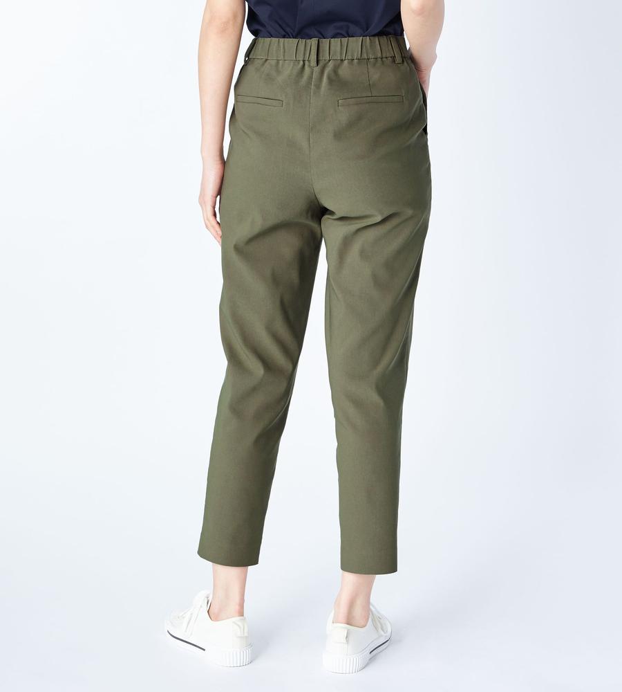 体の動きにあわせてフィットするストレスフリーな着心地が魅力、ストレッチ性に優れた素材で仕上げたパンツです。腰から太ももにかけてゆとりを持たせたテーパードシルエット、足首がのぞくクロップド丈が肌見せの抜け感を作ります。ウエストの後ろはゴム切り替えで楽ちん、トップスINもすっきり決まるデザインです。