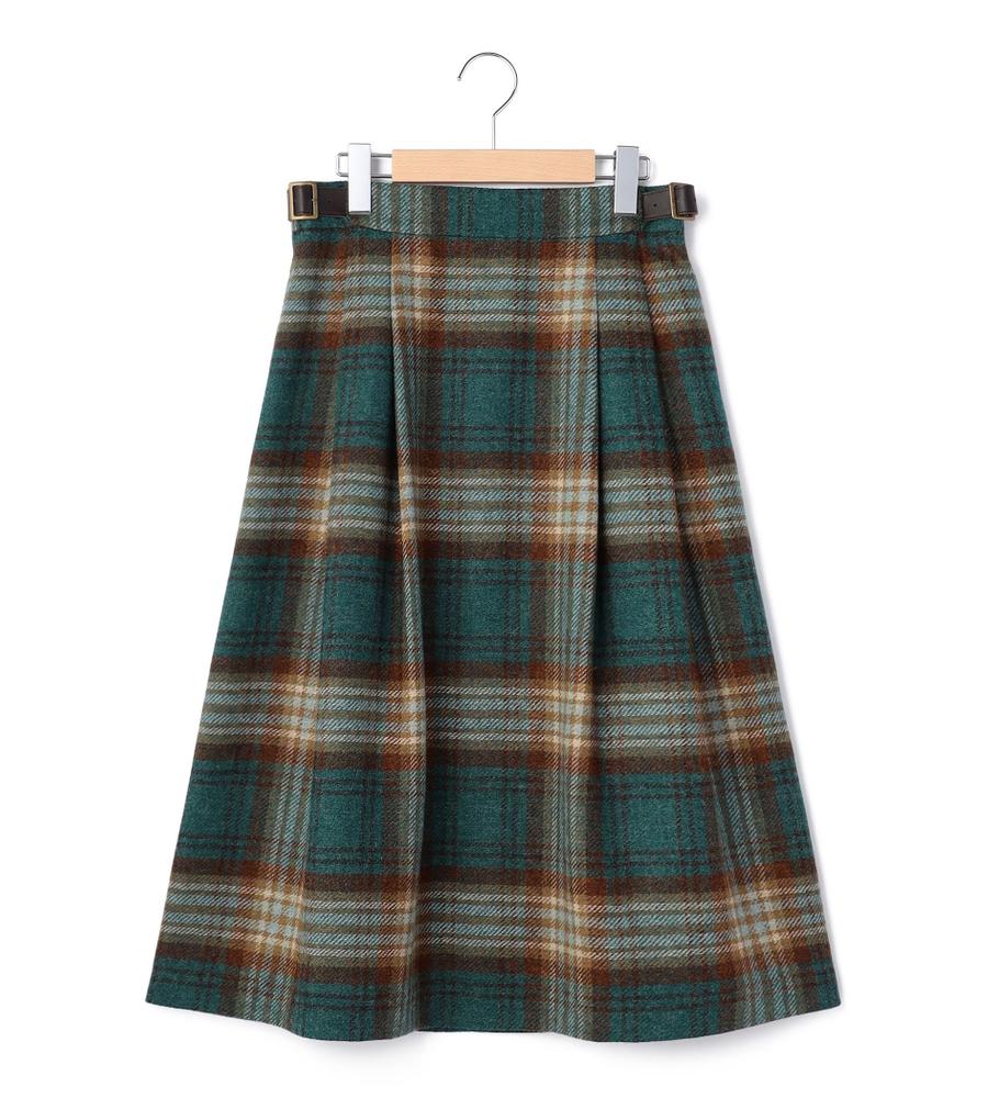 タータンチェック柄のミディ丈スカート。ウエストサイドのレザーベルトがおしゃれなデザインアクセント。フレアに広がる、タック入りでドレープ感のあるシルエットがフェミニンなポイント。毛100%のあたたかな生地感で秋冬シーズンらしい着こなしに最適。スタイリッシュなお出かけコーディネートが完成する一枚です。