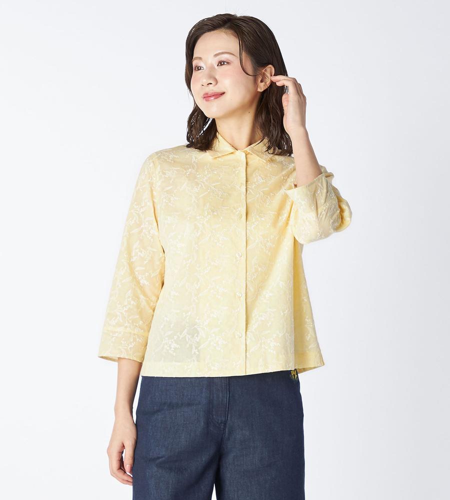 アイテム全体にミモザモチーフの刺繍をあしらったシャツです。きちんと品良く着られる定番の衿付きデザインで、1枚で着るのはもちろんジャケットやカーディガンのインナーとしても存在感を発揮します。ほど良い透け感のあるコットン素材と7分袖で、シーズン問わず長くお使いいただけるアイテムです。