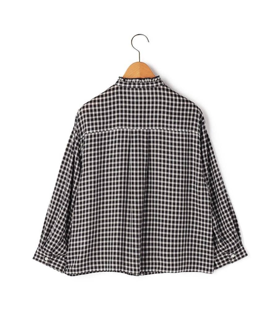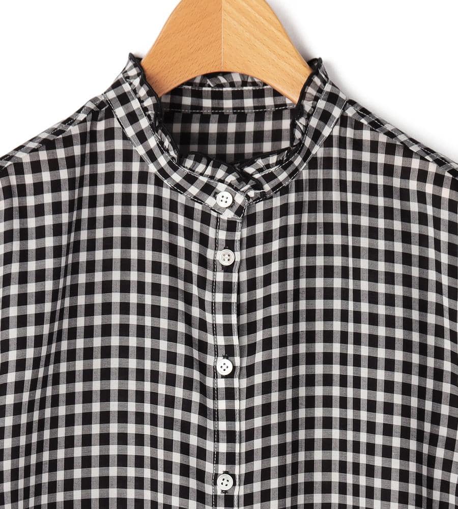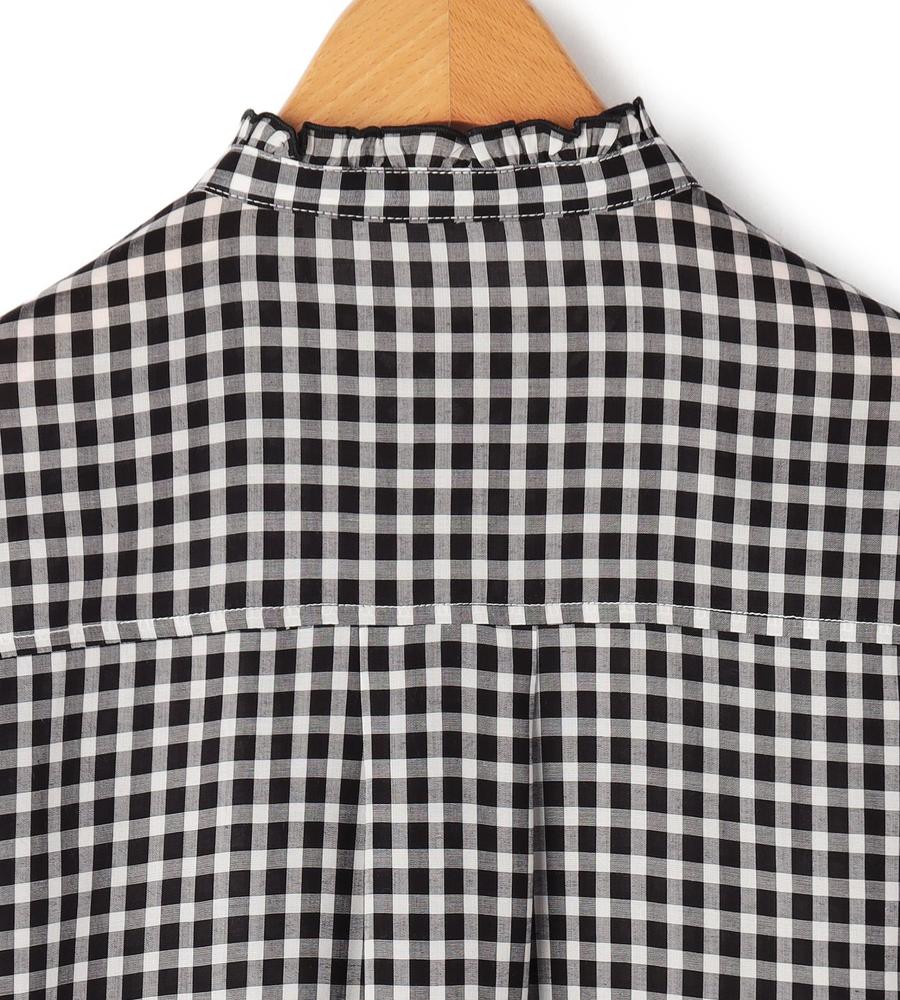 ギンガムチェック柄の7分袖スタンドカラーブラウス。襟にはフリルのあしらいがエレガントなデザインポイント。様々なボトムと着こなしやすいストレートカットの裾。スタイリングのアクセントになるおしゃれなデザインで、お出かけコーディネートにぴったり。ウォッシャブル仕様で自宅でお手入れできるのもうれしいポイントです。