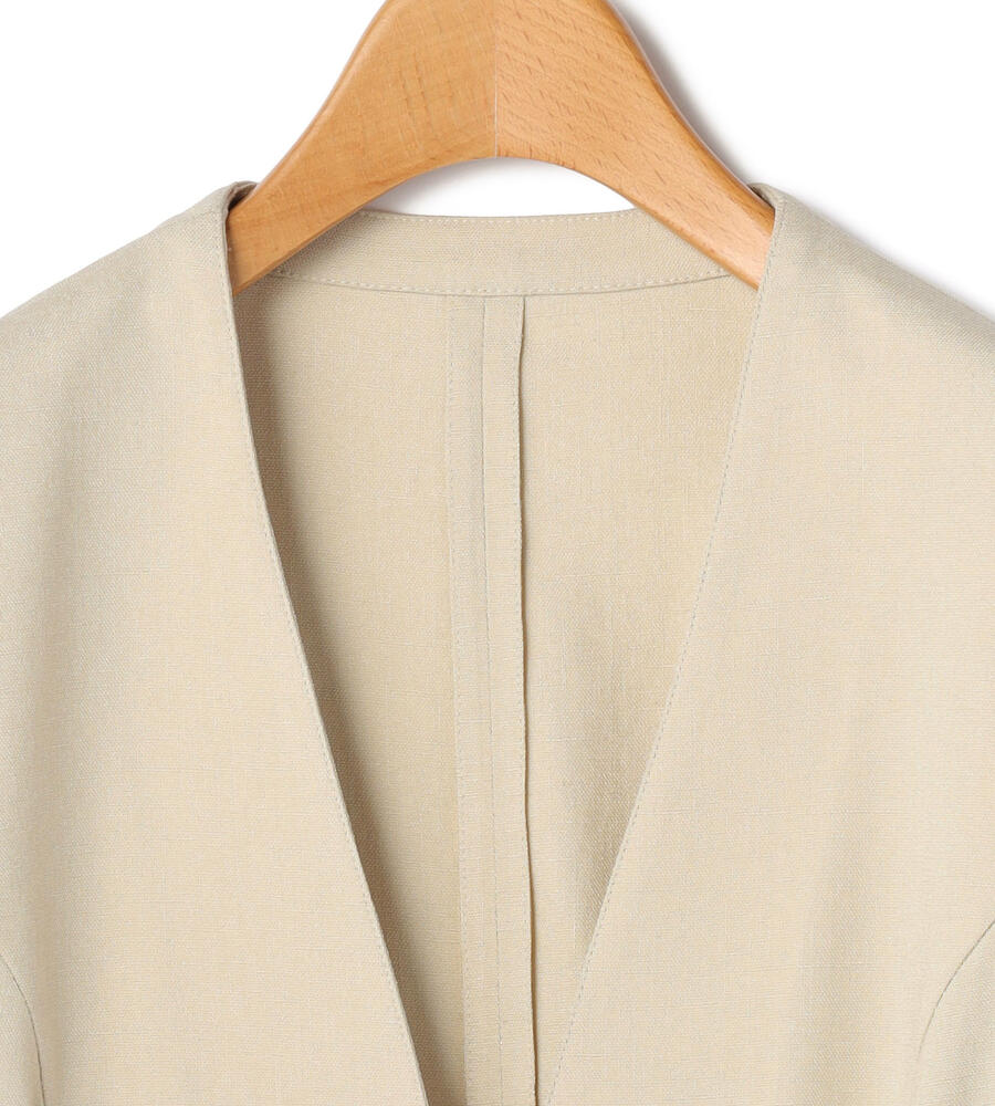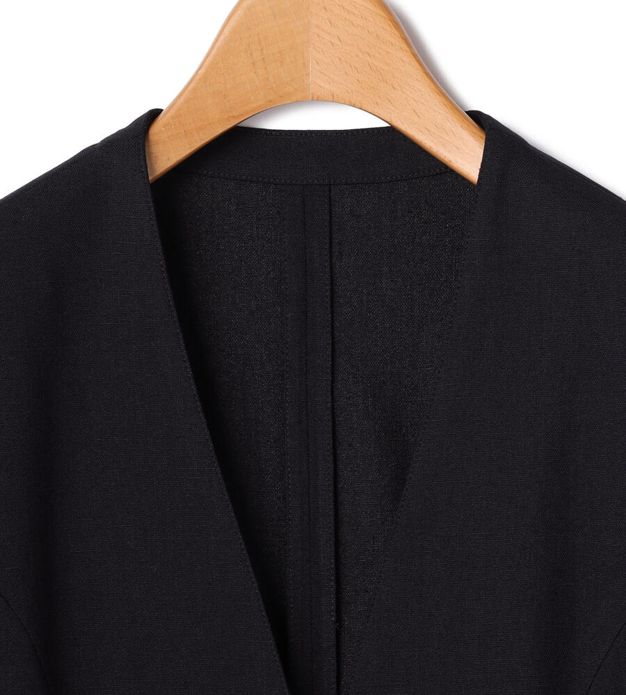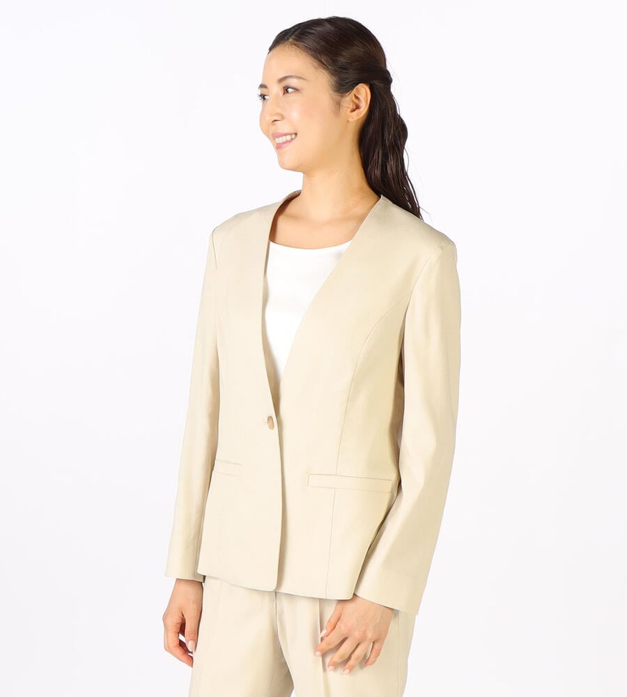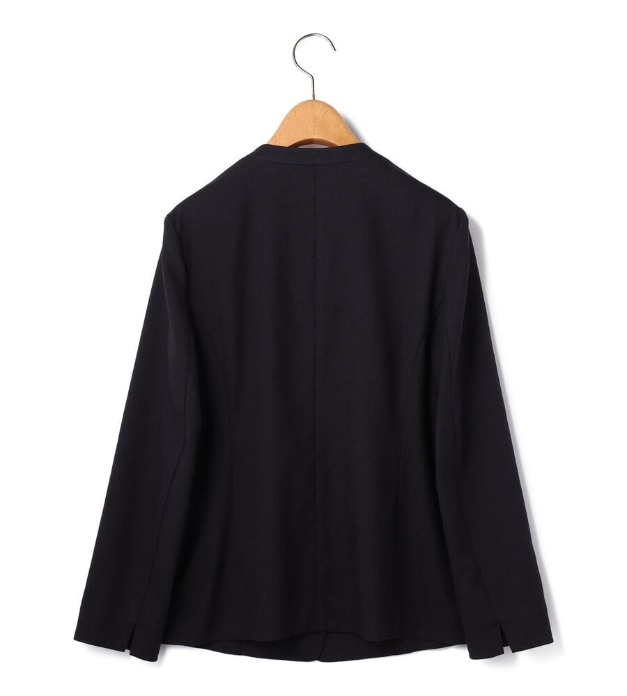 襟のないすっきりとしたノーカラーのシルエットが印象的な一つボタンジャケット。ストレッチ素材で、身体の動きにフィットしストレスフリーな着心地なのもうれしいポイント。シンプルかつエレガントなデザインで、合わせやすく汎用性抜群。お出かけからビジネスシーンまで幅広く活躍するアイテムです。