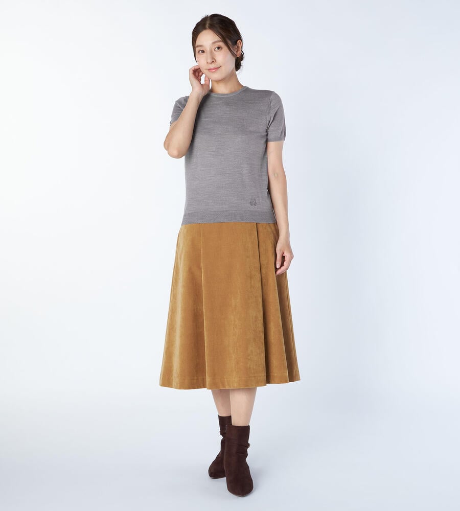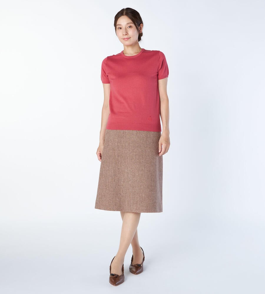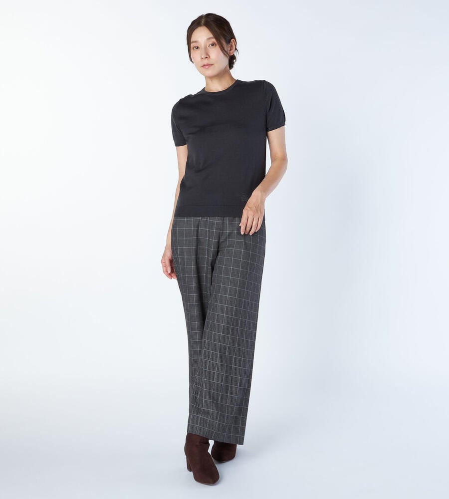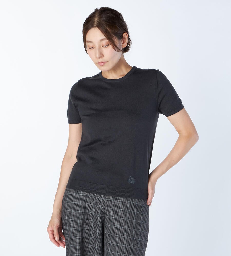 ウールにアクリルを織り交ぜた、しっとりとした落ち感が美しいハイゲージニットのトップスです。シーズンが切り替わる時季にも最適な半袖を採用しています。すっきりと身体に沿うシルエットは、シーンを問わず活躍します。同素材のカーディガンを合わせて、アンサンブルとしてもお楽しみいただけます。