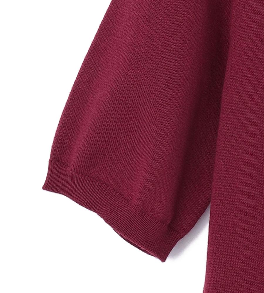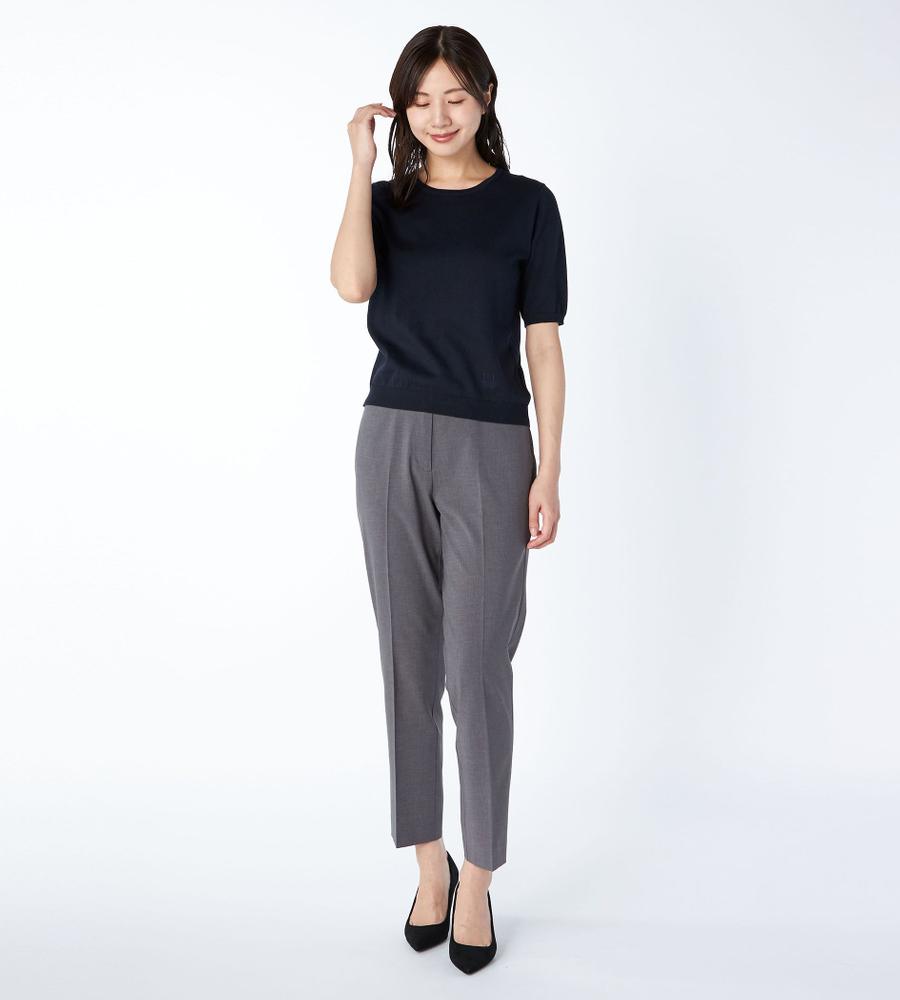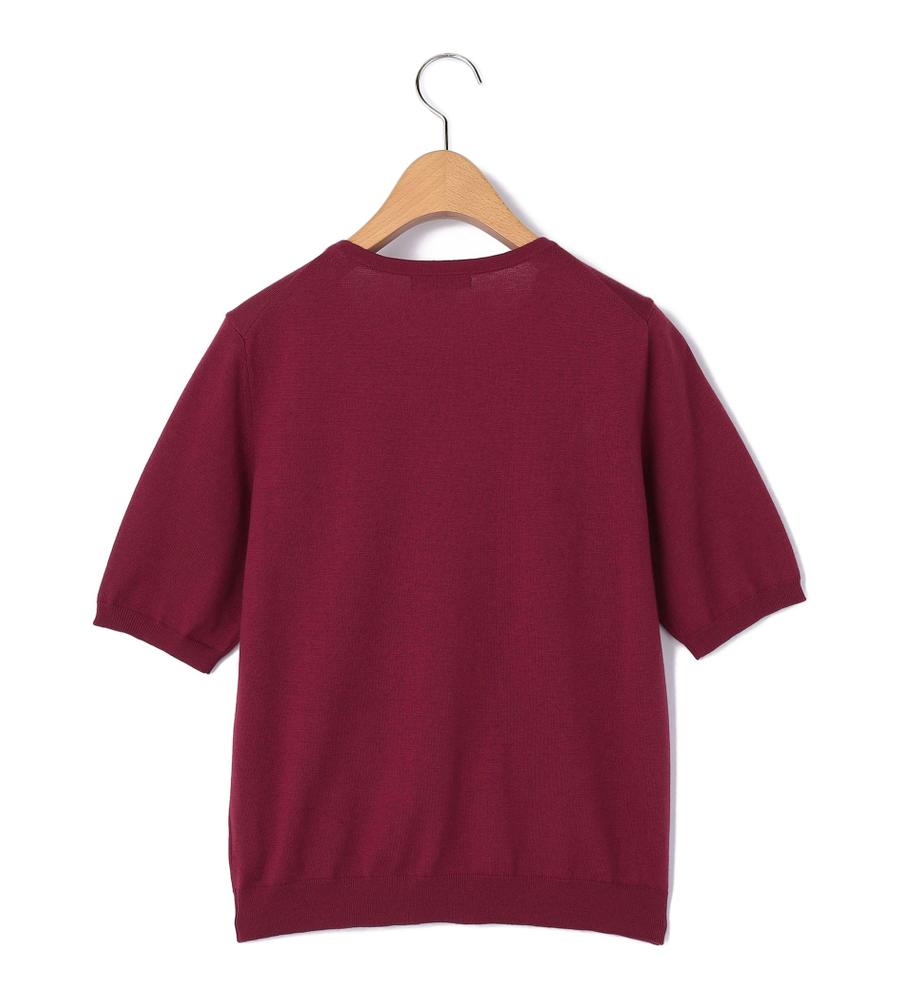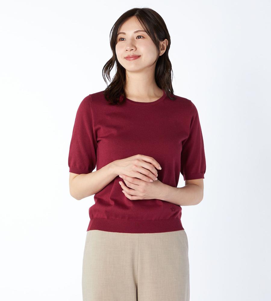 使い勝手が良いベーシックなデザインのニットプルオーバー。インナーとしても重宝する半袖です。左前裾にあしらったマークの刺繍がさりげないワンポイント。ハイゲージでなめらかな表面感に編み立てています。お揃いのカーディガンと合わせて統一感を出すと、お出かけコーディネートにもぴったりです。