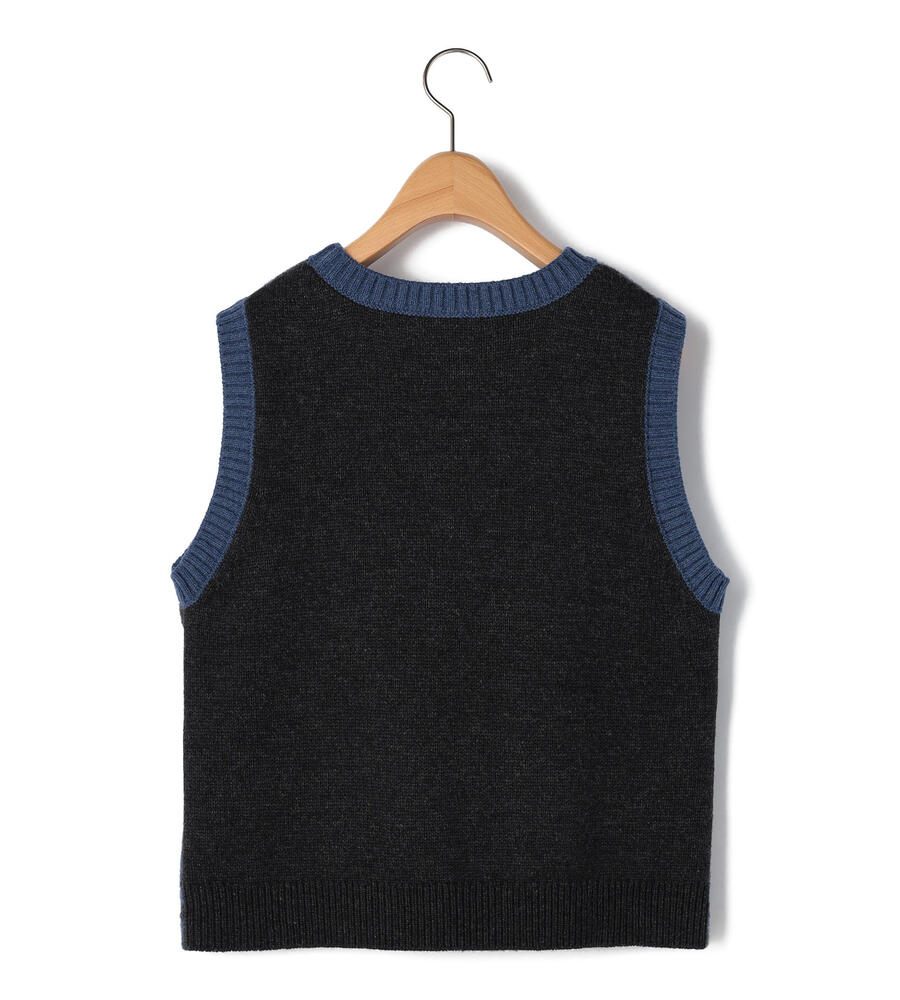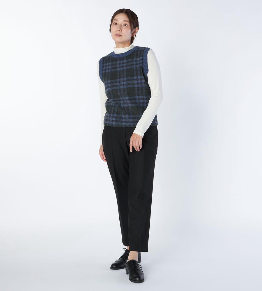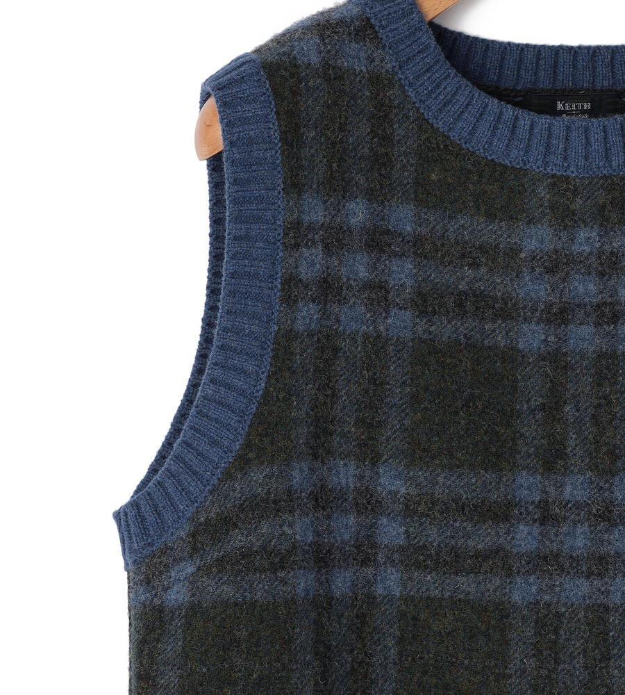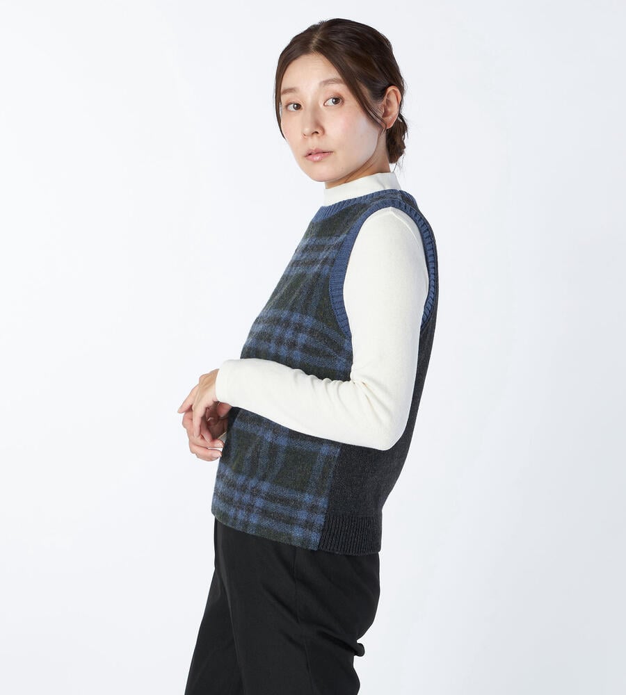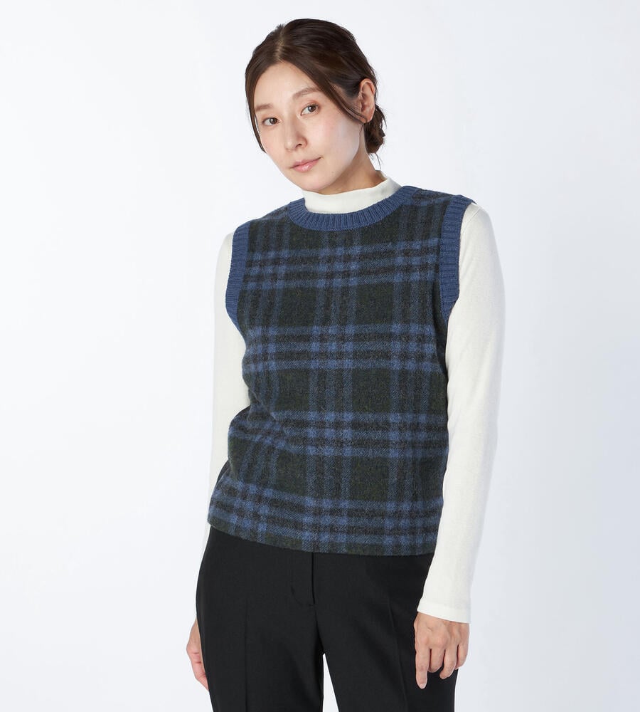 ブリティッシュウールを使用した、正統派の風格漂うニットベスト。クラシカルなチェック柄に包まれたベストは、コーディネートに秋冬らしい季節感をプラスします。着丈が短めで、インに合わせたトップスなどが映えるデザイン。背面は単色になっており、遊び心を効かせているのもポイントです。