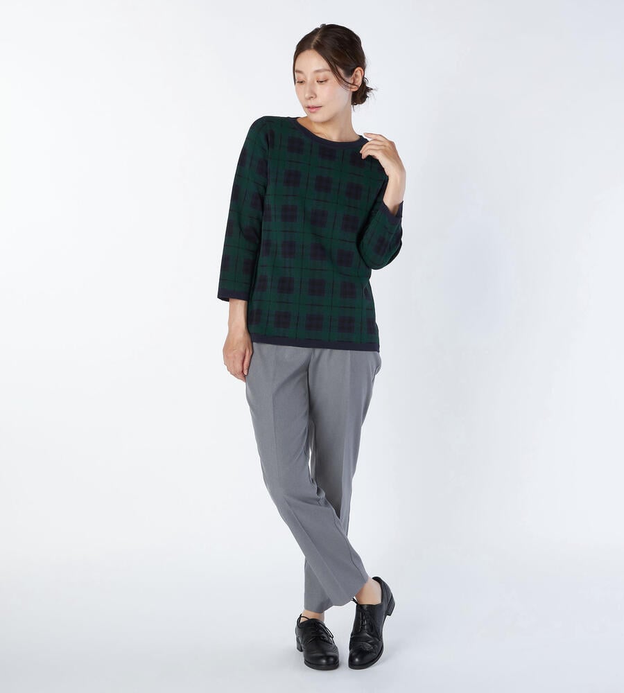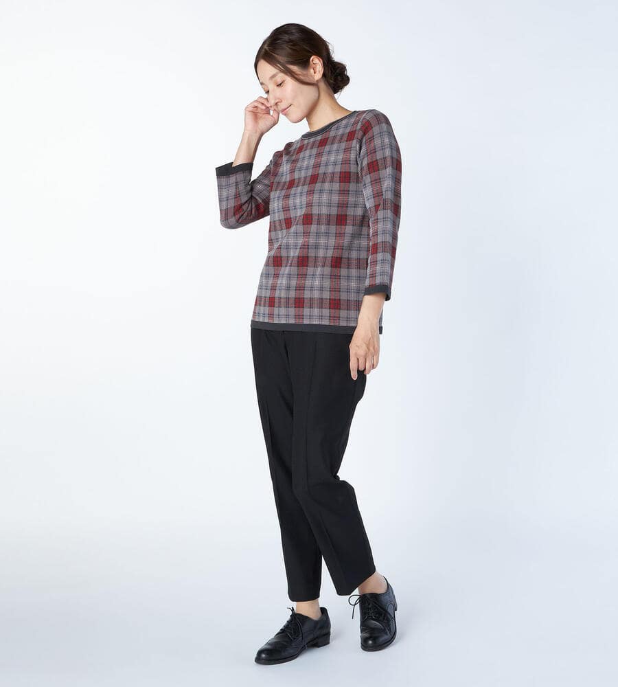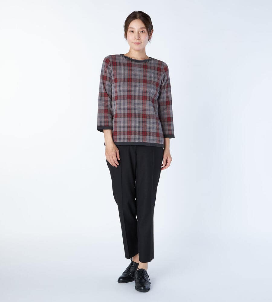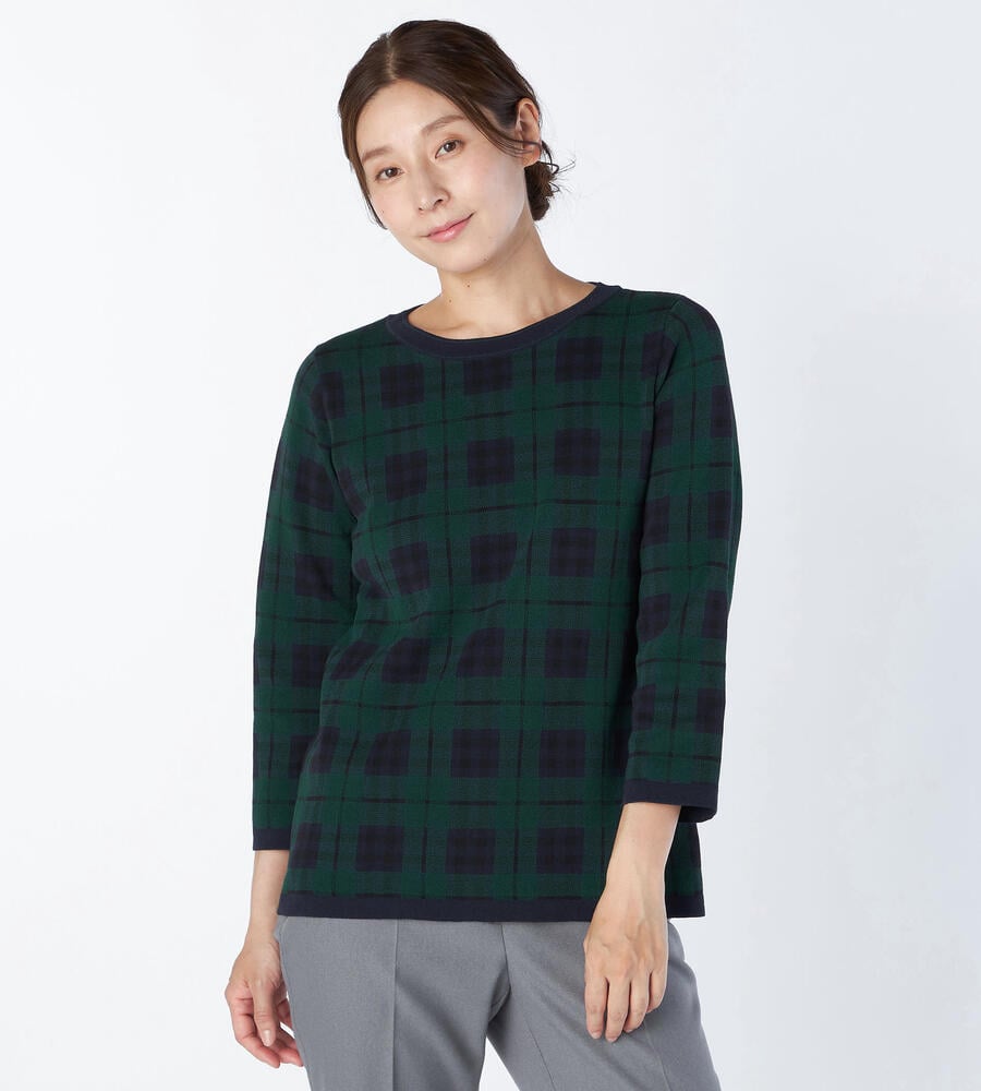 トラディショナルなチェック柄の7分袖ニットプルオーバー。襟ぐりや裾に配色をあしらうことで全体にメリハリを添えています。パンツともスカートともバランスよく着用でき、シンプルな無地ボトムを合わせるだけで印象的なコーディネートが楽しめる一着。滑らかさのある綿×ナイロン素材で肌触りも快適です。