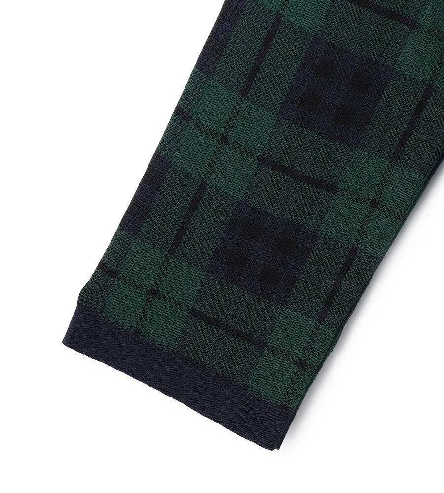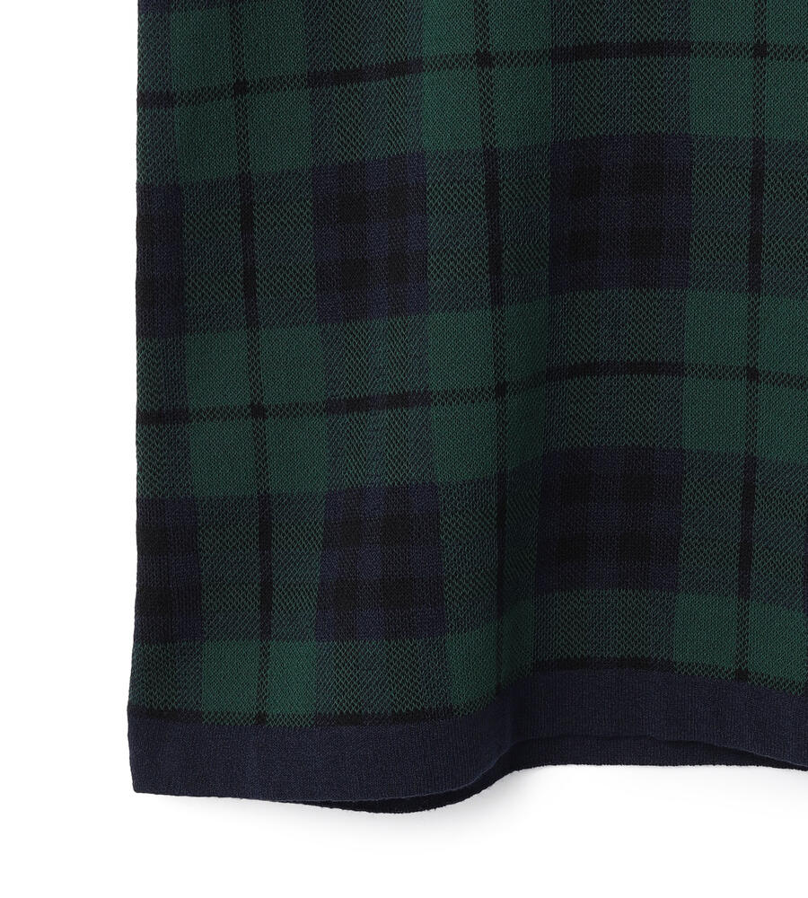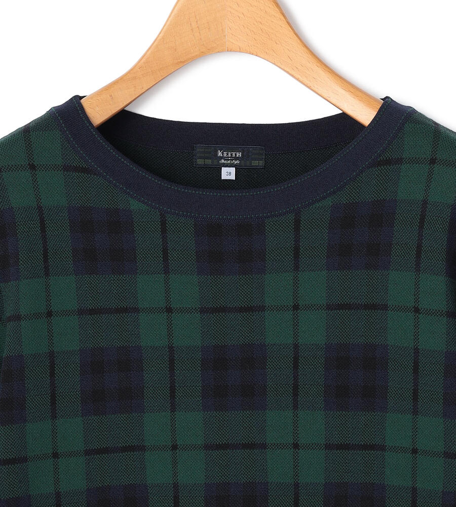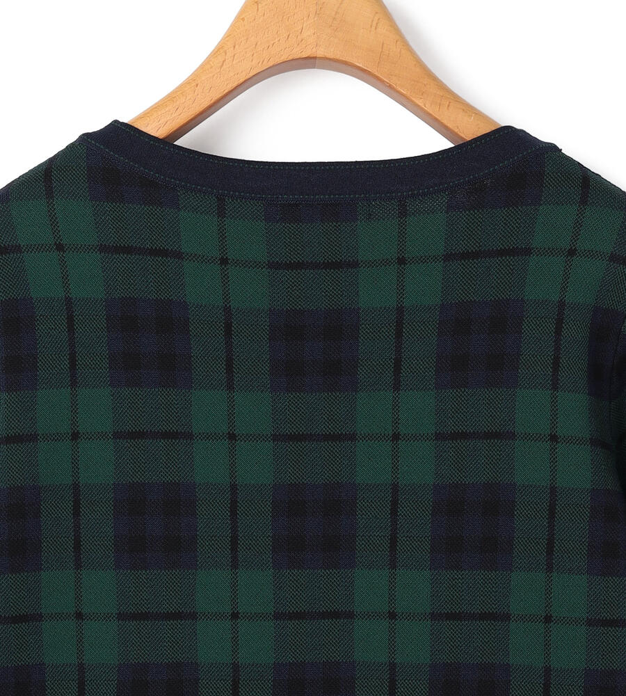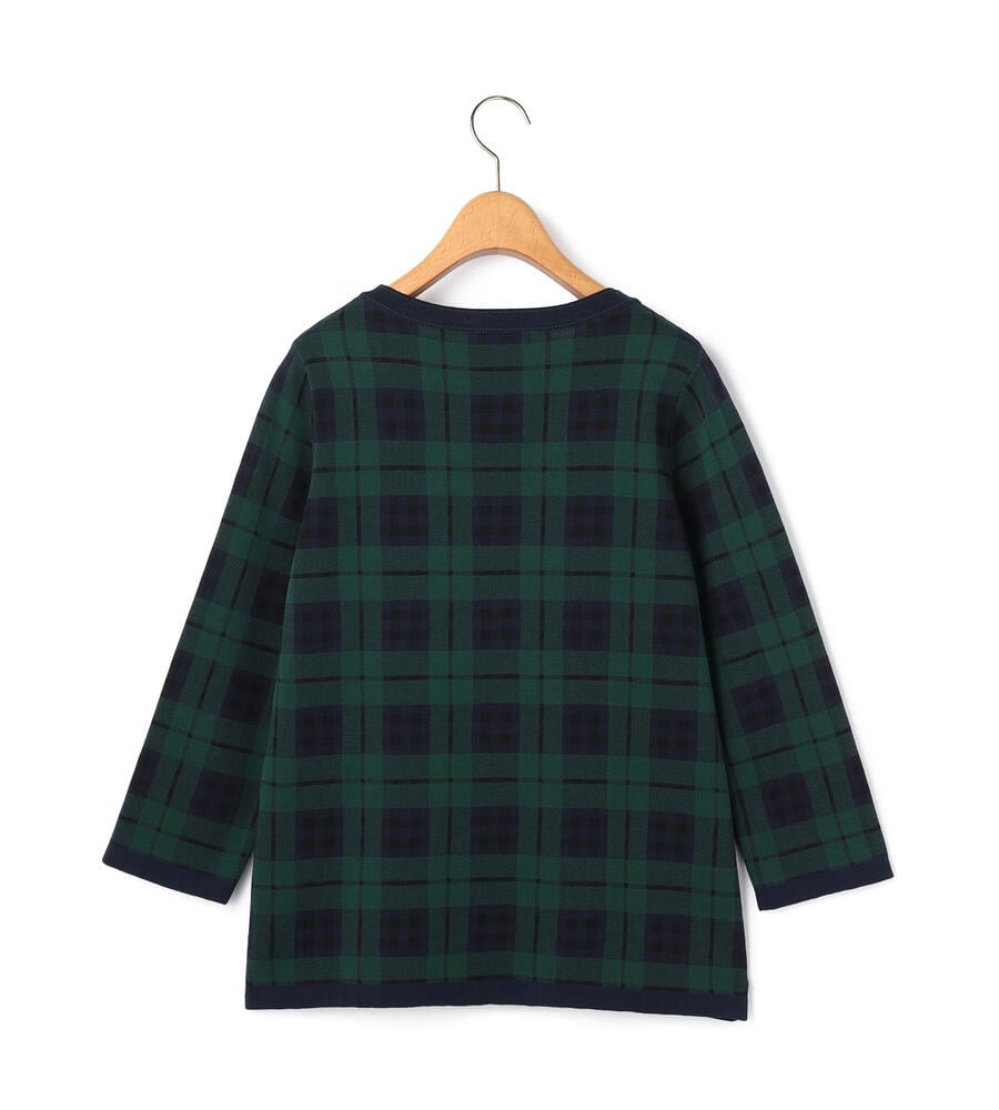 トラディショナルなチェック柄の7分袖ニットプルオーバー。襟ぐりや裾に配色をあしらうことで全体にメリハリを添えています。パンツともスカートともバランスよく着用でき、シンプルな無地ボトムを合わせるだけで印象的なコーディネートが楽しめる一着。滑らかさのある綿×ナイロン素材で肌触りも快適です。